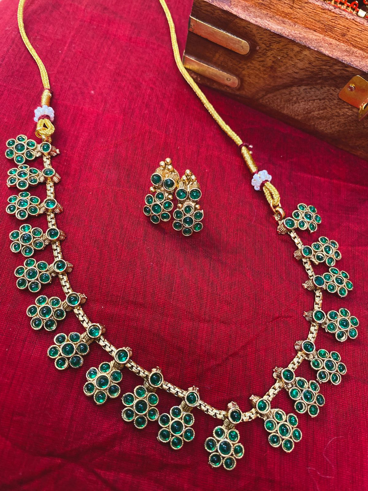 Step into tradition with this elegant Floral Cluster Necklace Set, featuring a series of petal-shaped green stone clusters arranged beautifully along a flexible antique gold-toned chain. Paired with matching earrings, this set captures the essence of ethnic beauty with a modern twist, perfect for festive occasions and traditional attire. Crafted with fine detailing and vibrant green stones, this set adds a bold yet graceful touch to sarees, lehengas, and salwar suits.