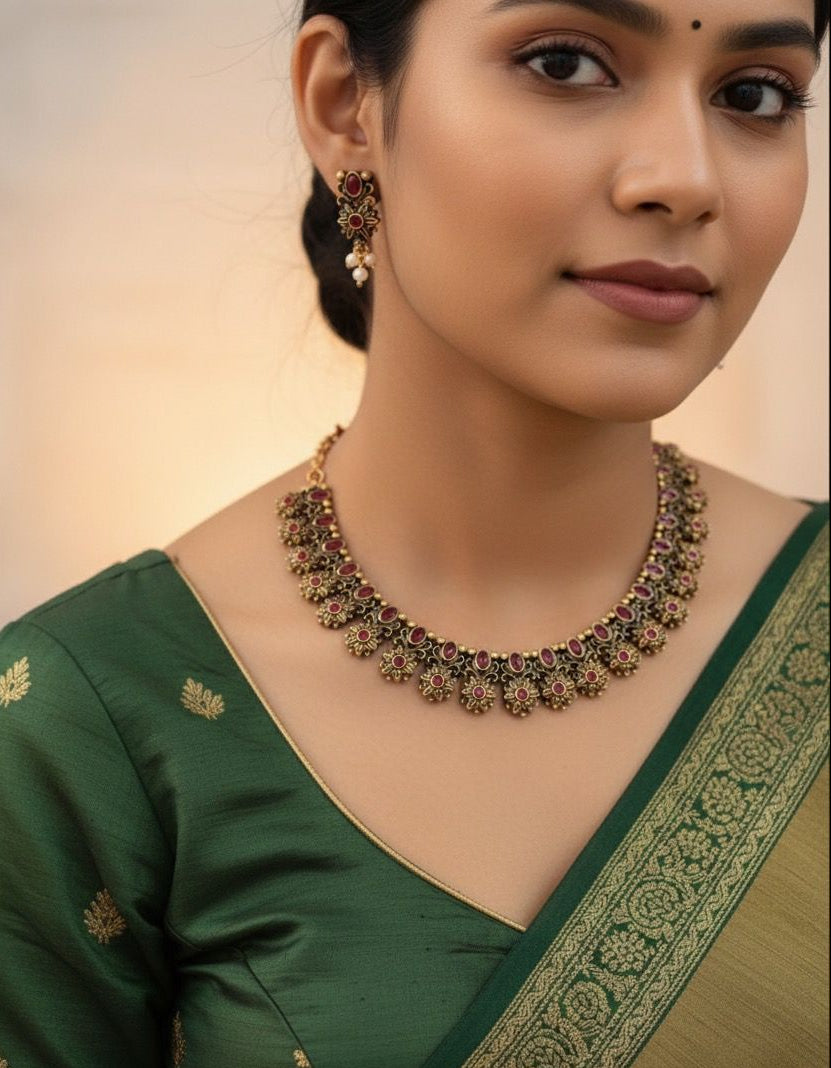 Elevate your traditional look with this beautifully handcrafted antique floral necklace set. The necklace showcases a symmetrical pattern of floral motifs embedded with deep ruby red stones, reflecting vintage elegance. The earrings match the floral design perfectly, completing the classic ensemble for festive or ceremonial wear.