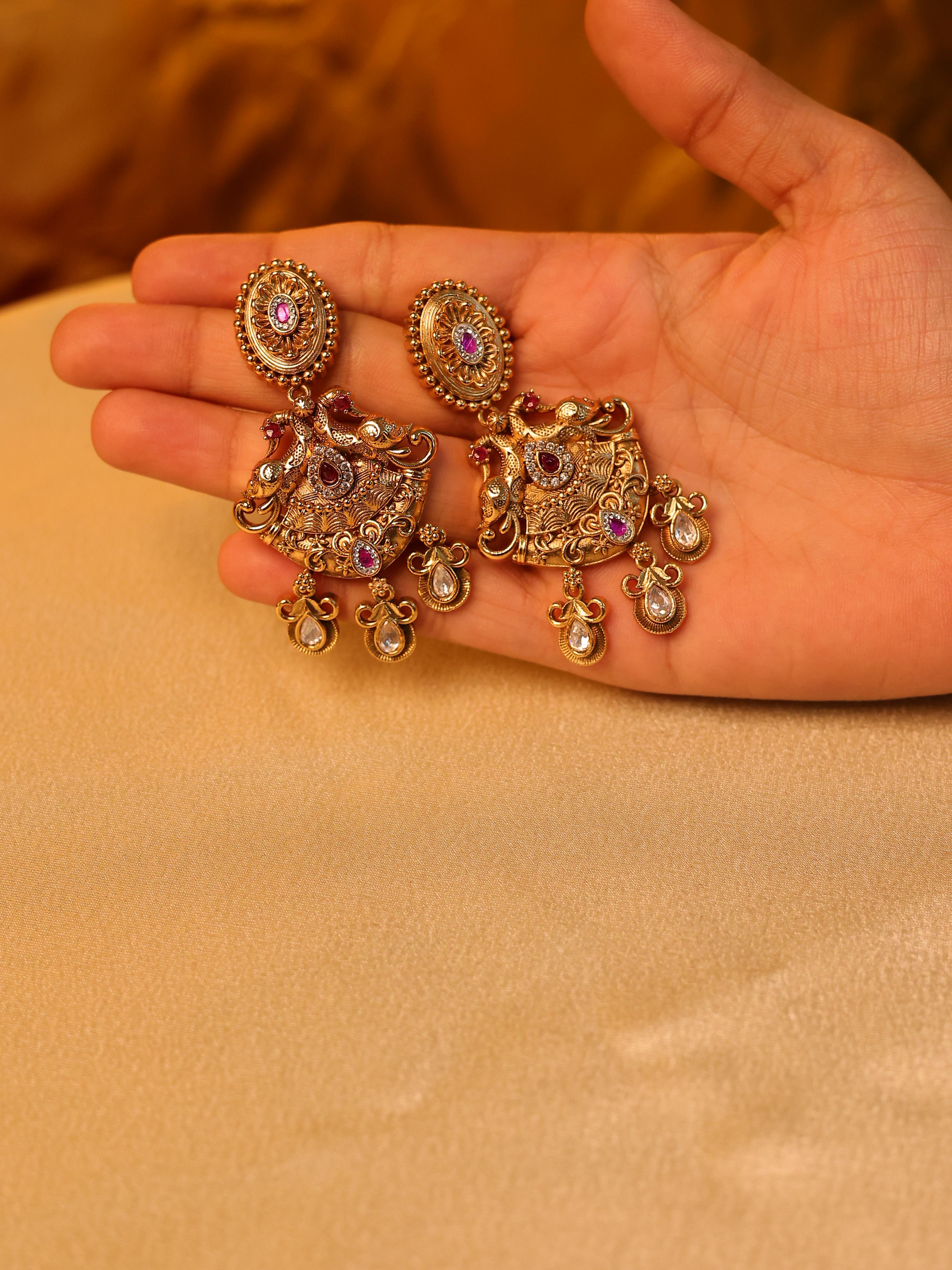 Add a royal touch to your traditional look with these Antique Gold-Plated Temple Style Earrings, a beautiful blend of heritage-inspired design and contemporary craftsmanship. These earrings showcase intricate detailing, highlighted with ruby-red stones and tiny kundan-like embellishments, making them ideal for festive and bridal occasions. Slightly vary from the original product due to lighting/ camera lens and website image compression