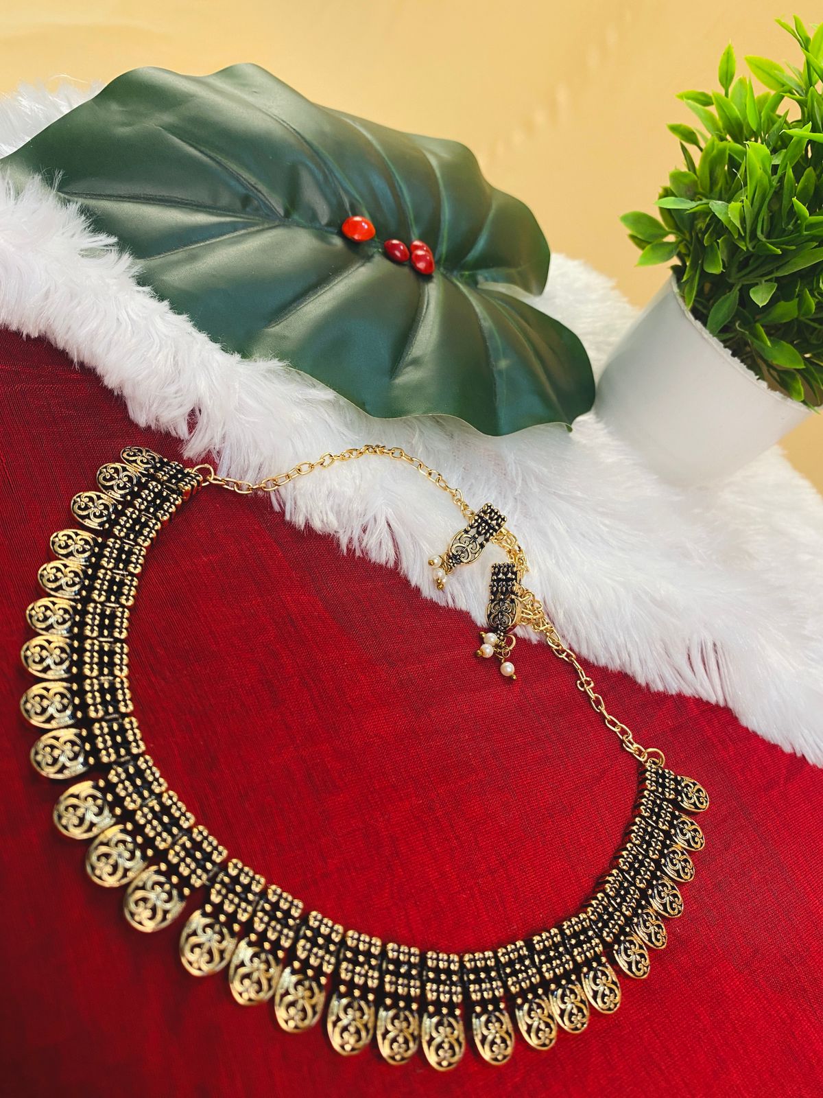 Add a royal touch to your ethnic wear with this Antique Matte Black Filigree Necklace Set. Featuring a unique oxidized finish and intricate engraved floral drops, this necklace exudes vintage elegance. Comes with a matching pair of jhumka-style earrings adorned with delicate pearls.