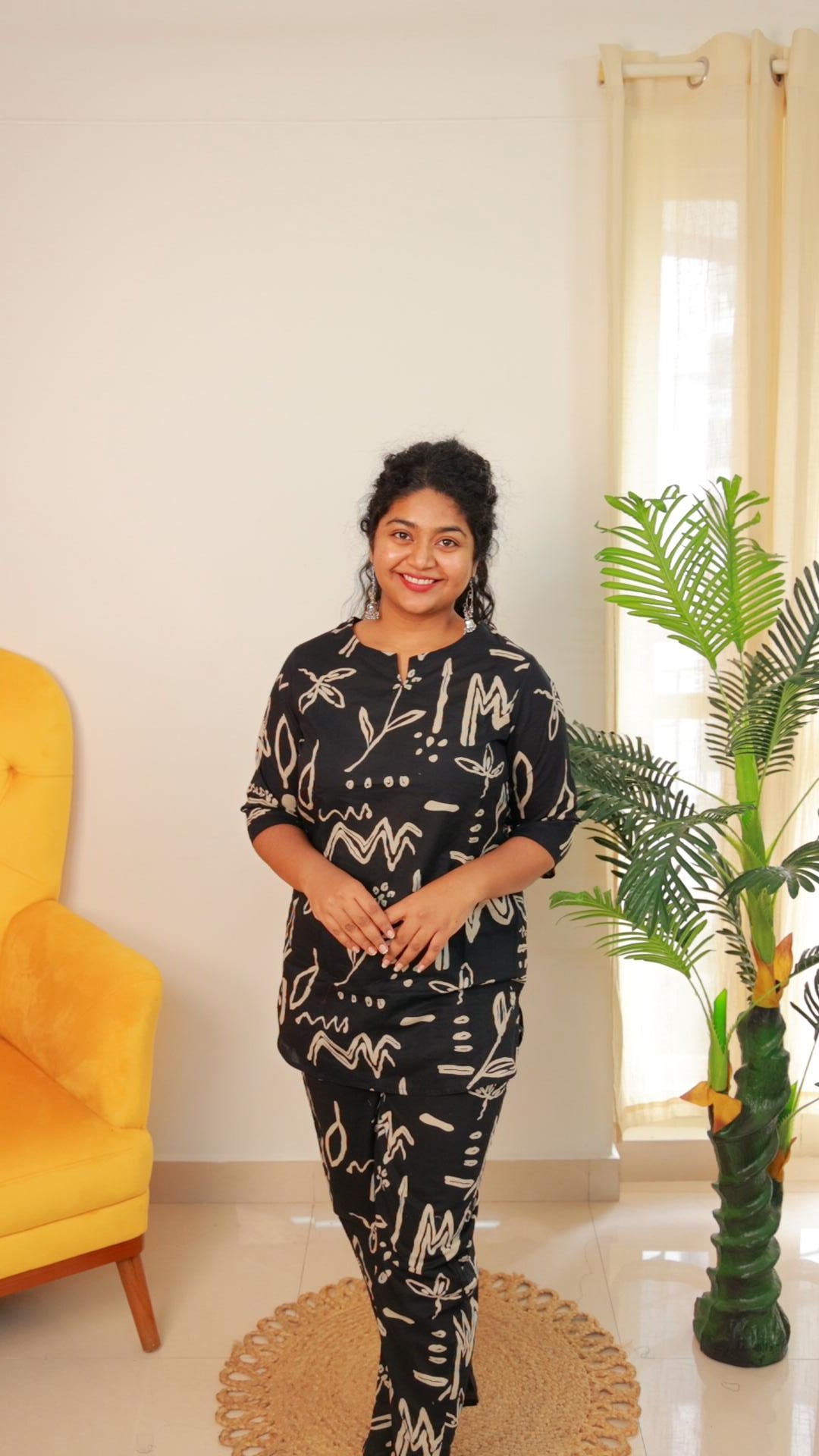 Add a bold and artistic touch to your everyday wardrobe with this 2-piece Black chic Co-ord set featuring an eye-catching abstract print in white on deep black. Designed for comfort and effortless style, it's perfect for casual wear with a modern twist.