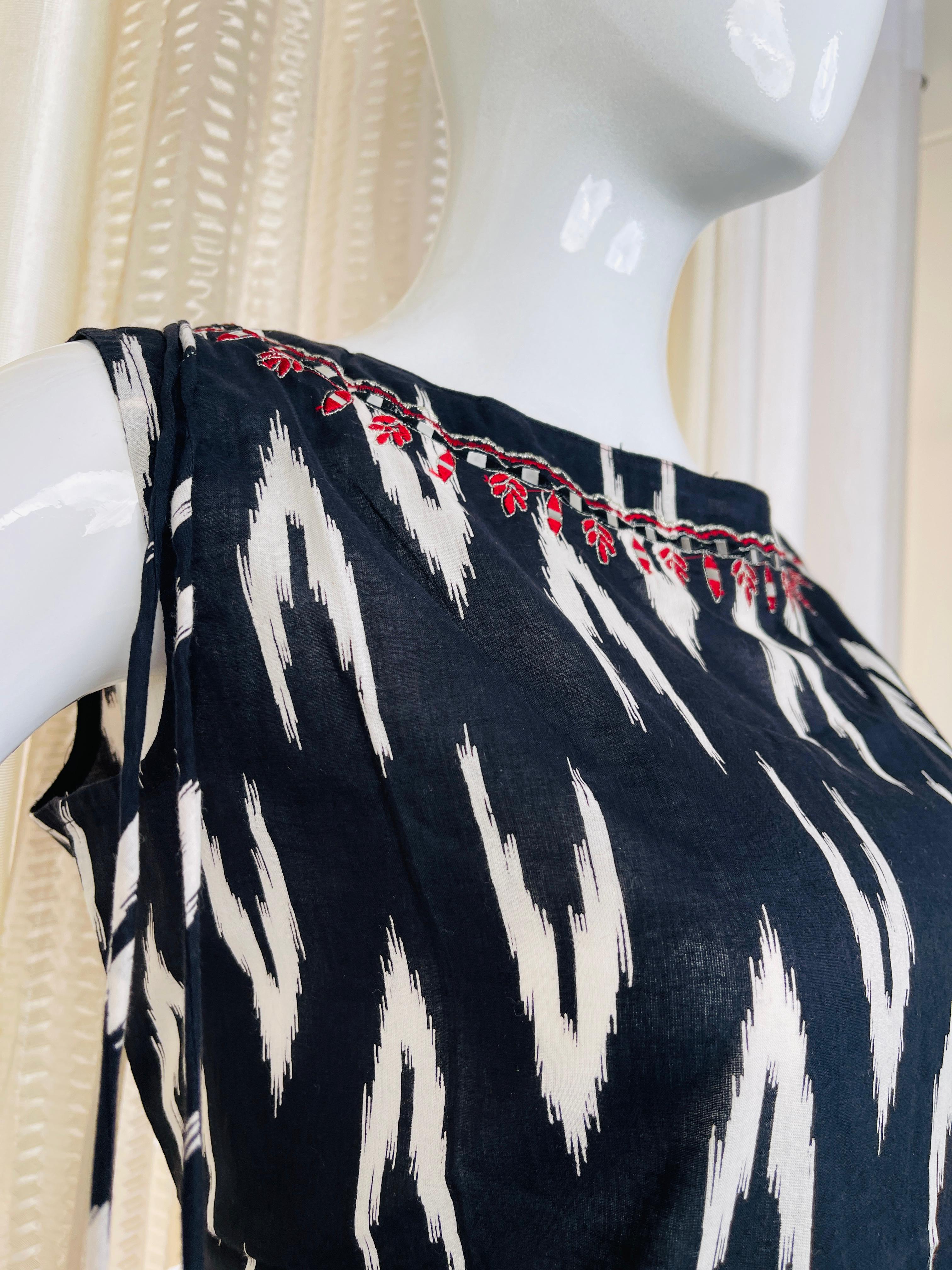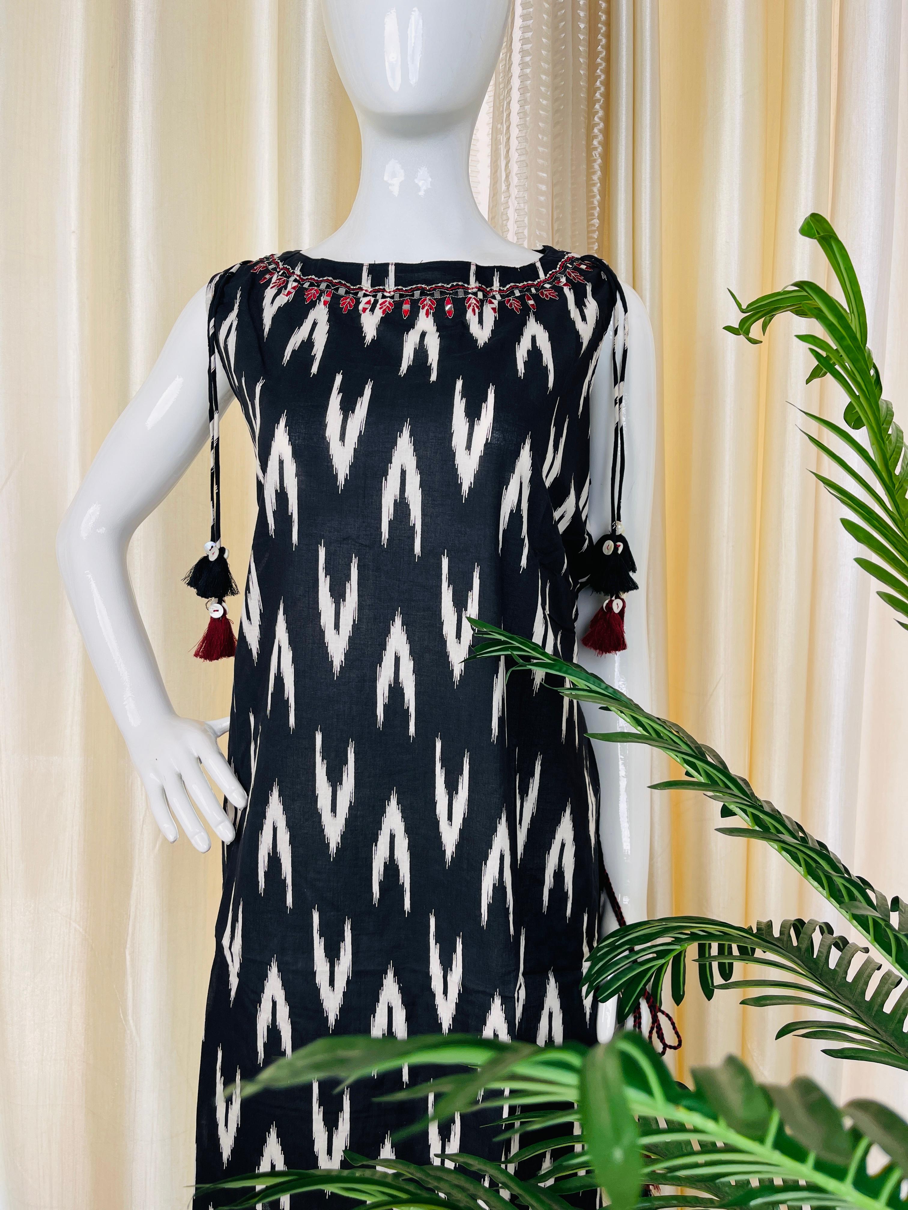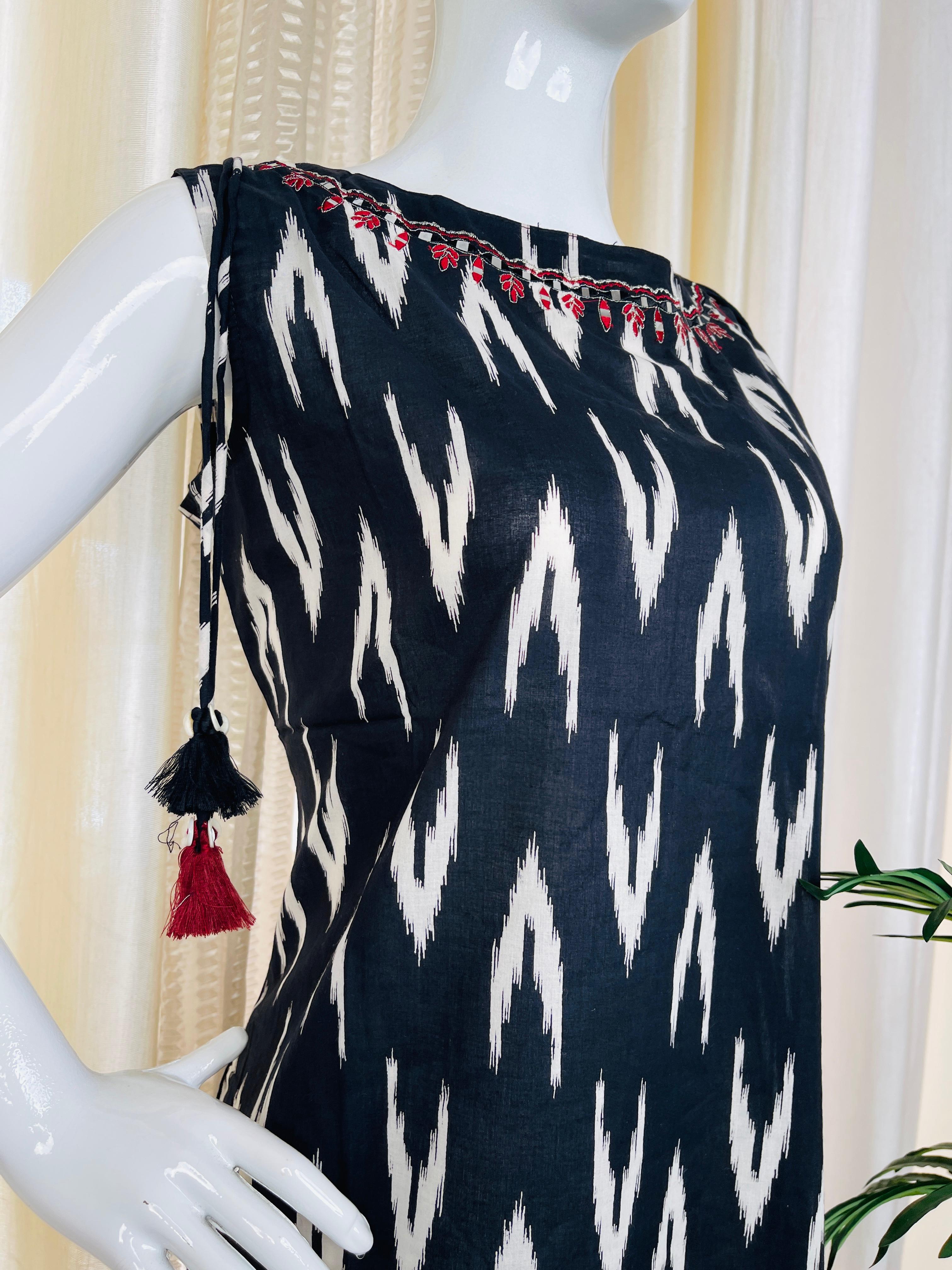 Pure handloom A-Line kurta. Rich black body with Red Motifs embroidery. Features a boat neck, a stunning yoke from Ikat of Pasapali pattern, a tie-up tassel at the waist, and Ikat detailing at the sleeves. Color: Black, Red. Material: Pure Cotton.