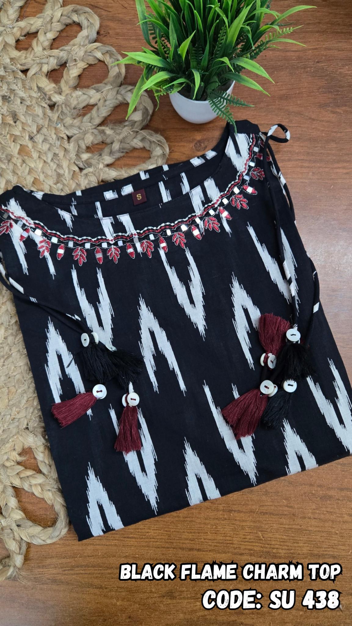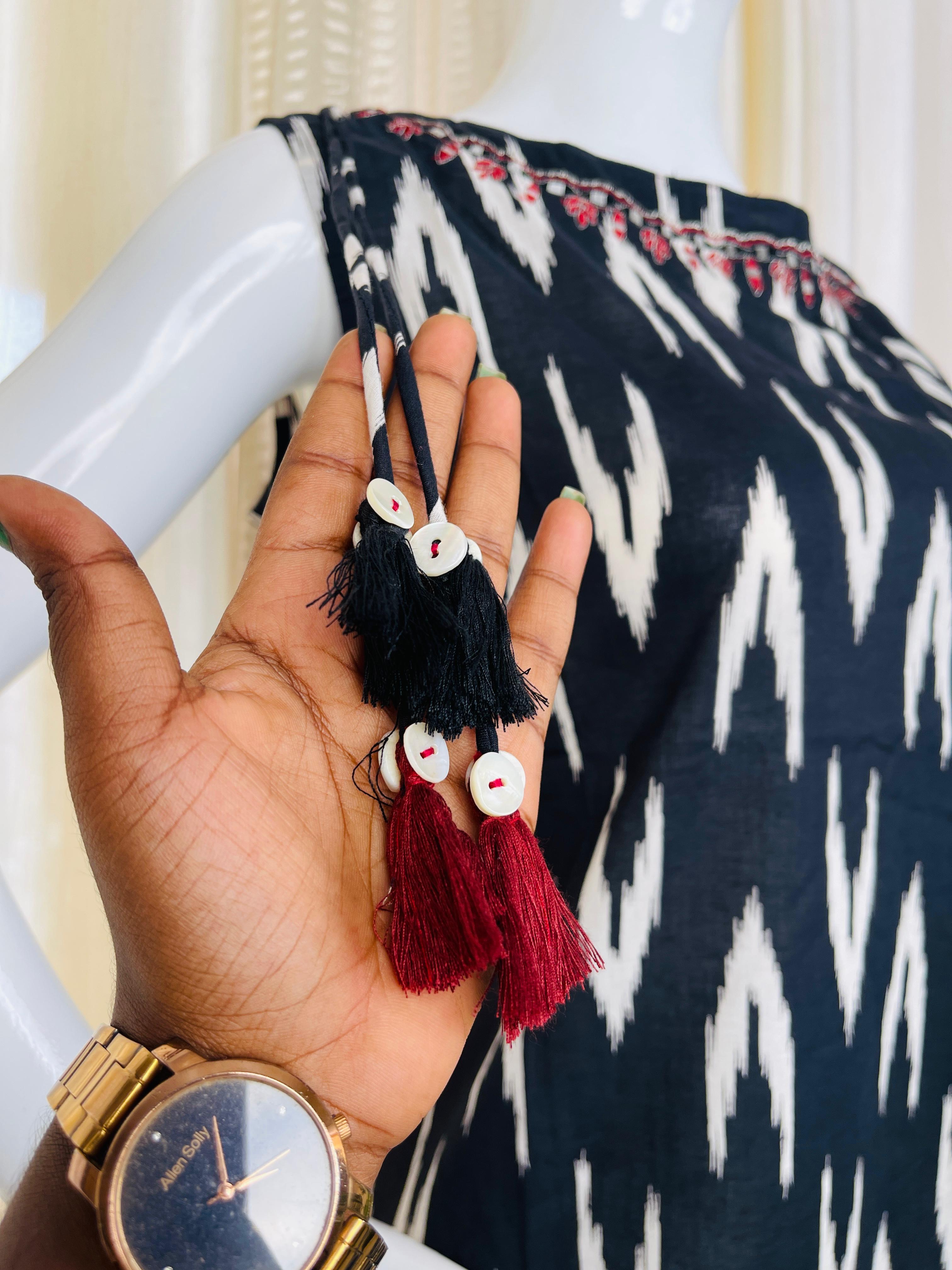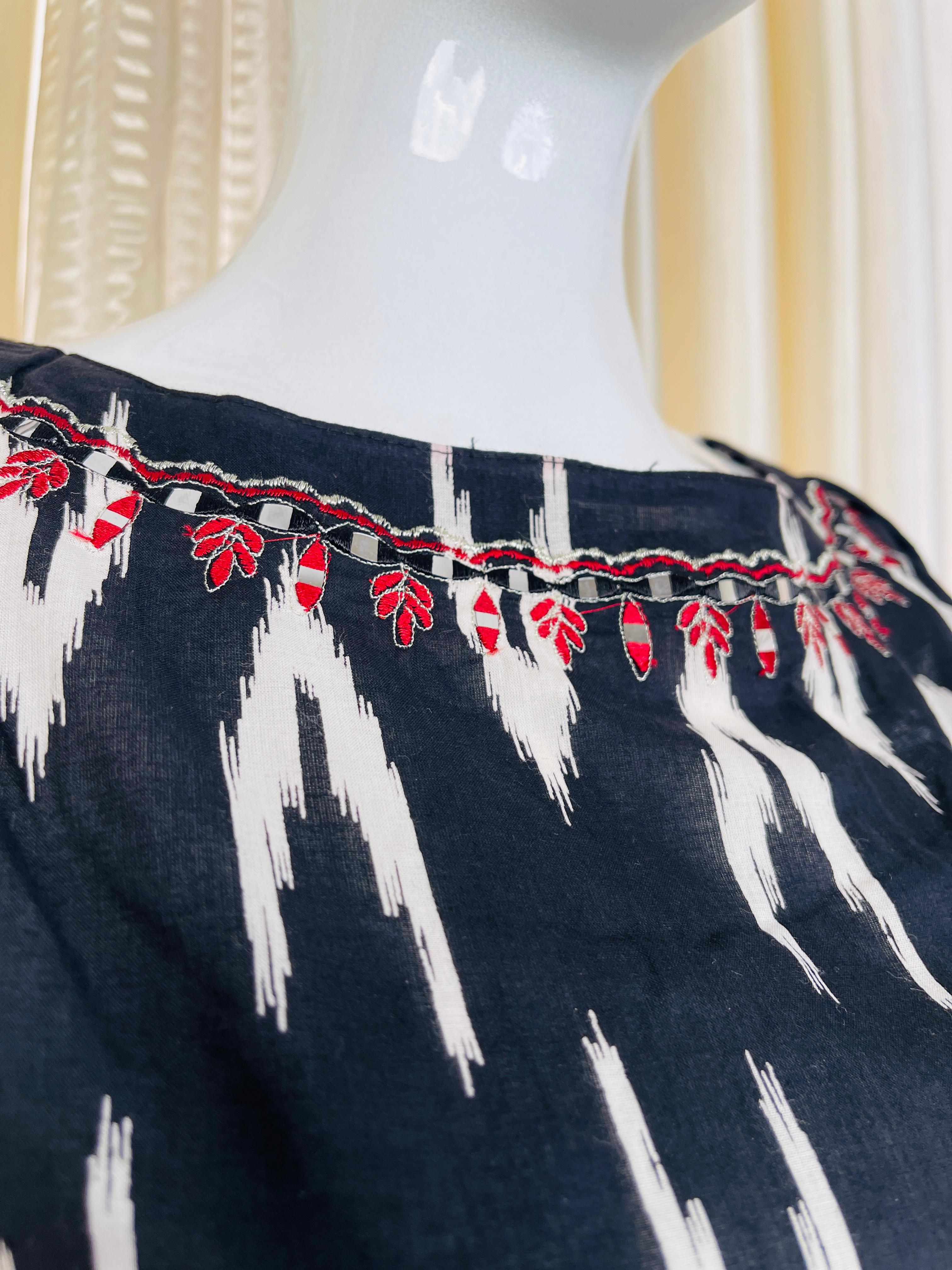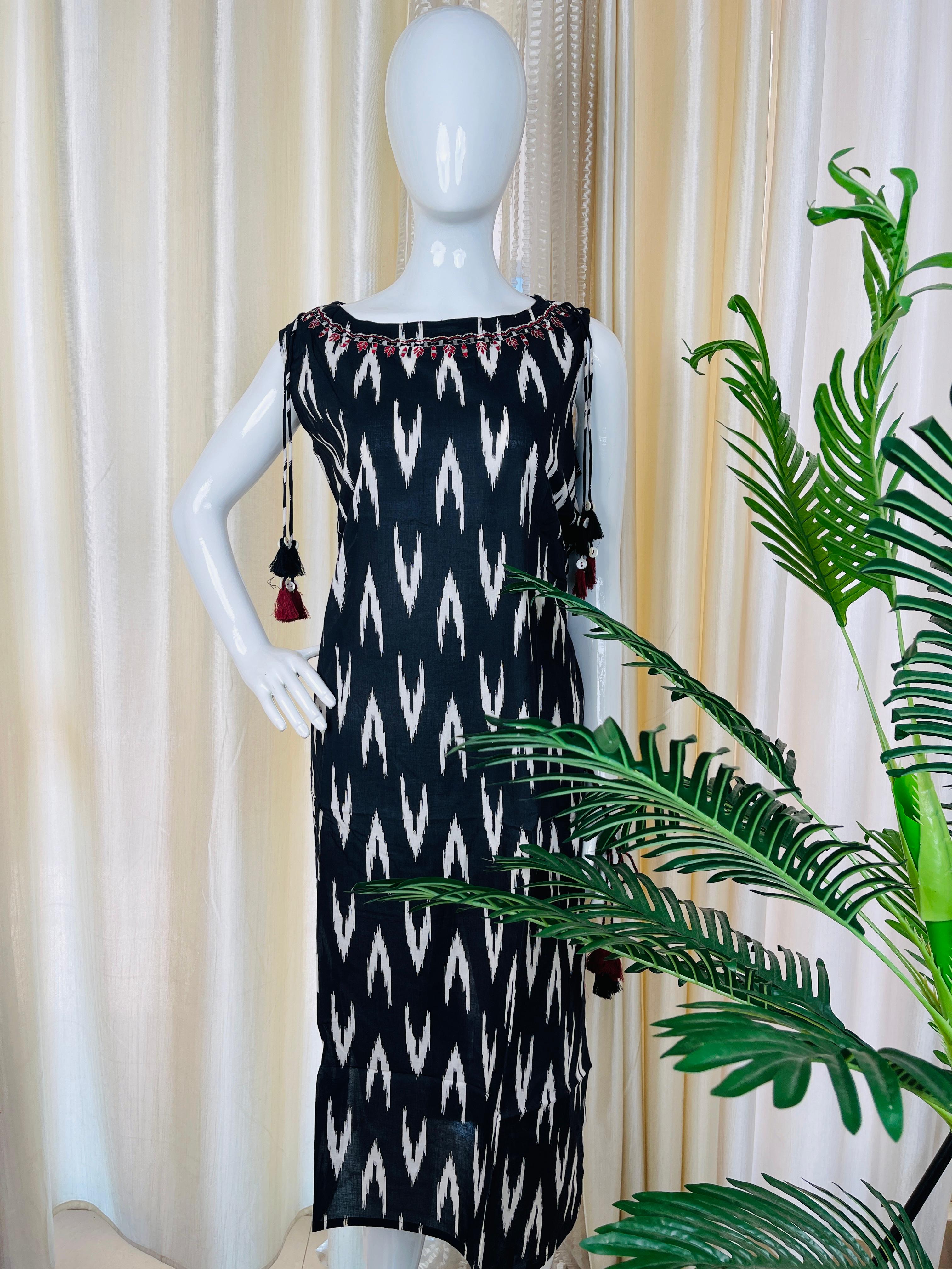 Pure handloom A-Line kurta. Rich black body with Red Motifs embroidery. Features a boat neck, a stunning yoke from Ikat of Pasapali pattern, a tie-up tassel at the waist, and Ikat detailing at the sleeves. Color: Black, Red. Material: Pure Cotton.
