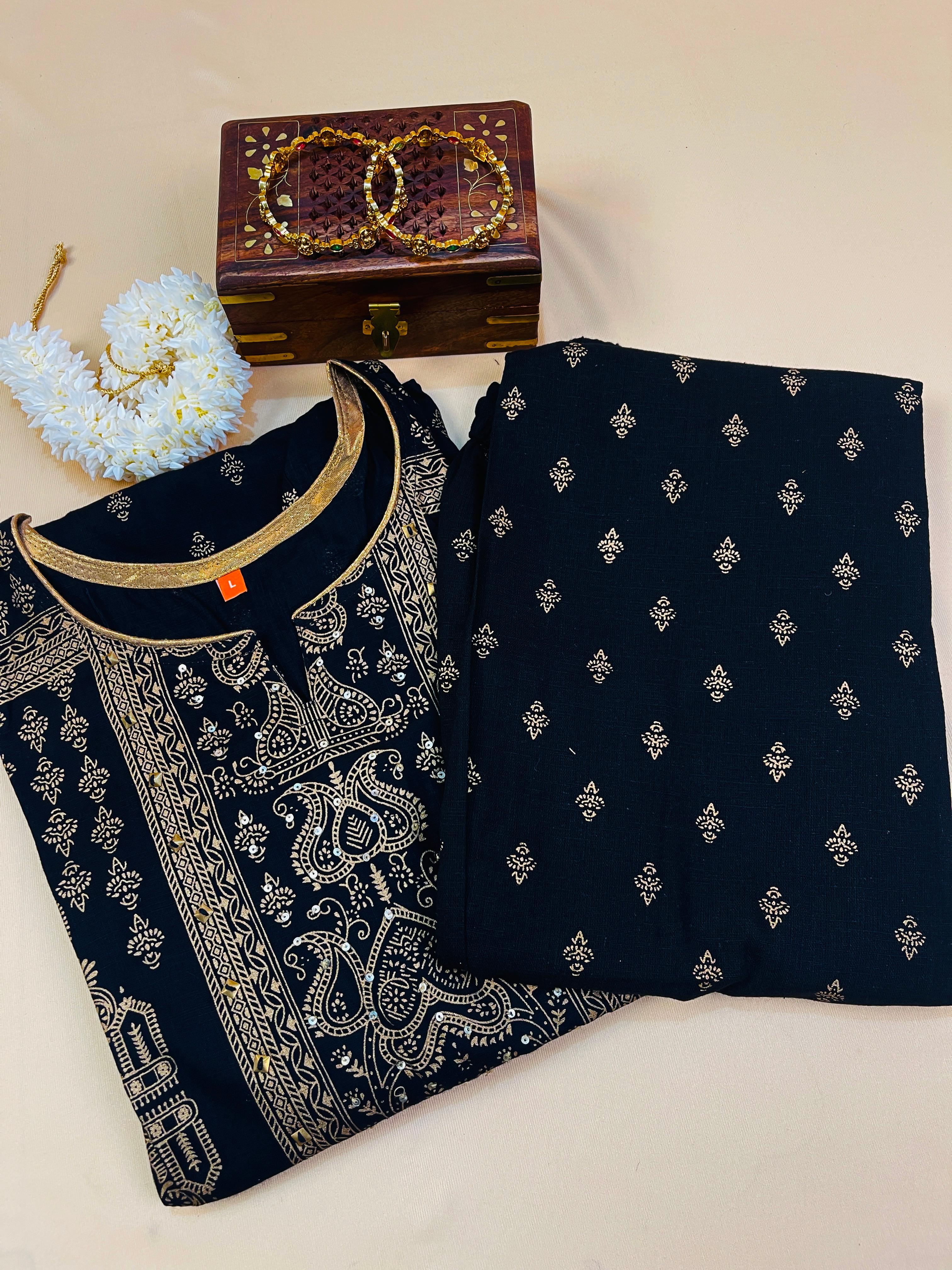 Accompanied by a coordinated black printed bottom, this set is an ideal pick for festive events, traditional gatherings, or elegant daily wear.