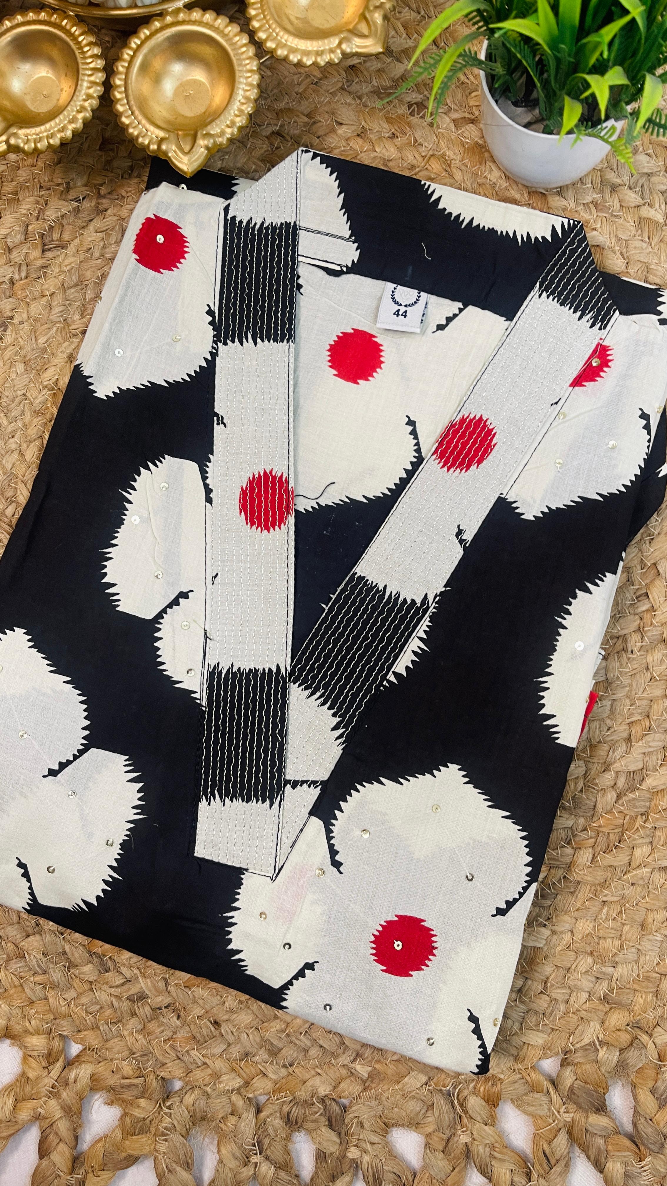 This Kurti made from lightweight and breathable cotton, perfect for warm seasons or casual loungewear. The garment features a striking black background adorned with bold white abstract flowers, each with a vivid red center. The flower edges are styled with a jagged, modern design, lending a contemporary touch to the classic look. Small white dots add subtle sparkle throughout the fabric.