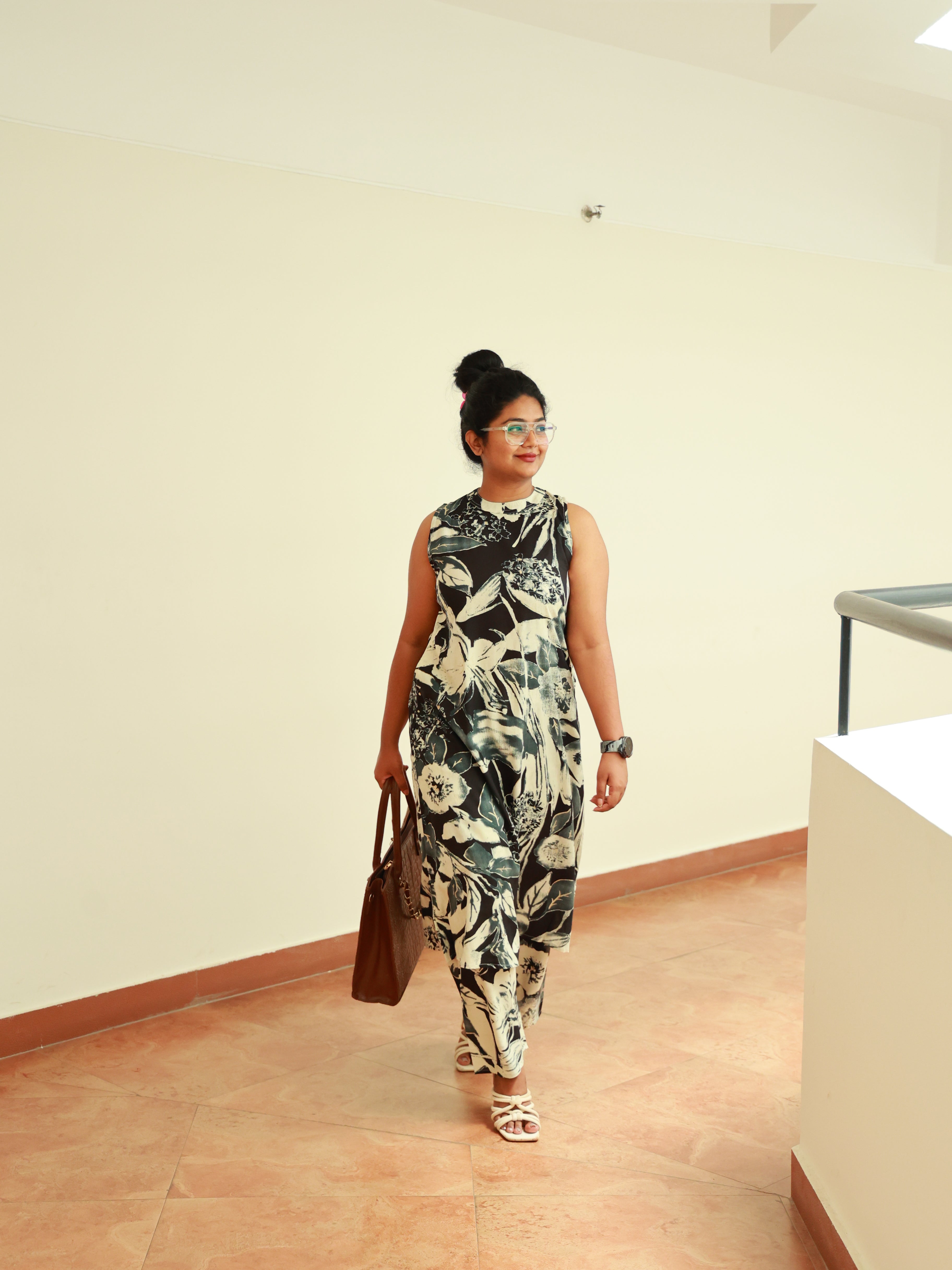 Step into effortless elegance with this black and white abstract floral printed co-ord set. Crafted from soft, breathable fabric, this sleeveless kurta features a high round neckline and a straight silhouette that flatters every body type. The matching ankle-length pants add a modern edge, making it perfect for both casual outings and semi-formal occasions.
