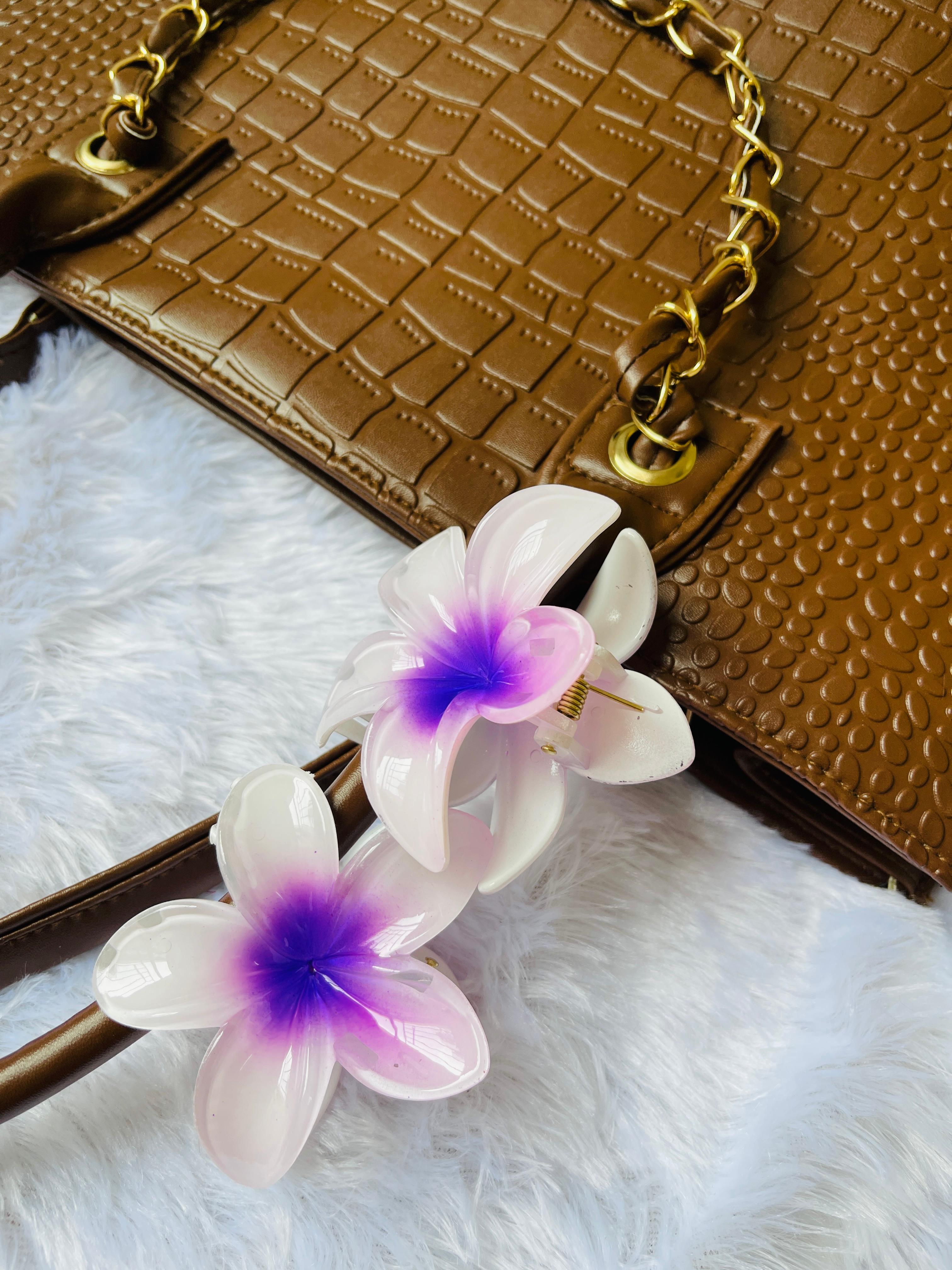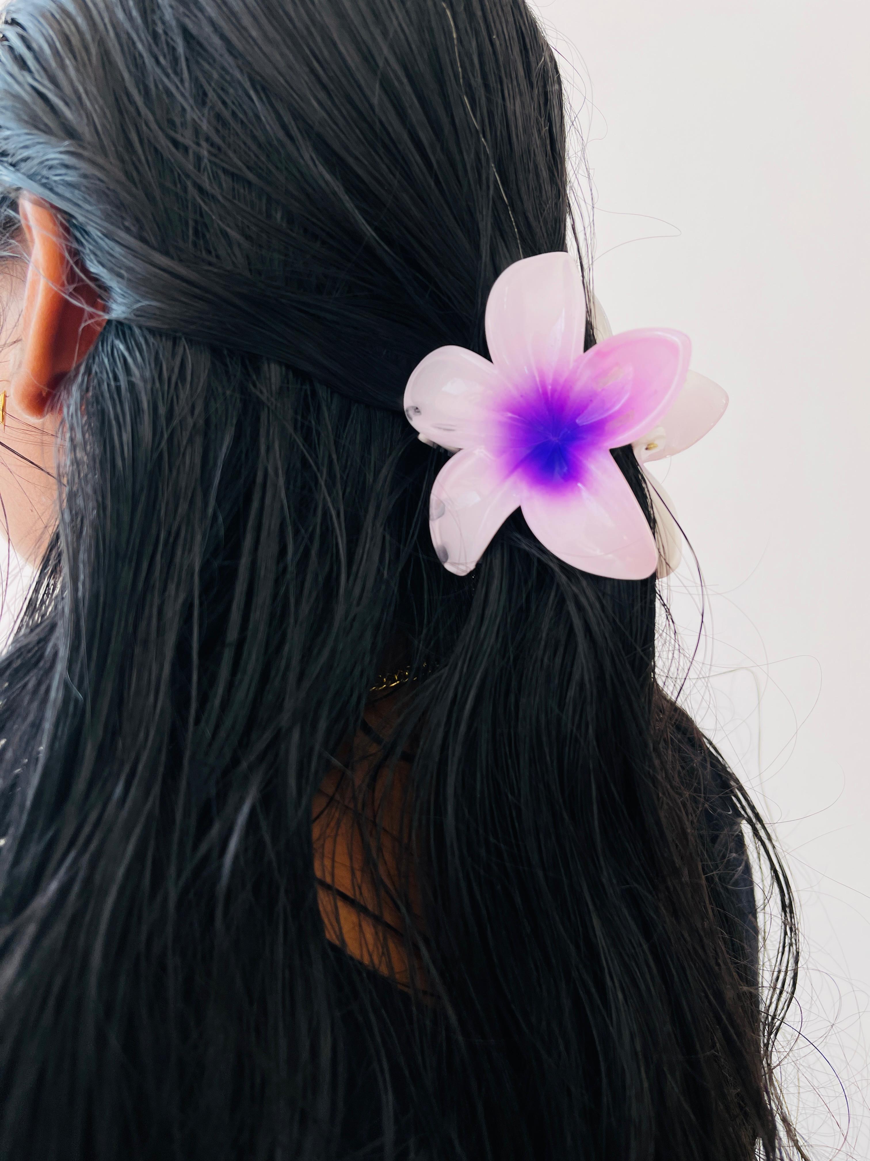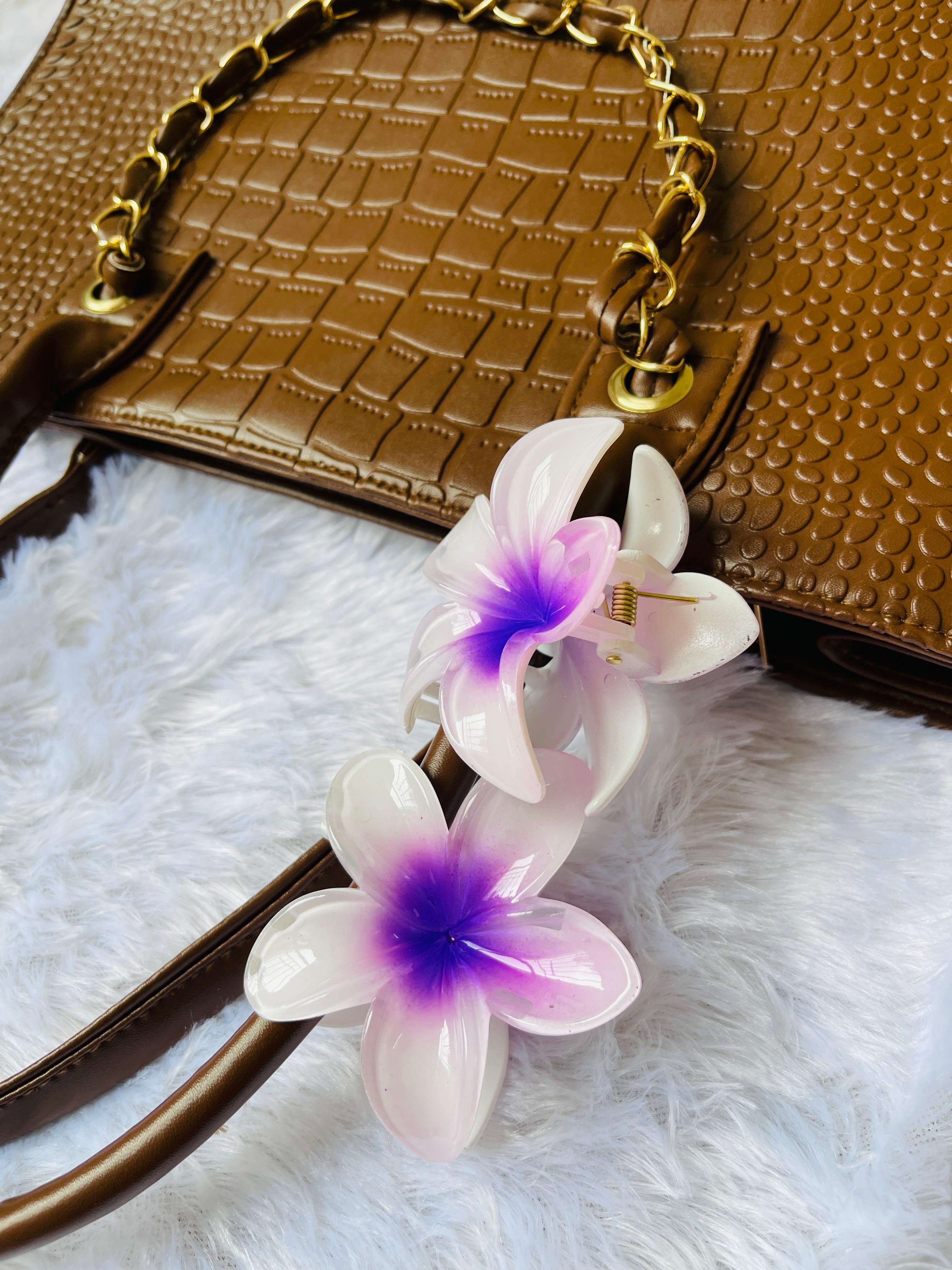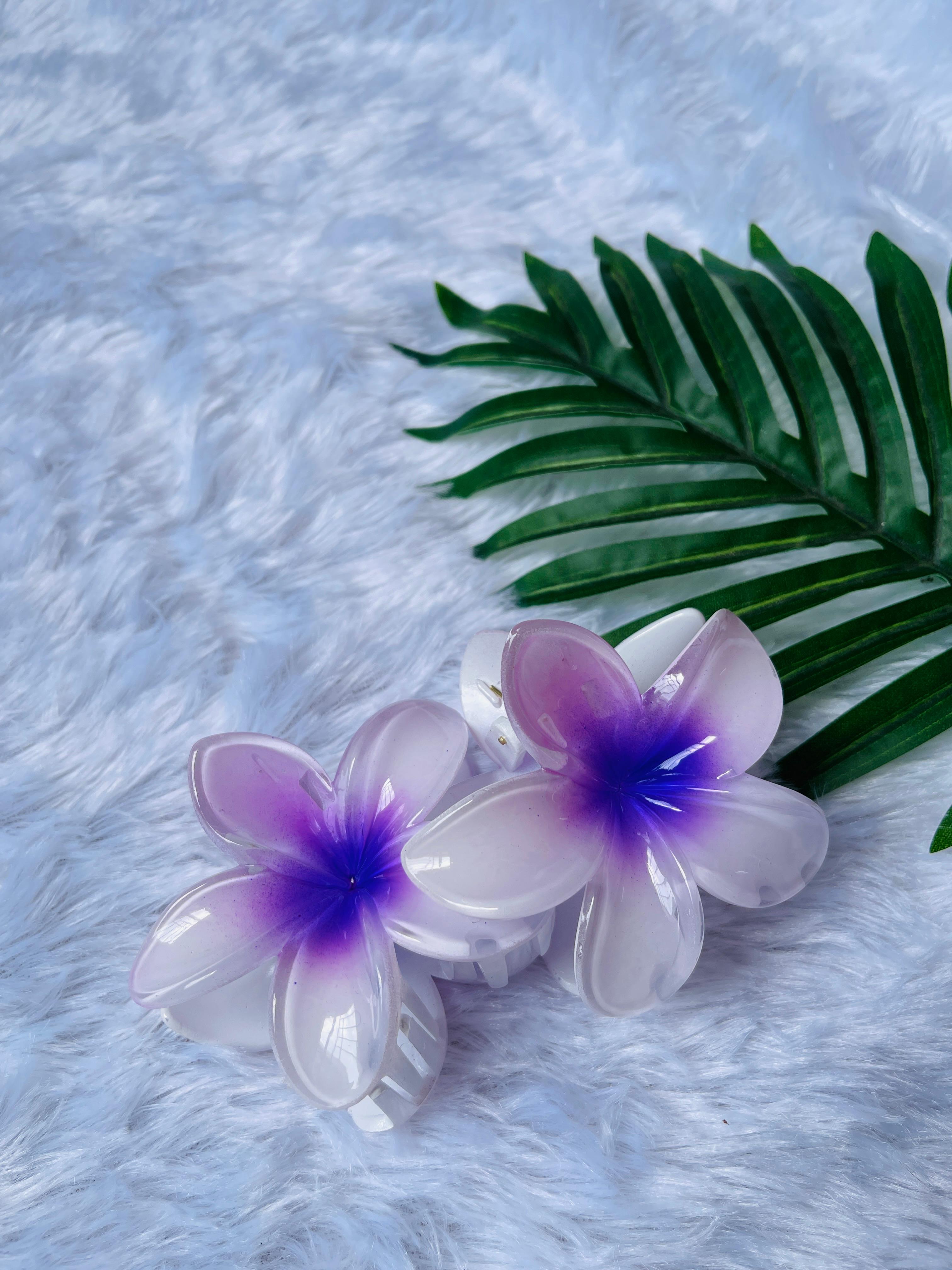 he Large Glossy Purple Ombre Plumeria Flower Hair Claw Clip offers a unique and elegant twist on the tropical flower. Crafted from transparent acrylic or resin, the petals are a soft clear white/lilac color, graduating into a dramatic, intense deep purple/violet at the center of the bloom.