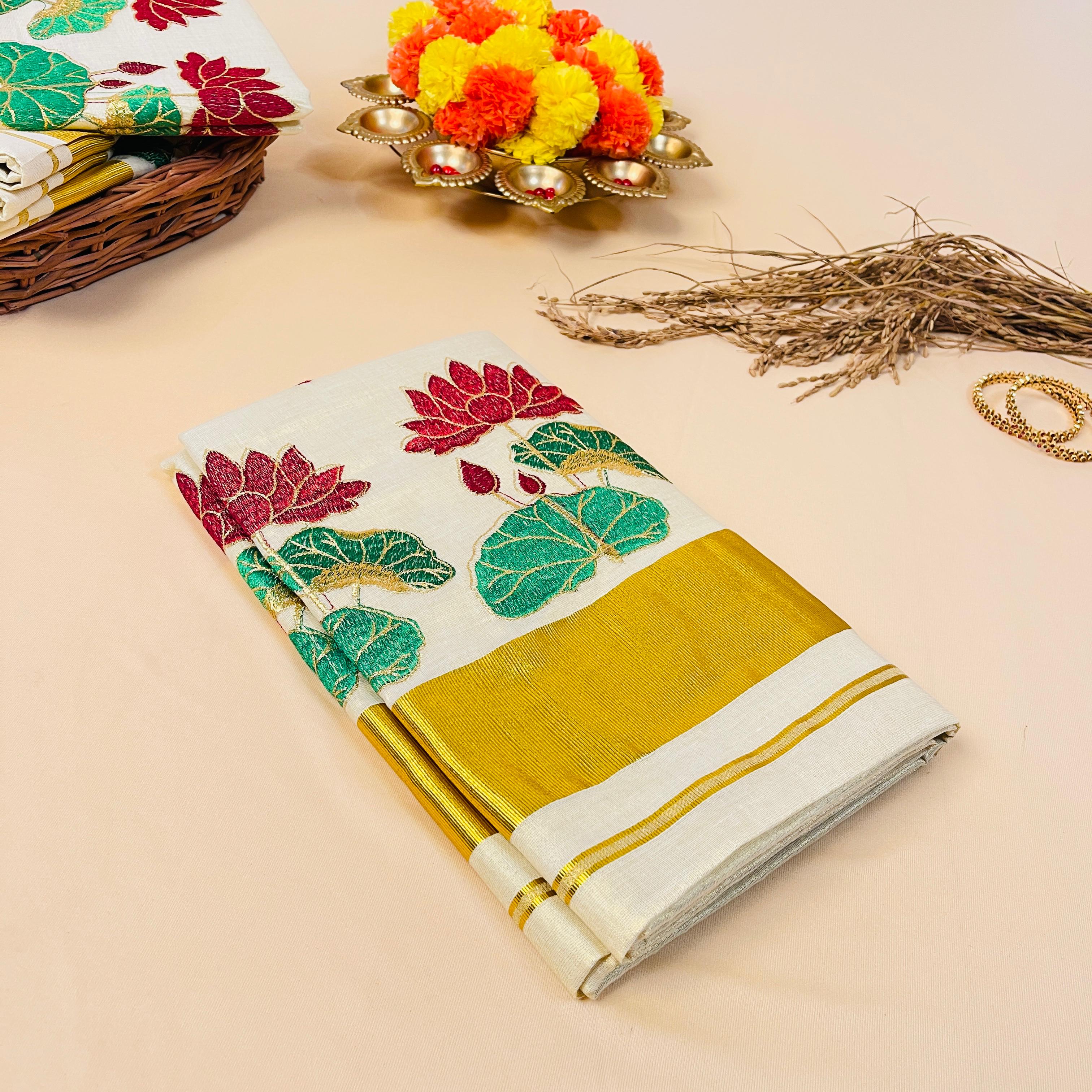Golden Tissue set saree with maroon lotus and green lotus leaves. Saree comes with Elegant Golden zari border. Saree length - 6.25mtrs. This set saree is perfect for Temple date, onam, Traditional and festive wear
