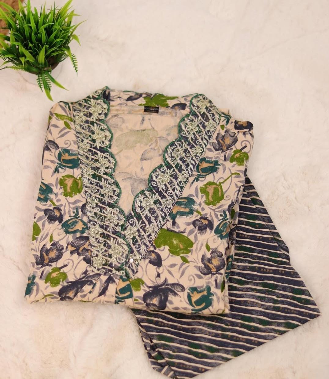 A comfortable and stylish two-piece women's ethnic set featuring a straight-fit, calf-length kurta on a cream or light beige base. The kurta is adorned with a vibrant, all-over floral print in multi-colors. It is detailed with a flattering V-neckline finished with delicate lace or subtle embroidery. The kurta is paired with contrasting trousers/pants that feature a bold vertical striped pattern. The overall look is perfect for a chic and relaxed casual or semi-formal day out.