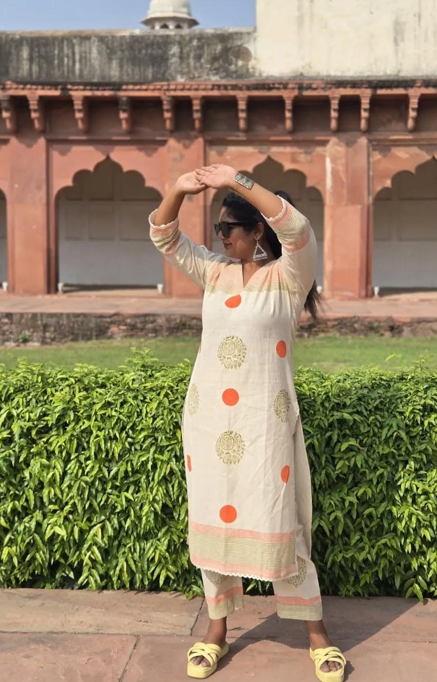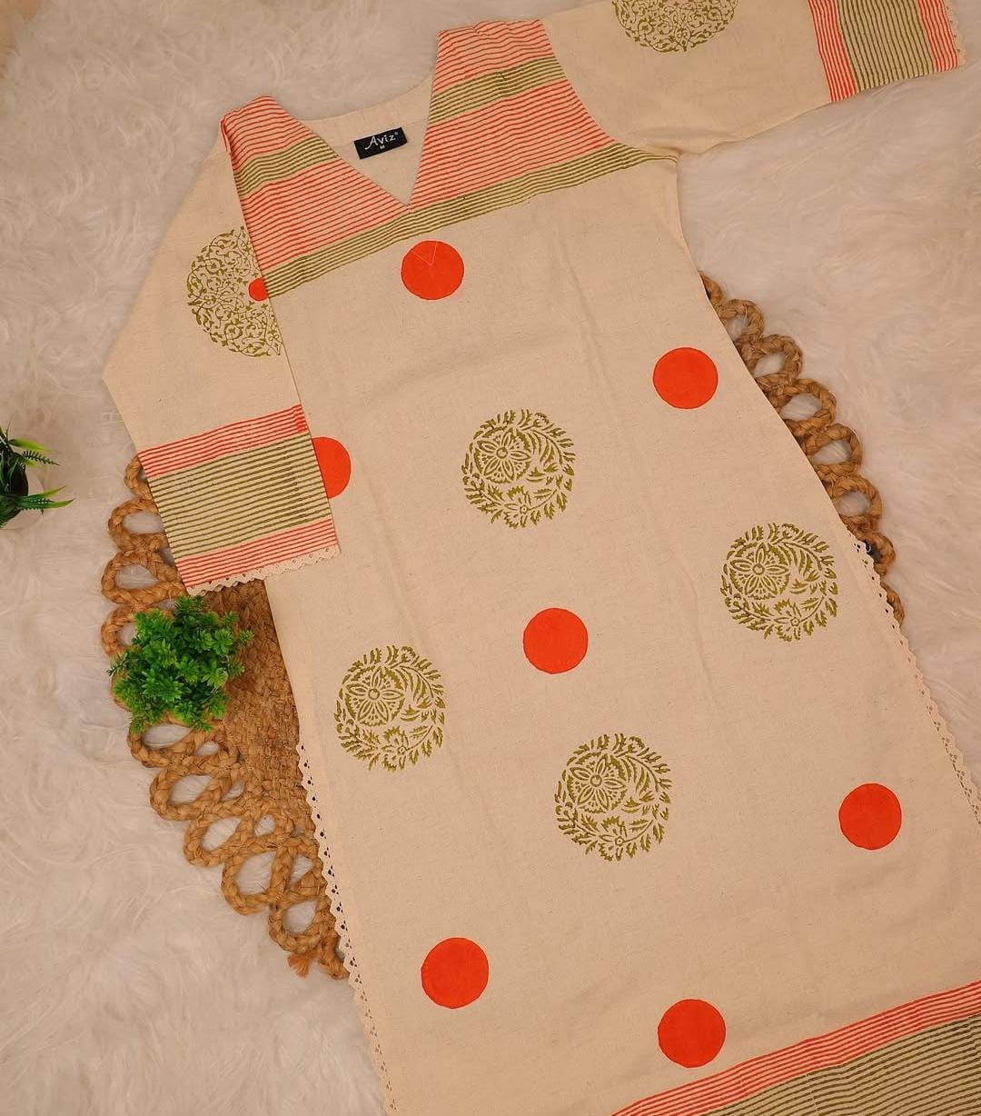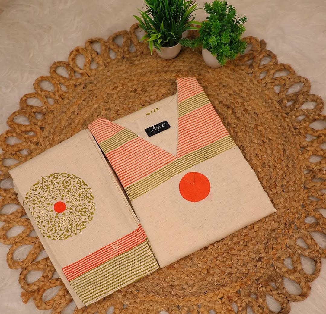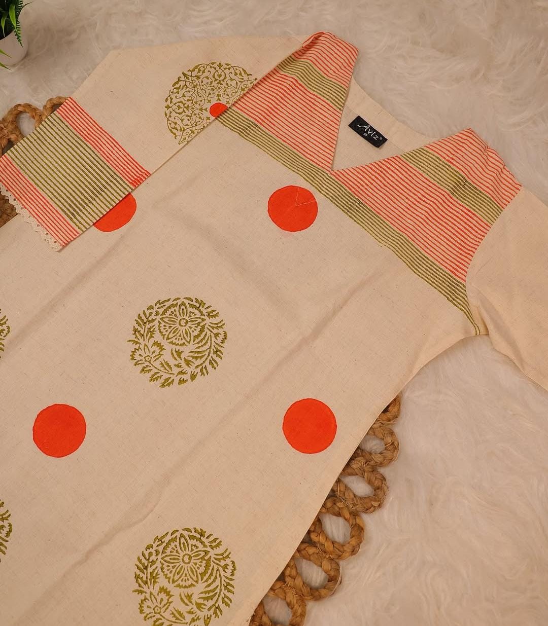 A stylish two-piece Kurta and Bottom set from Ayiz, crafted from breathable handloom fabric (Khadi or similar). The natural ecru color is highlighted by a contemporary design featuring bold coral/orange and olive-green stripes on the V-yoke and borders. The straight-cut kurta is adorned with large, eye-catching motifs created by a combination of solid coral appliqué circles and intricate block-printed mandalas, lending a unique, artisanal charm. Perfect for comfortable and fashionable day-wear or travel.