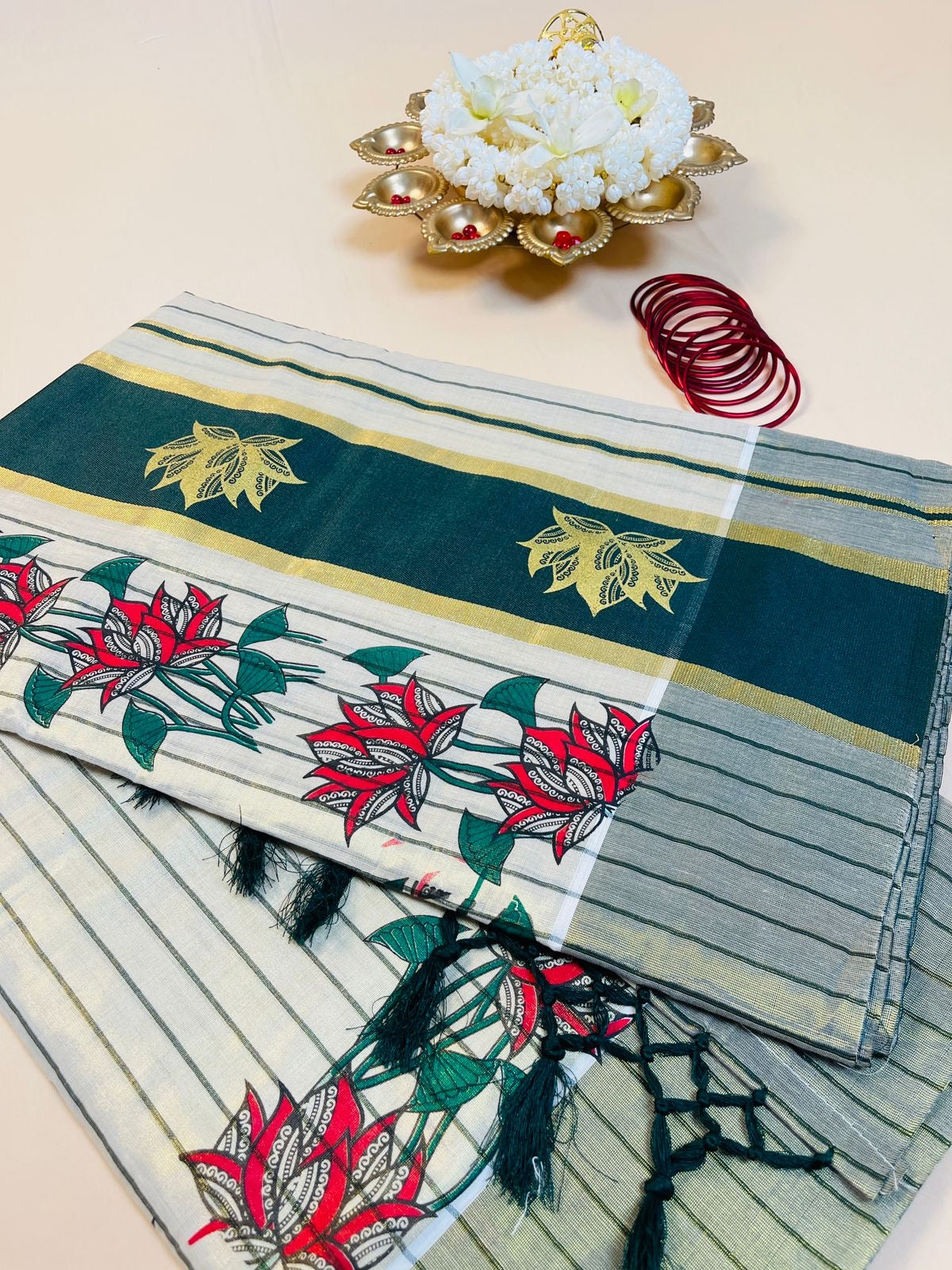 Dark green golden lotus line tissue set saree with green tazzels. 6.25 meter (blouse piece attached)