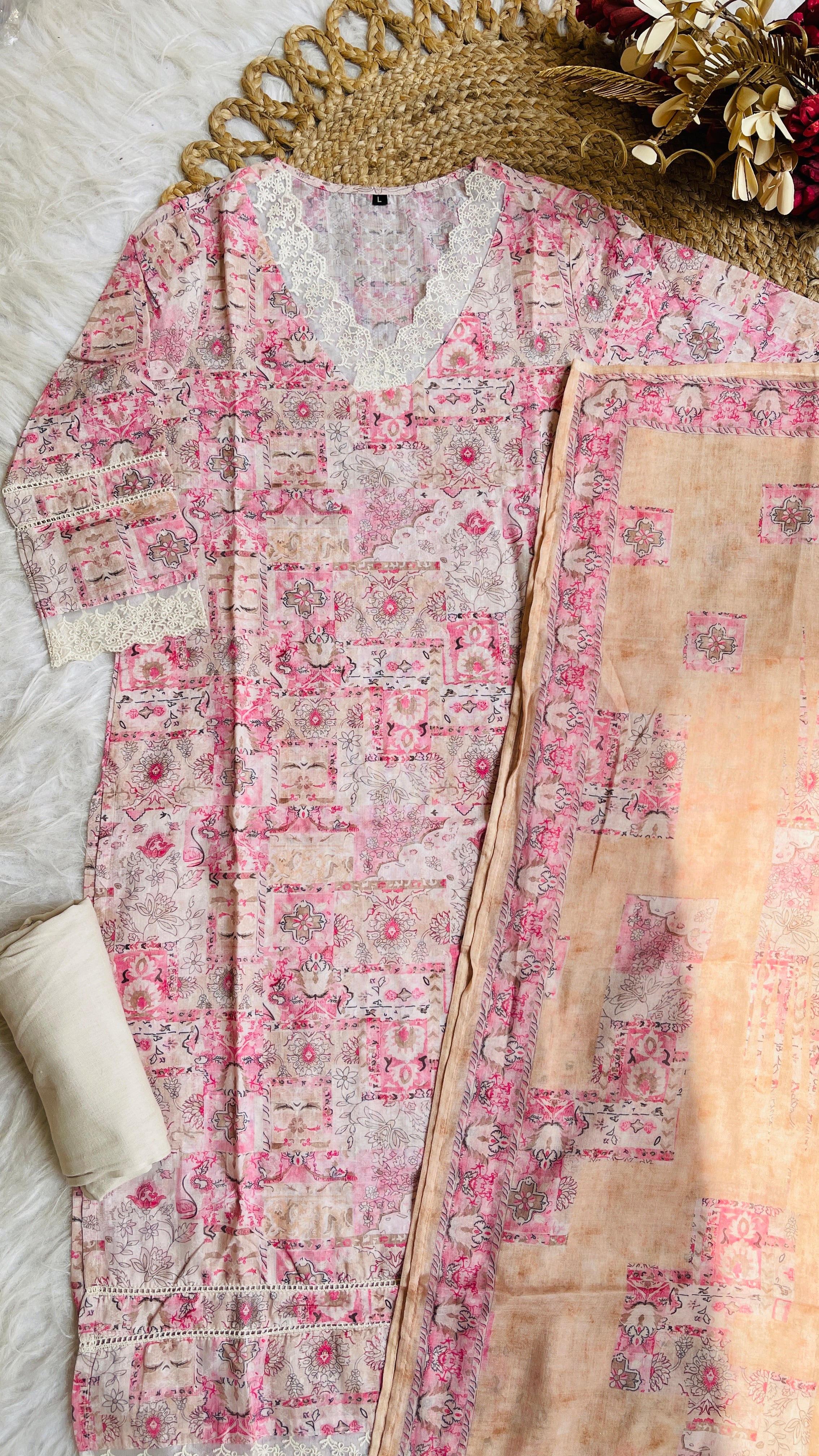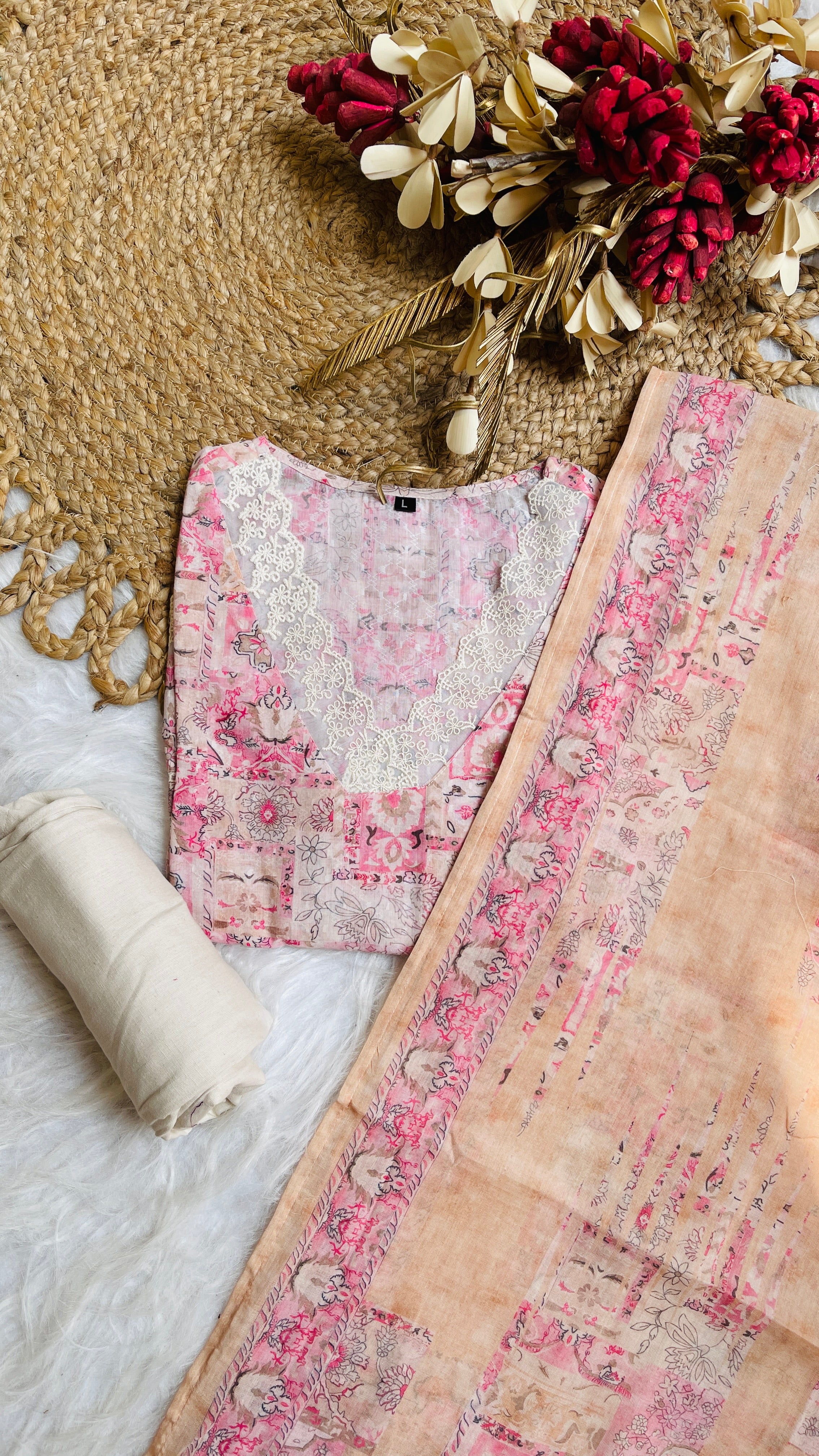 FLORAL PINK CREAM MIX KURTHA SET (SU 110)