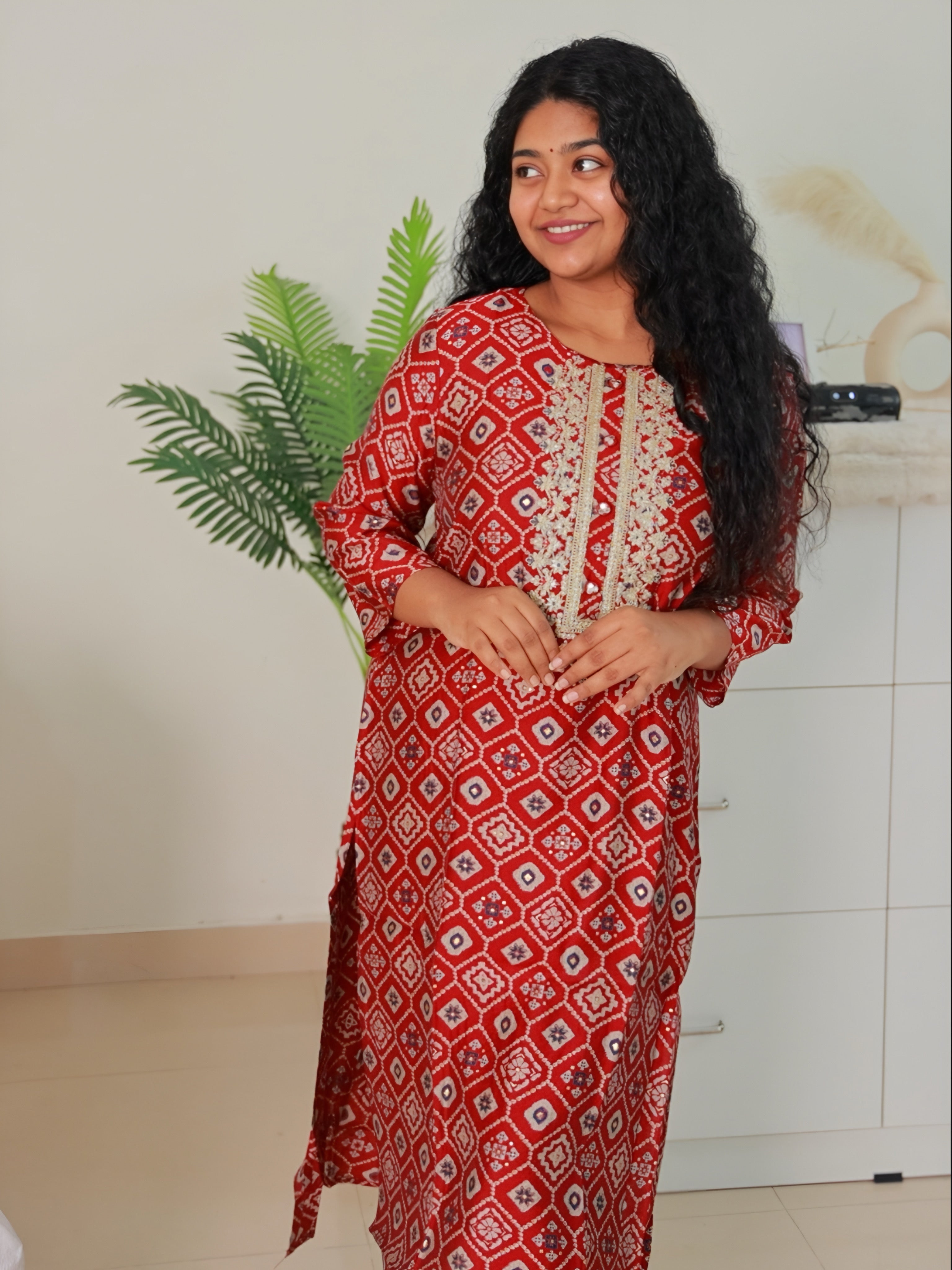 Elevate your ethnic wardrobe with this stunning red kurta. Crafted from a soft muslin, it features an all-over geometric block-inspired print in shades of navy, beige, and white. The neckline is beautifully adorned with intricate golden thread embroidery and floral motifs that adds a festive sparkle.