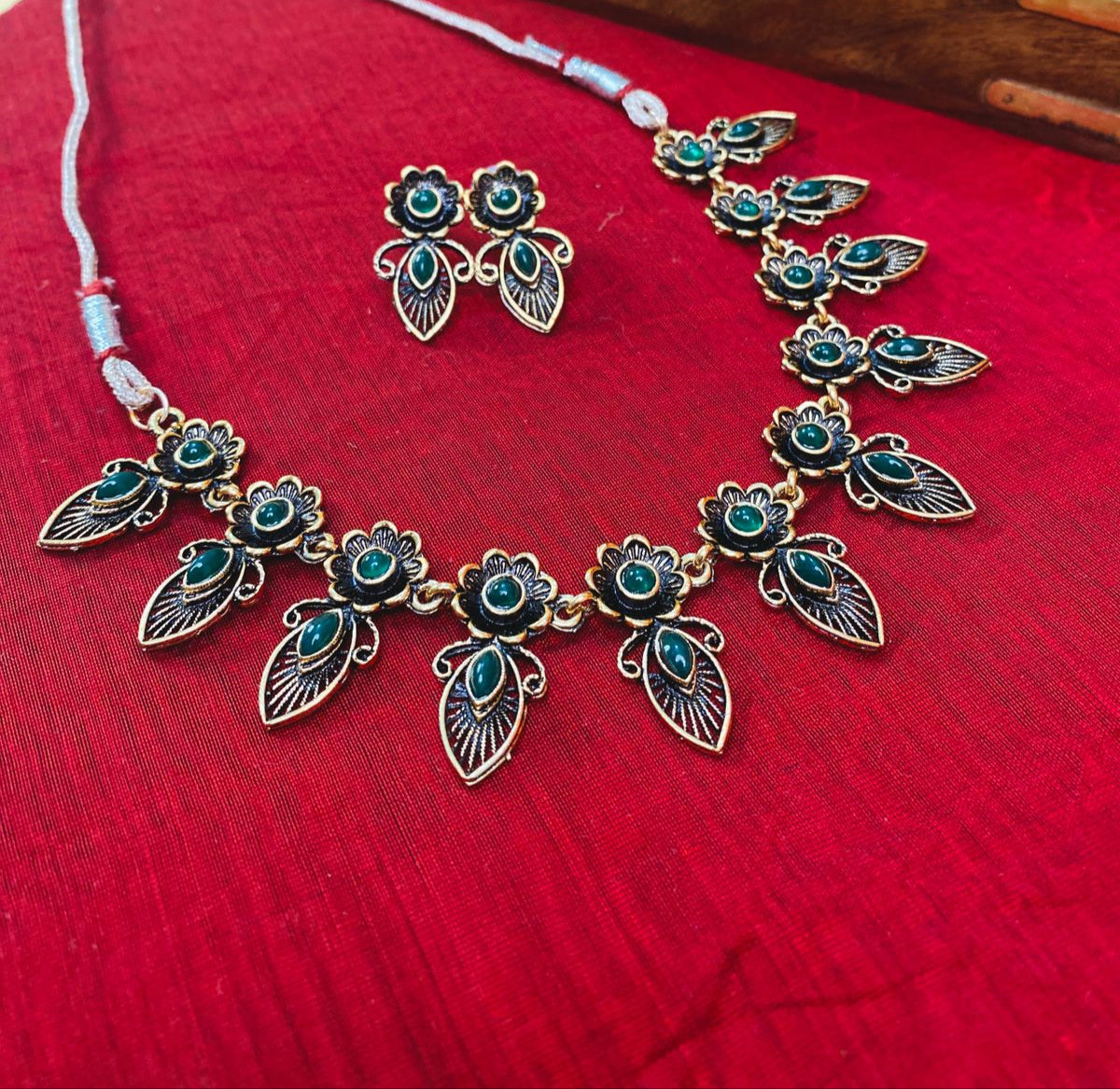 Enhance your traditional charm with this Floral Leaf Motif Necklace Set, featuring a beautiful combination of floral and leaf elements in an antique finish. Embellished with deep green stones, this set blends rustic elegance with intricate design, making it perfect for cultural and festive occasions. Handcrafted with care, the necklace is paired with coordinating earrings, bringing together a cohesive and elegant look for any ethnic outfit.
