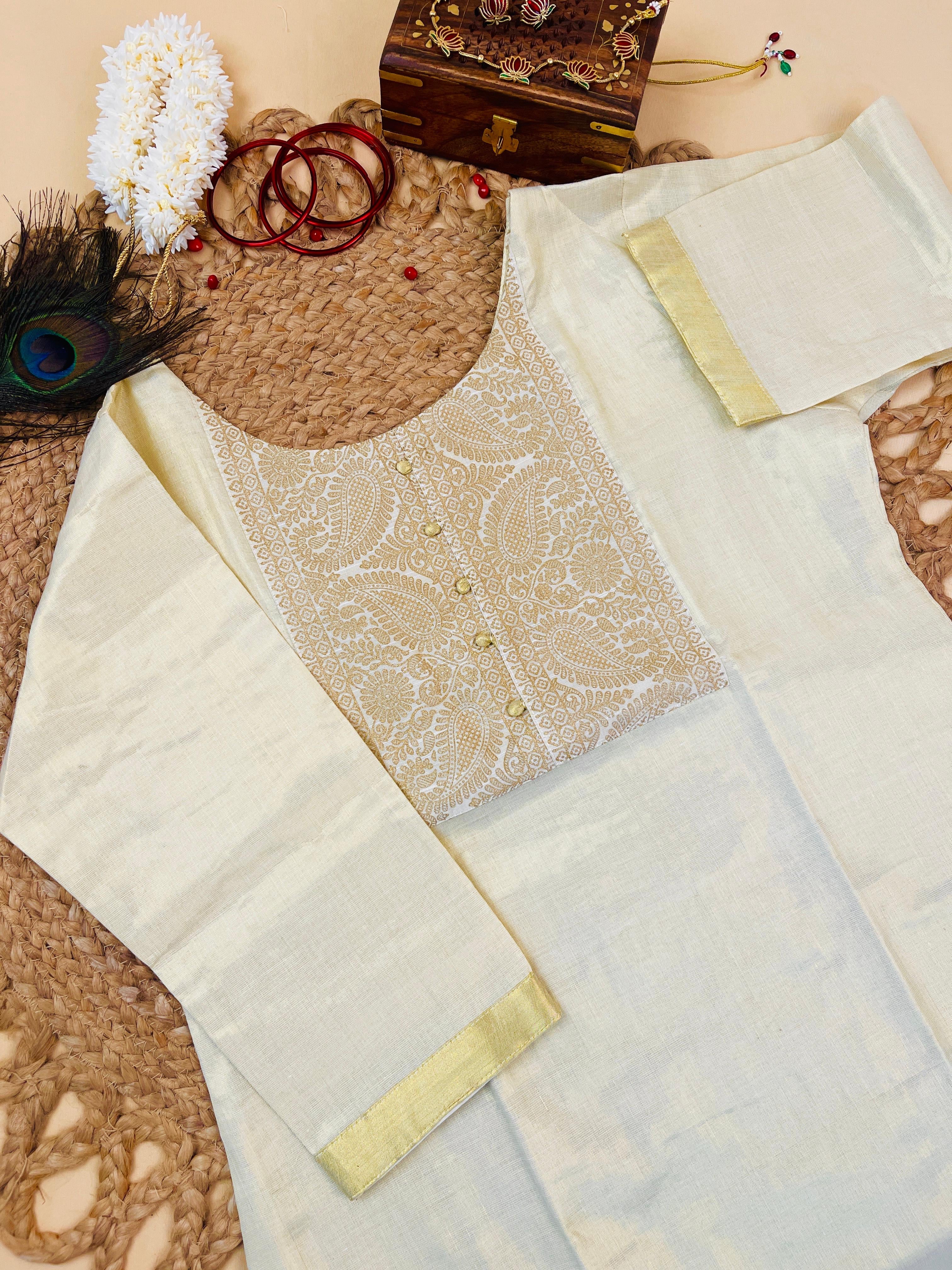 Kurtha top in tissue fabric with golden print work in yoke portion. Suitable for wearing as traditional dress,Temple visit.