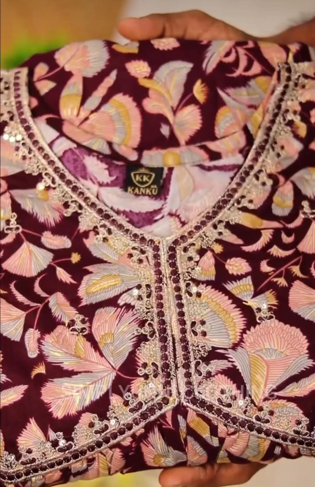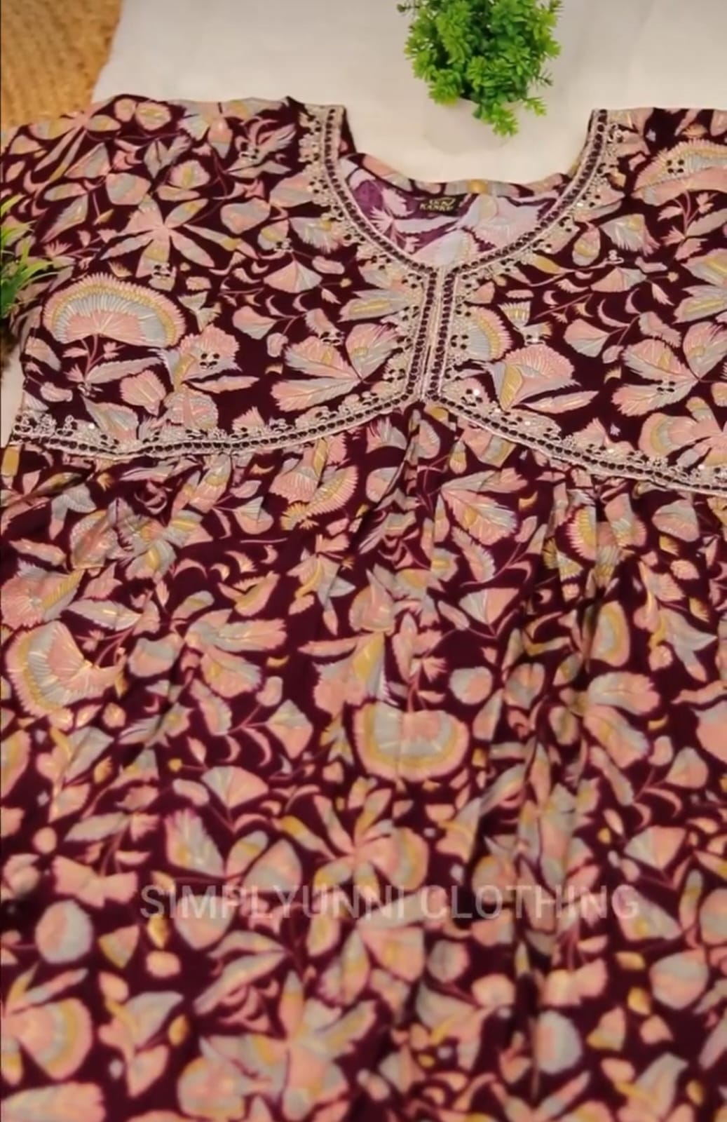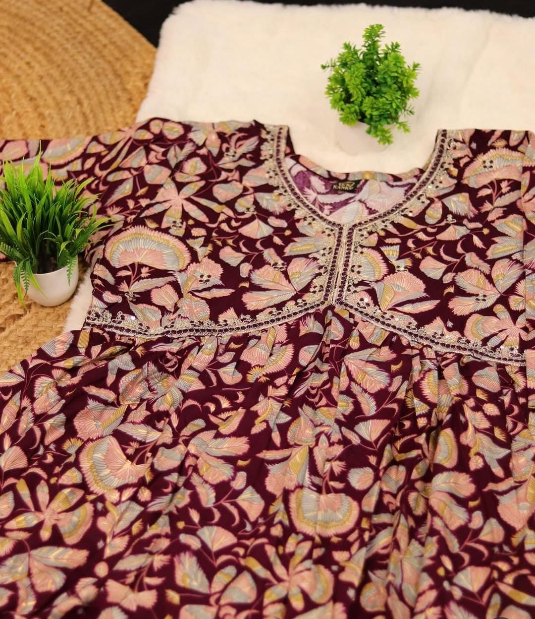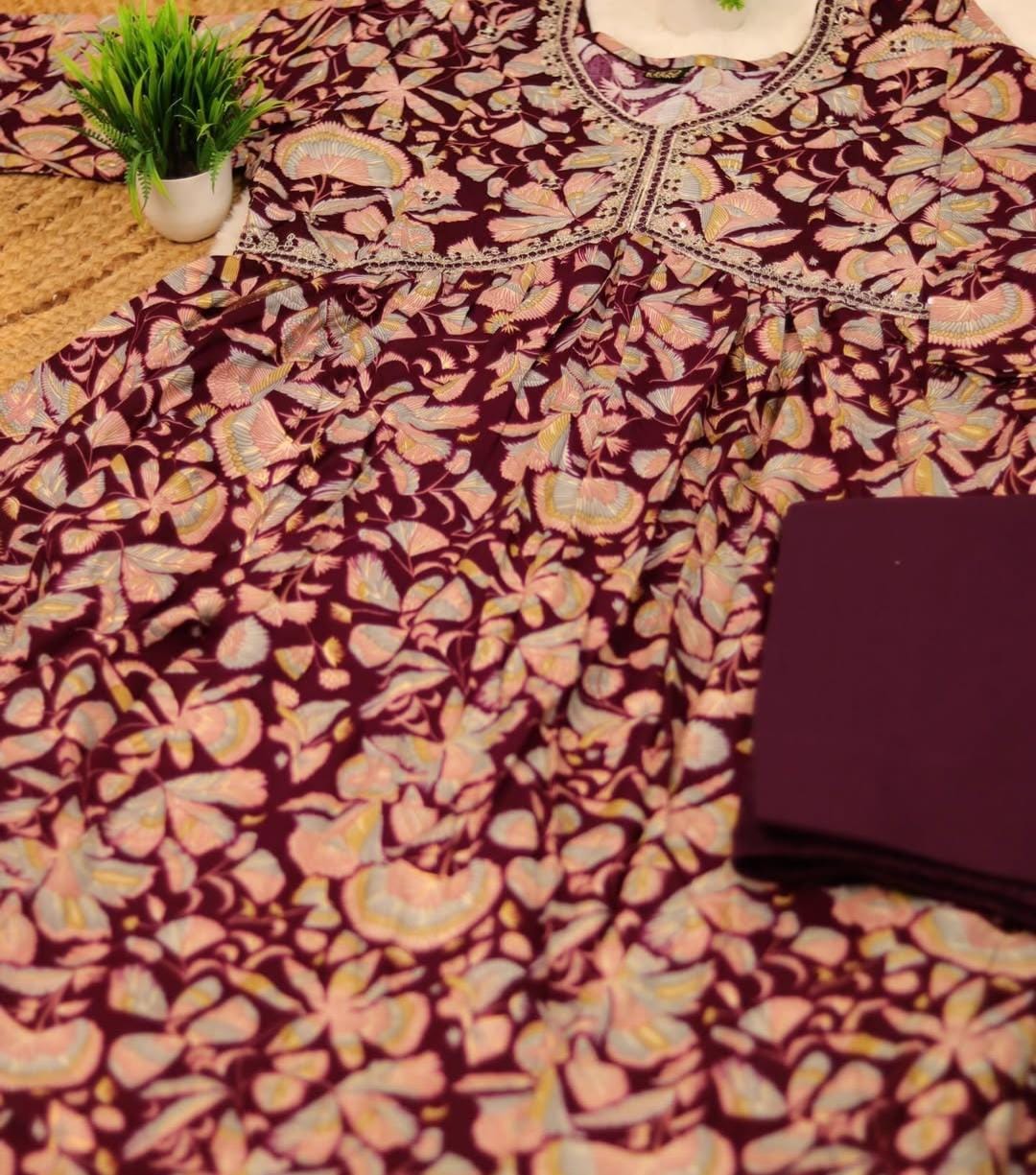 Elegant, comfortable, and perfect for daily wear, office wear, or semi-formal daytime events. The combination of the dark, rich base color and the soft floral print with the contrasting embellished neckline makes it a chic, ready-to-wear ensemble.