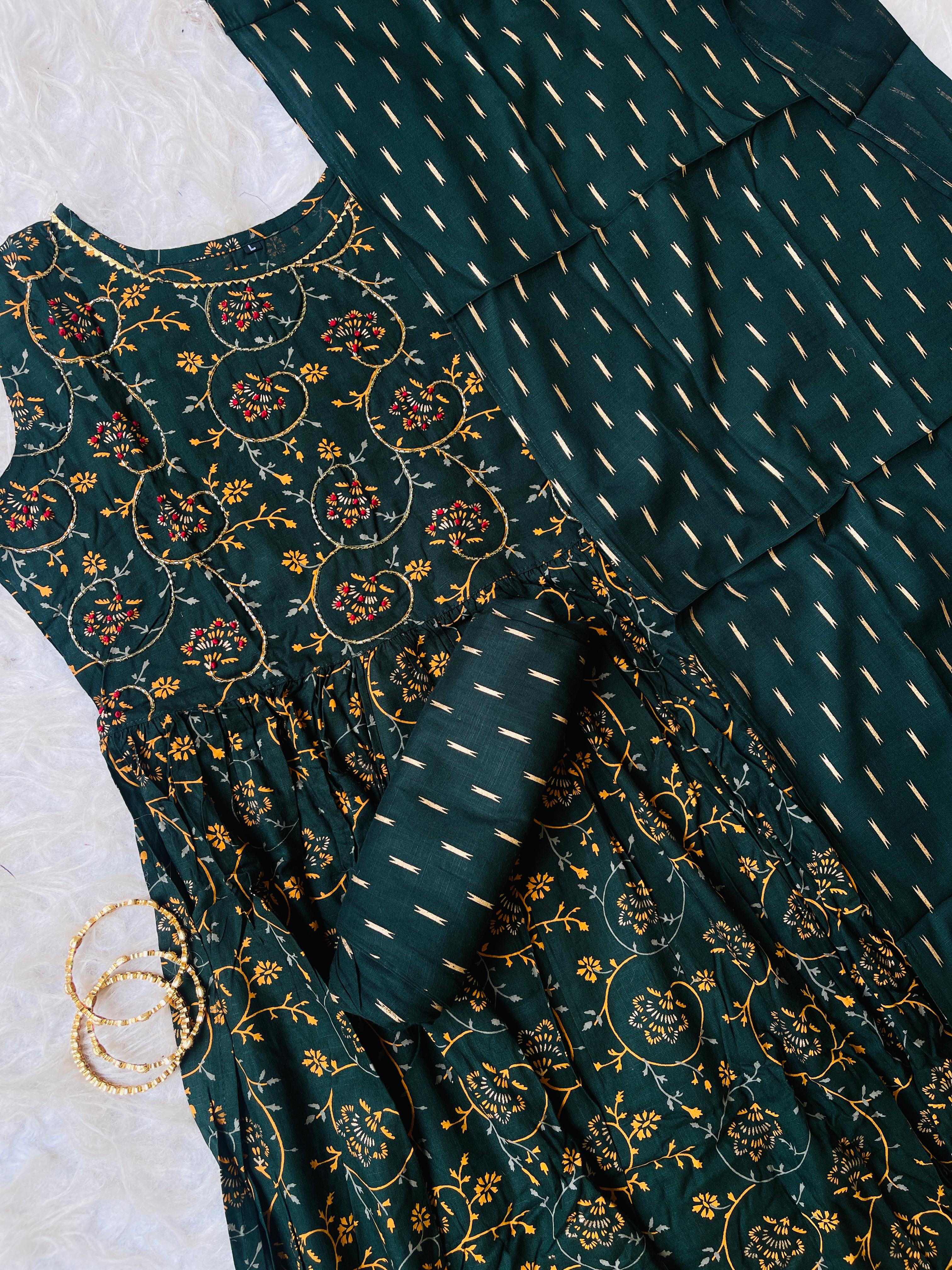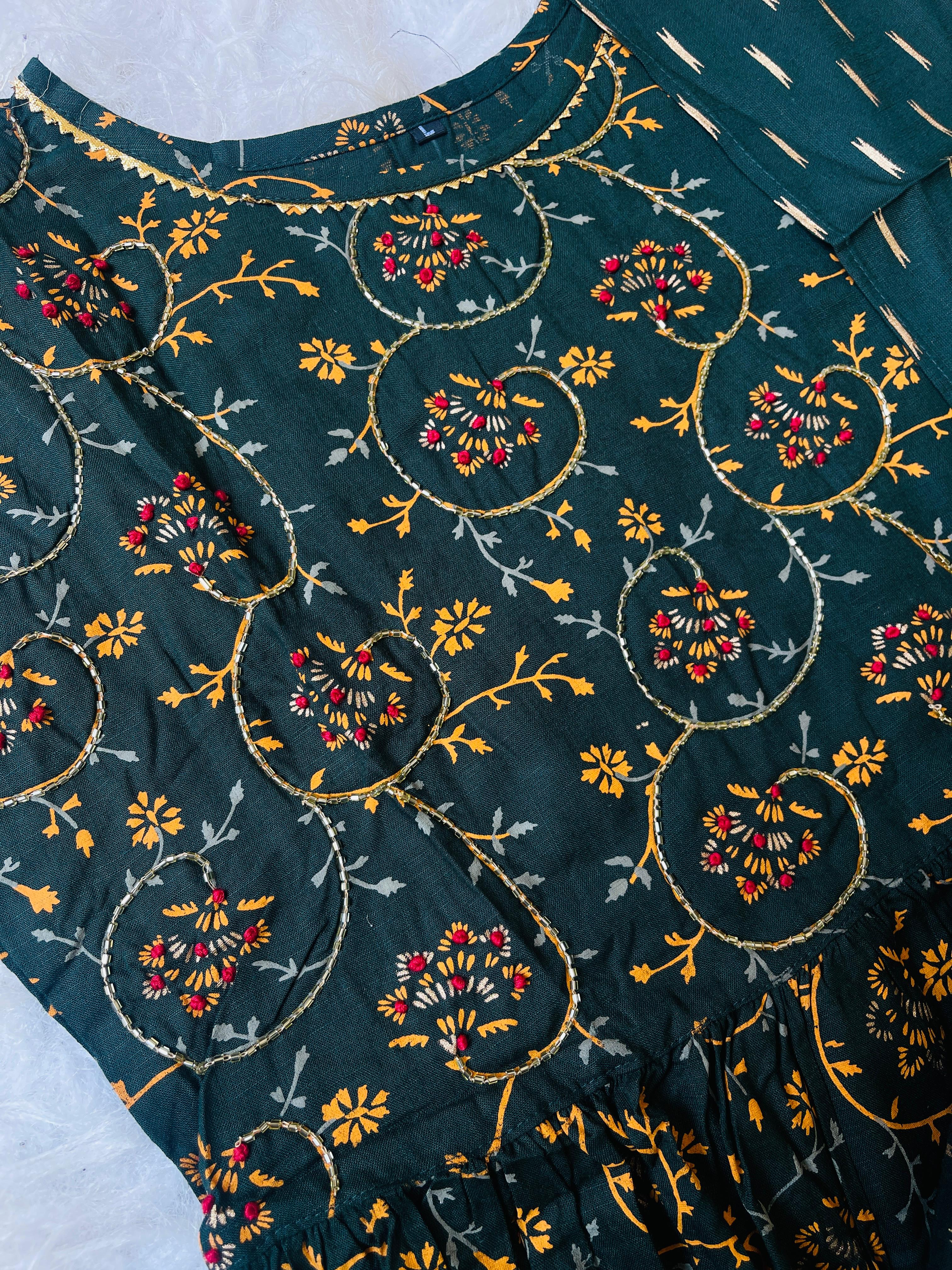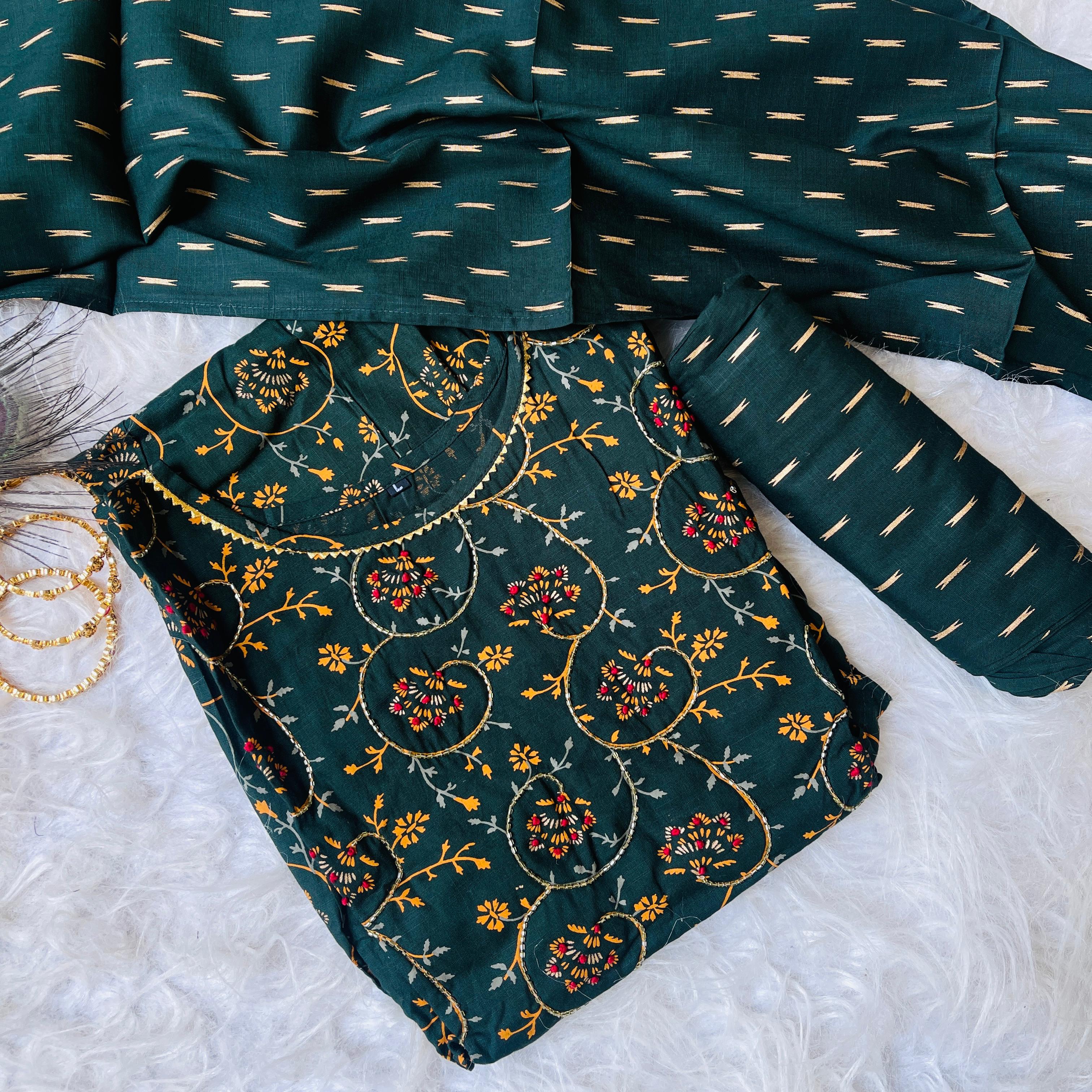 This elegant deep green kurti set beautifully blends traditional embroidery with contemporary style. The kurti features intricate floral thread embroidery in mustard yellow and maroon tones, highlighted with delicate vine motifs throughout the front panel. Designed with a classic round neckline and soft gathers at the waist, it offers a flattering and comfortable fit.