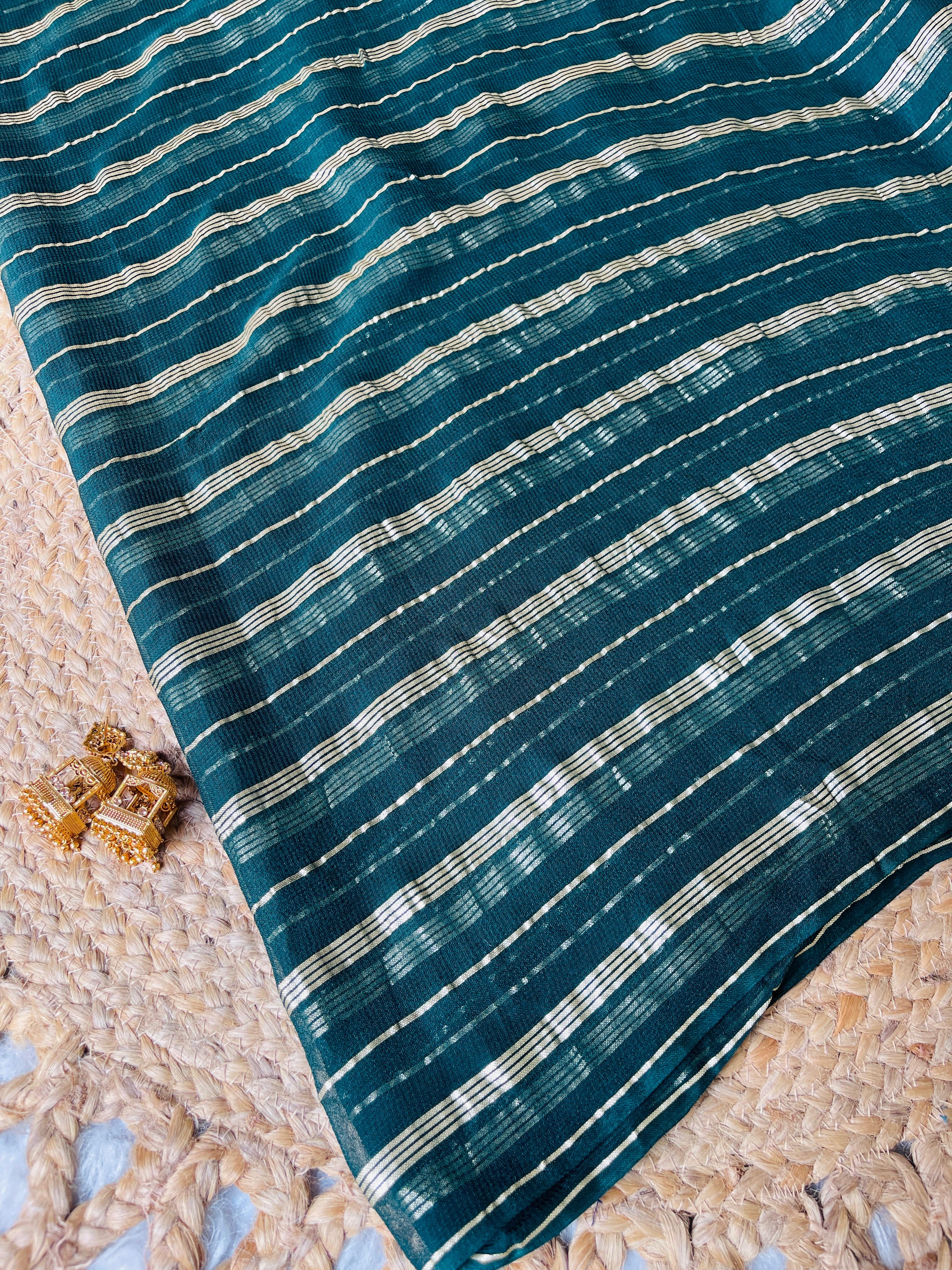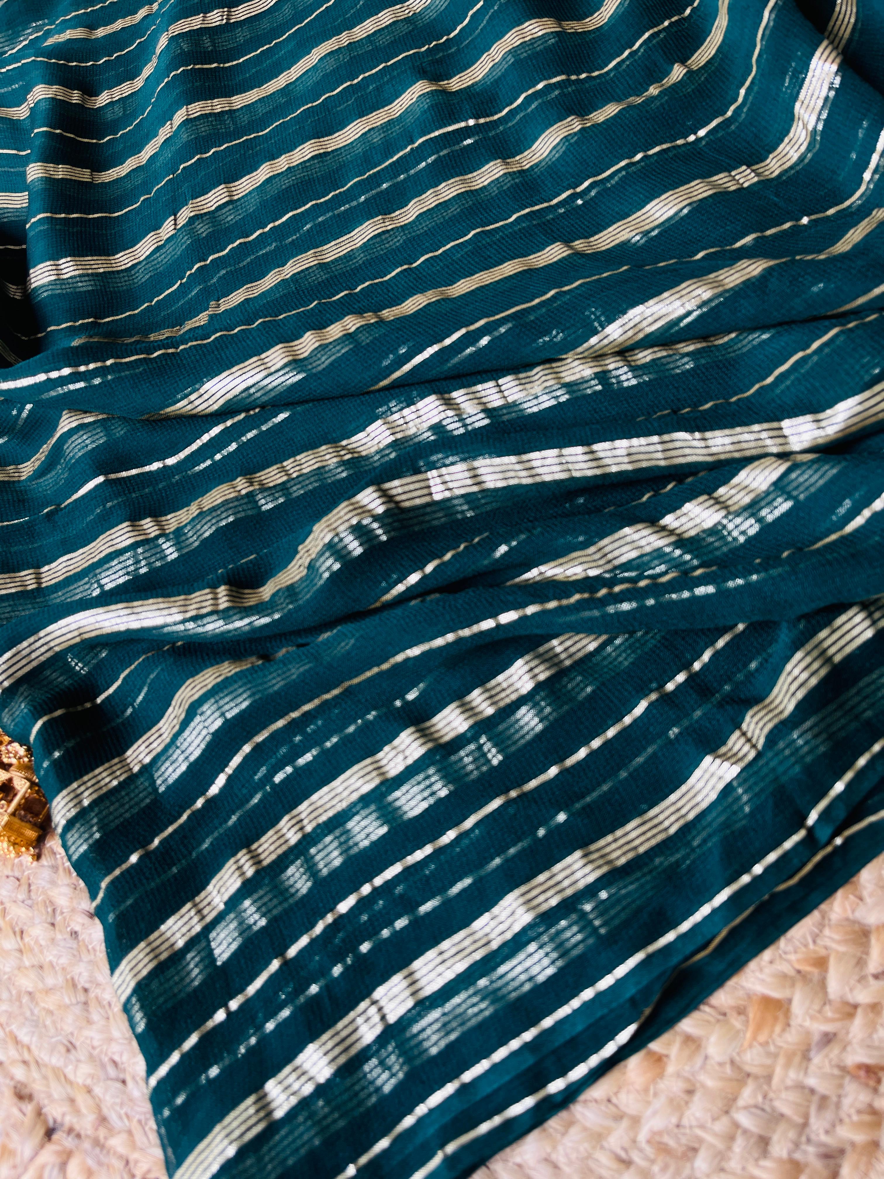 A stunning and elegant textile, this fabric features a rich, deep teal green (or dark emerald green) base, characterized by its sheer, flowing texture, suggesting a high-quality Chiffon or Georgette blend.