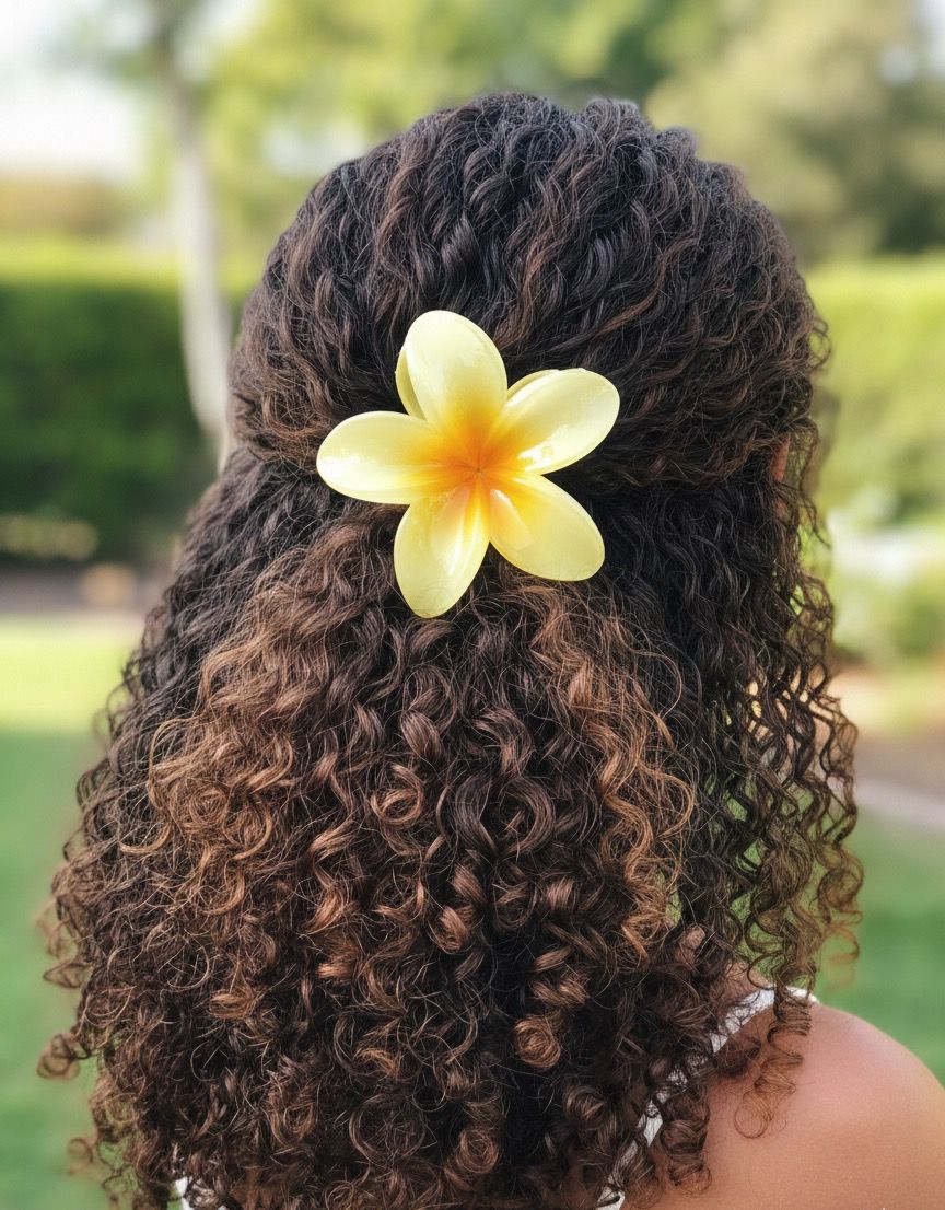 Bright, tropical, and feminine. These clips are perfect for beachwear, summer events, or adding a festive, floral touch to casual outfits. They are designed to mimic the natural beauty of the Plumeria flower.