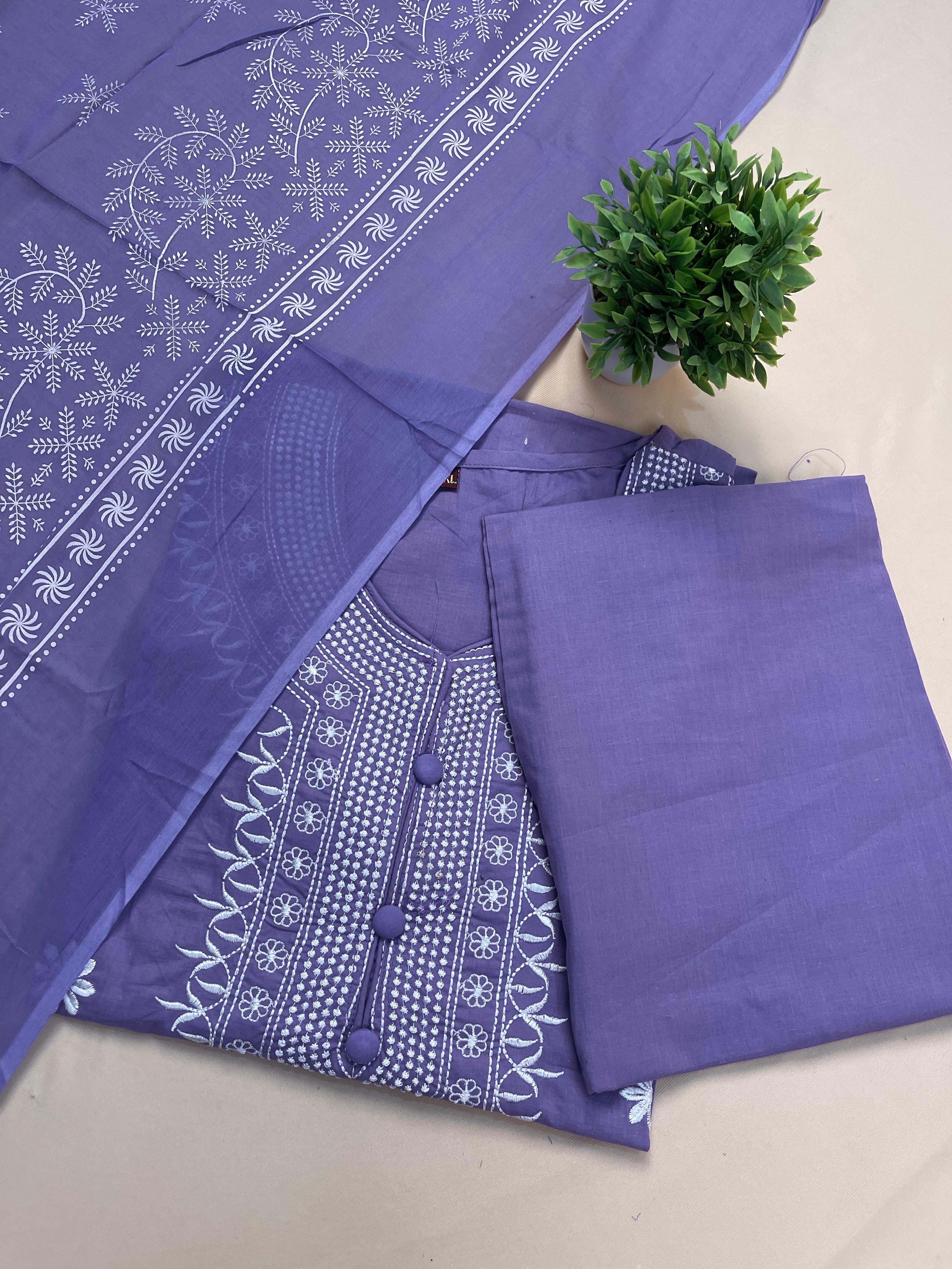 The lavender kurta fabric is beautifully adorned with white thread embroidery, featuring a detailed neckline design inspired by chikankari patterns, and scattered delicate floral motifs across the front for a subtle yet refined look. The set includes a matching plain bottom fabric and a lightweight dupatta designed with intricate floral embroidery and a decorative border that complements the kurta perfectly.
