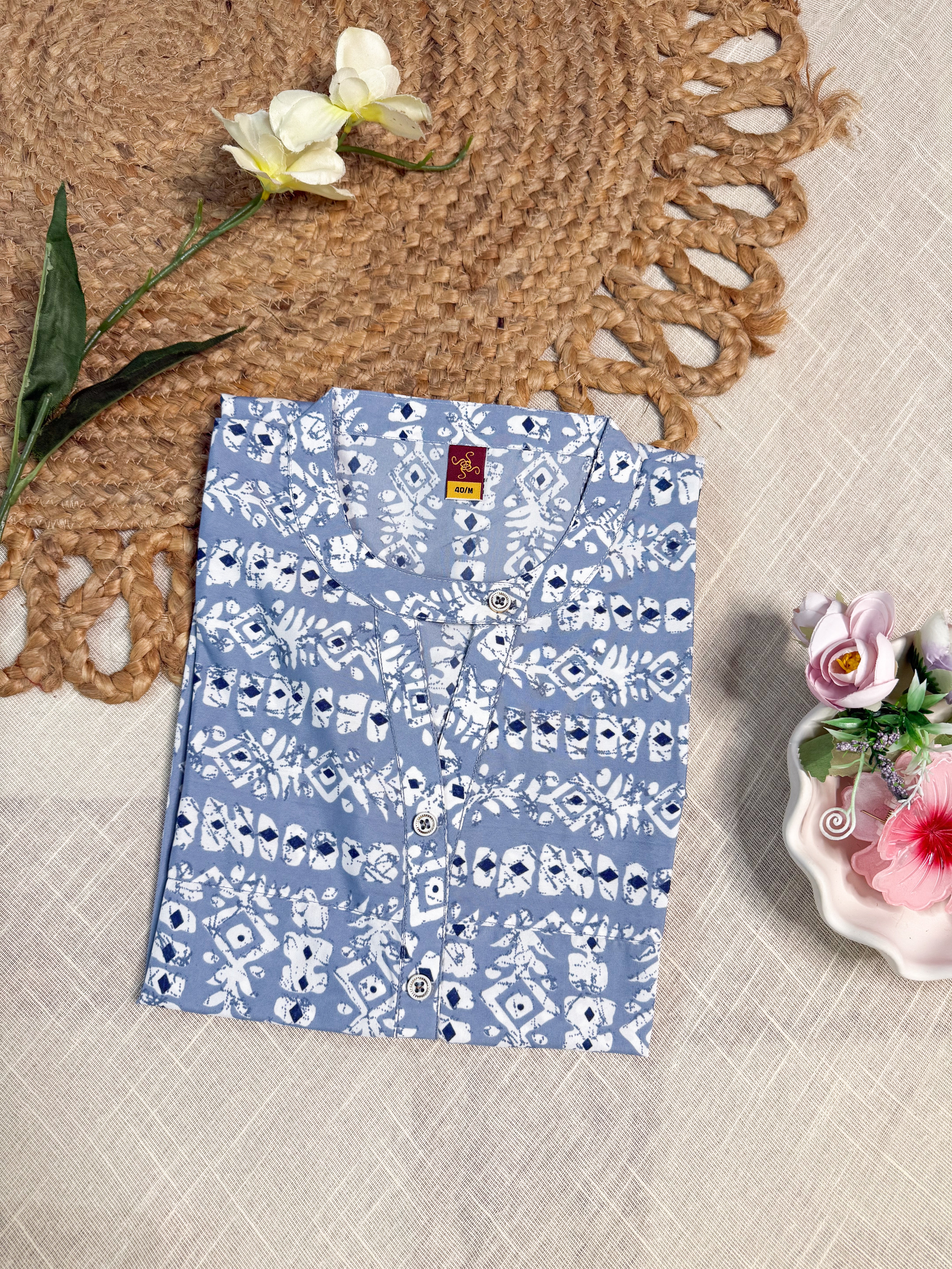 Chic and comfortable light blue short kurti with white ethnic prints. Features button-down detailing, short length style, and breathable cotton fabric perfect for daily wear, college, or casual outings. Pair it with jeans, leggings, or palazzos for a trendy look.