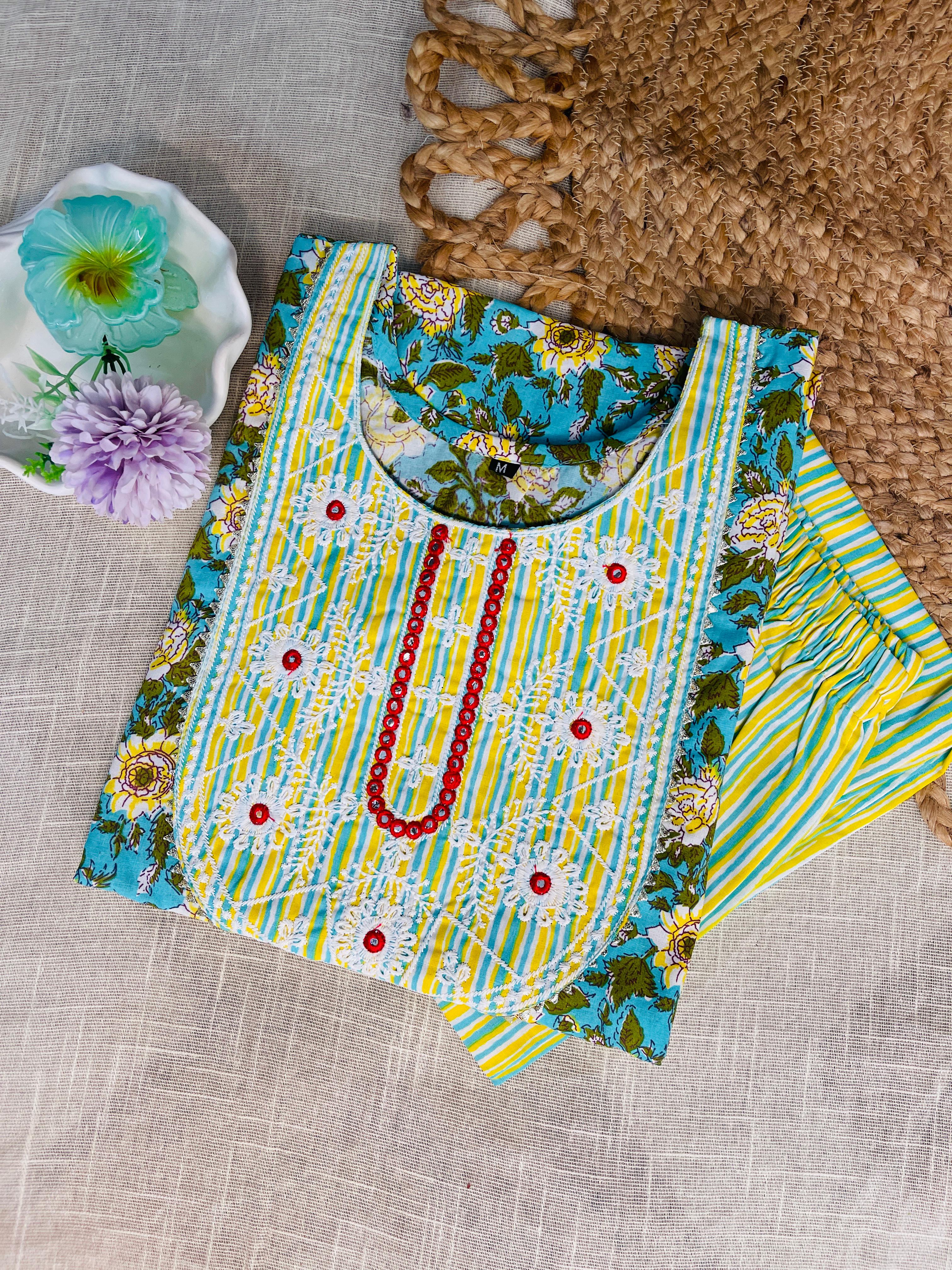 Brighten up your wardrobe with this beautifully designed Co-ord set featuring a vibrant floral print and an intricately embroidered neckline. The colorful blend of turquoise blue, yellow, green, and white gives a fresh and festive feel, ideal for daywear in spring and summer.