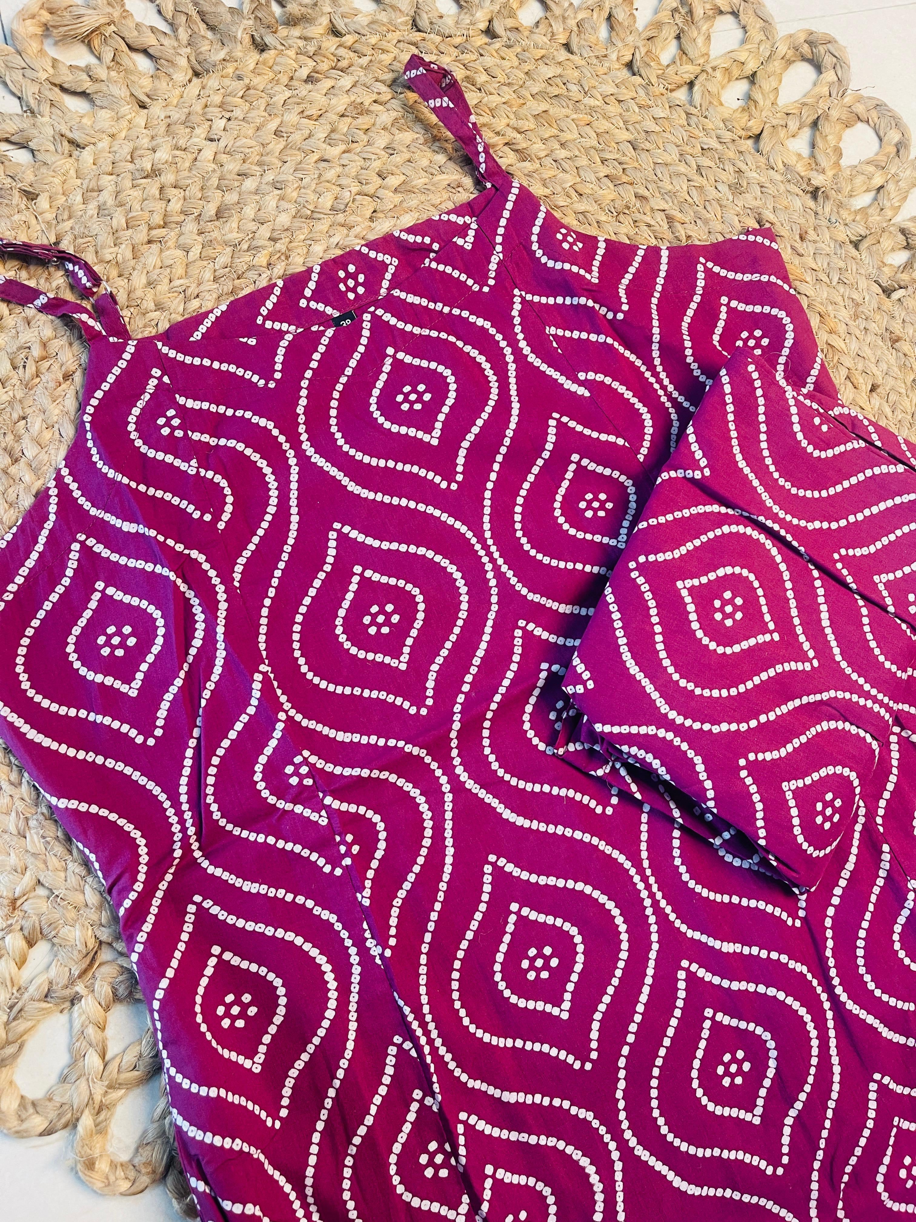 Magenta Sleeveless Bandhani Print Strappy Co ord set This garment is a dark magenta color with an all-over white traditional Bandhani (tie-dye) inspired print (wavy pattern with center motifs). It features thin shoulder straps and is likely a loose, comfortable co ord set