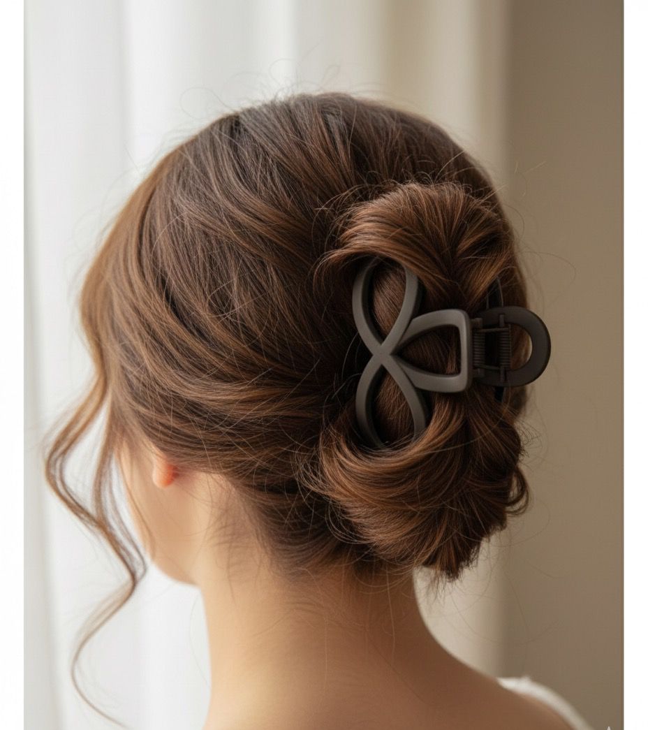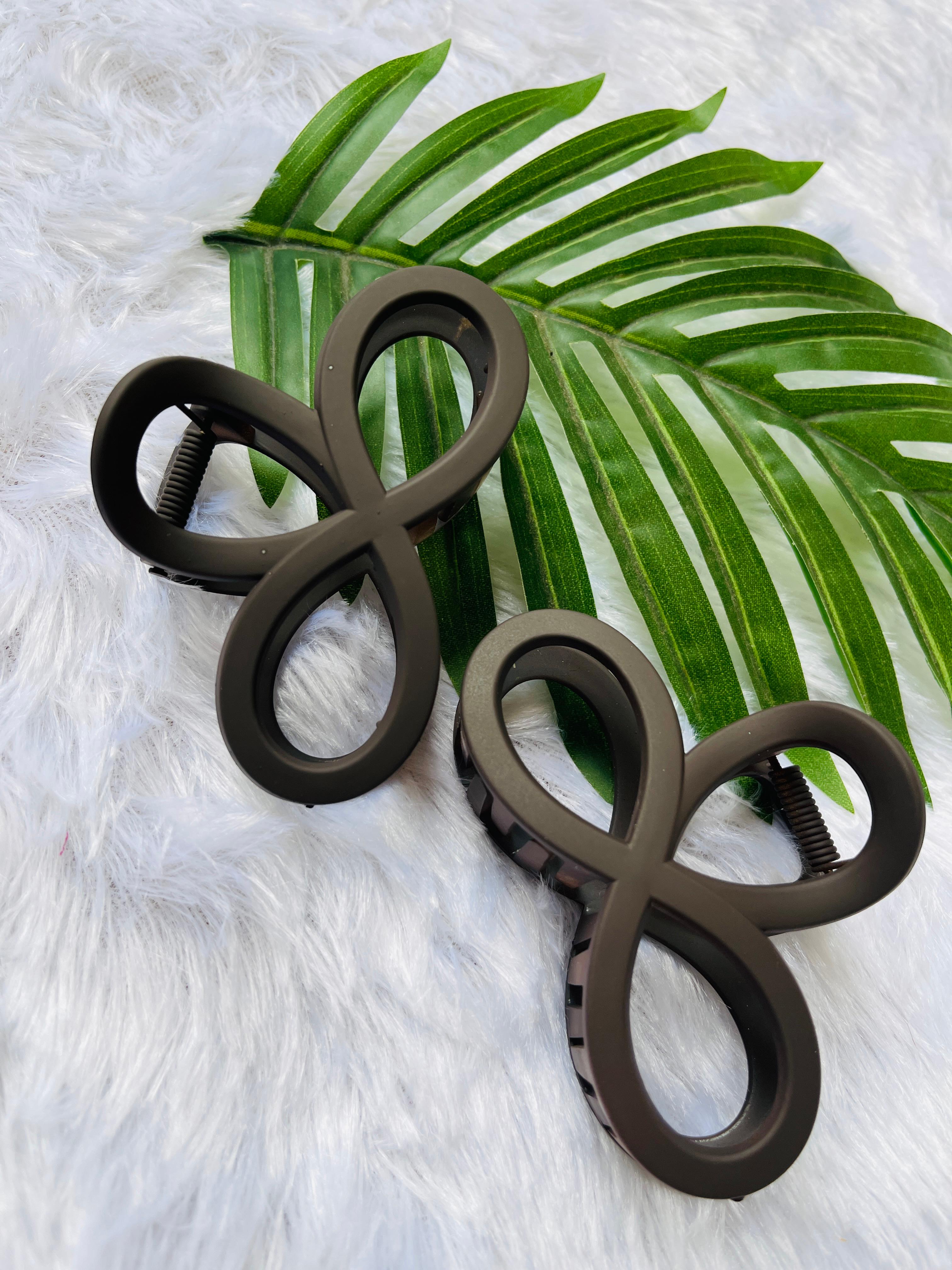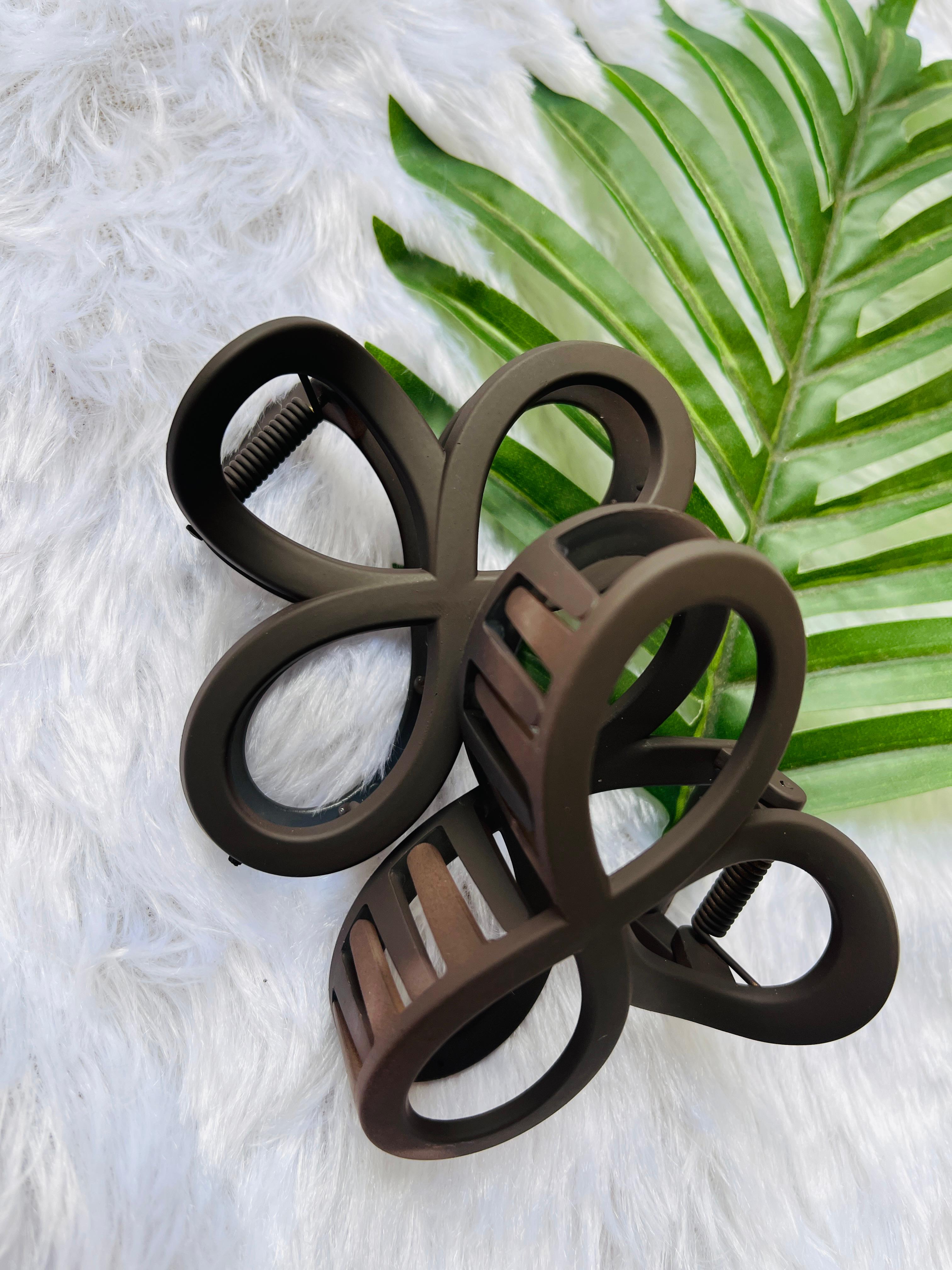 Minimalist, modern hair claw clips featuring a unique, open-work abstract clover or figure-eight design. The sleek, matte finish and muted, earthy taupe color make them a versatile and sophisticated accessory for everyday wear or dressing up.