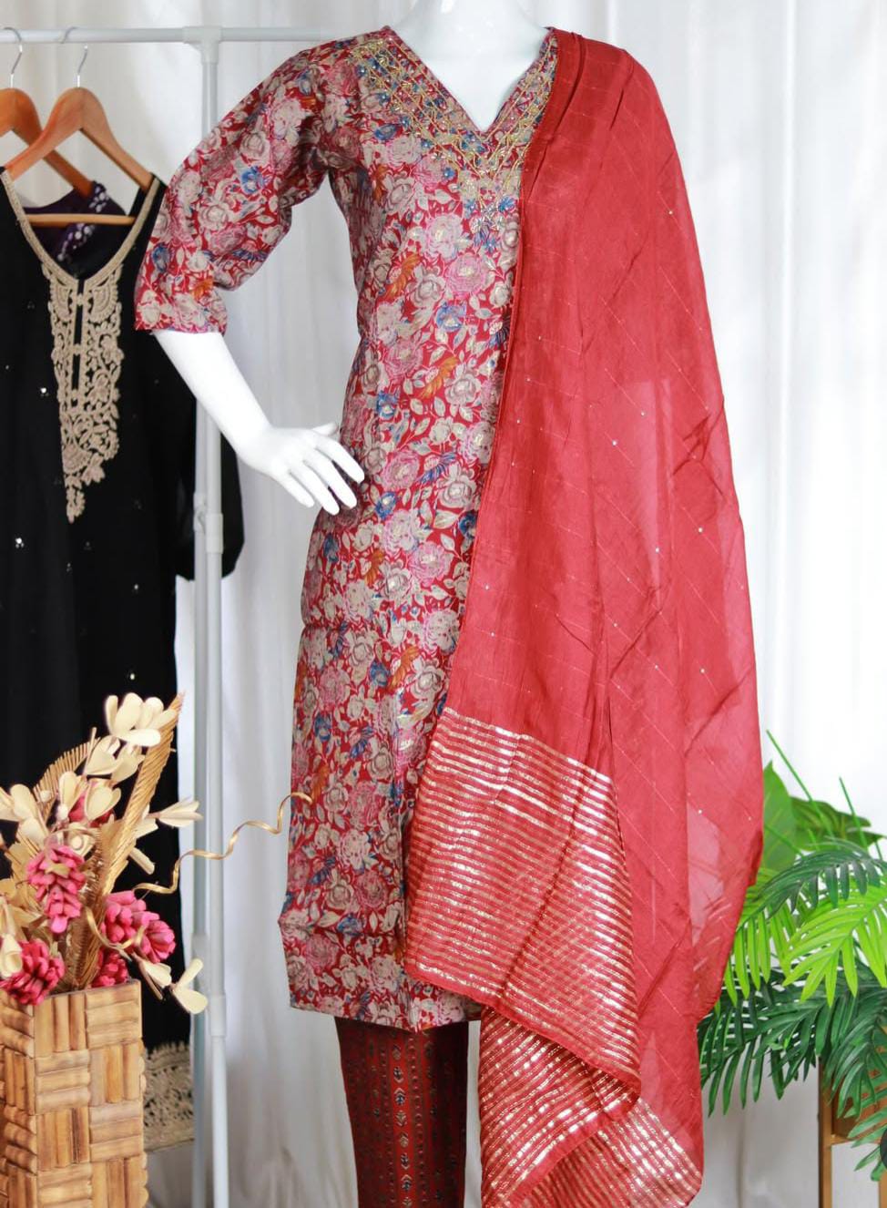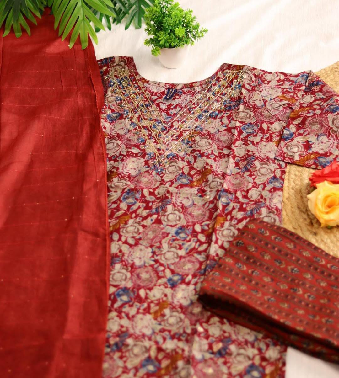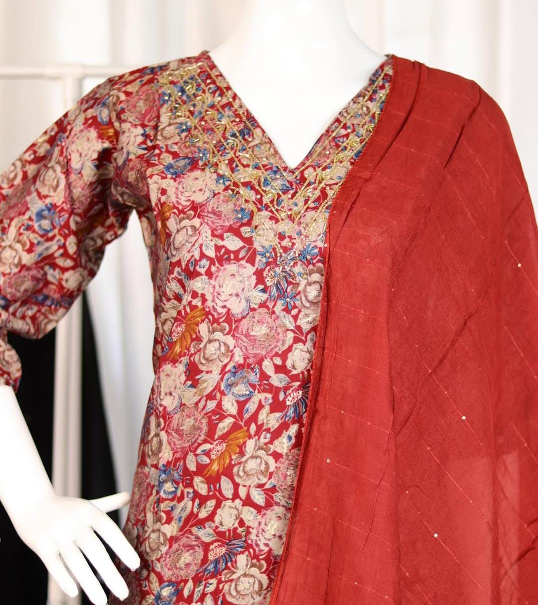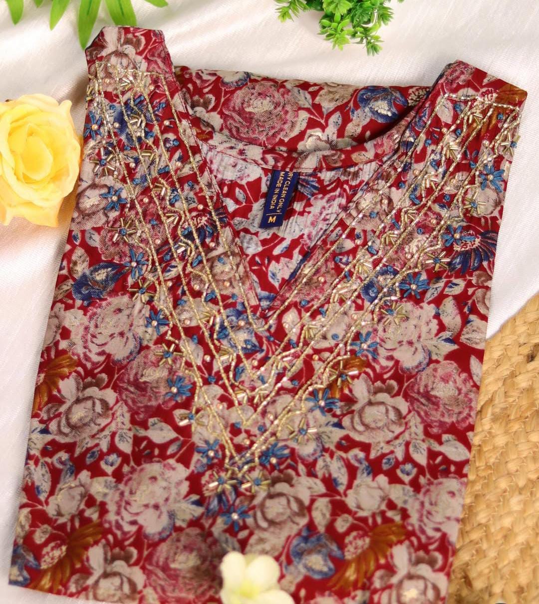 A vibrant and contemporary A-line or straight-cut Kurta featuring a rich, all-over floral print. The piece blends traditional detailing with modern aesthetics, making it perfect for festive occasions or smart casual wear.The highlight is the beautifully designed V-neckline, which features intricate Zari (gold thread) embroidery. The delicate gold threadwork is arranged in a striking, layered V-pattern, outlining the neck and extending down the yoke. This detailing adds a luxurious, traditional touch.