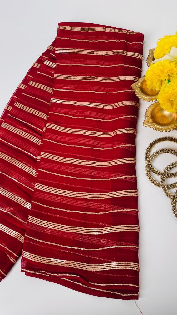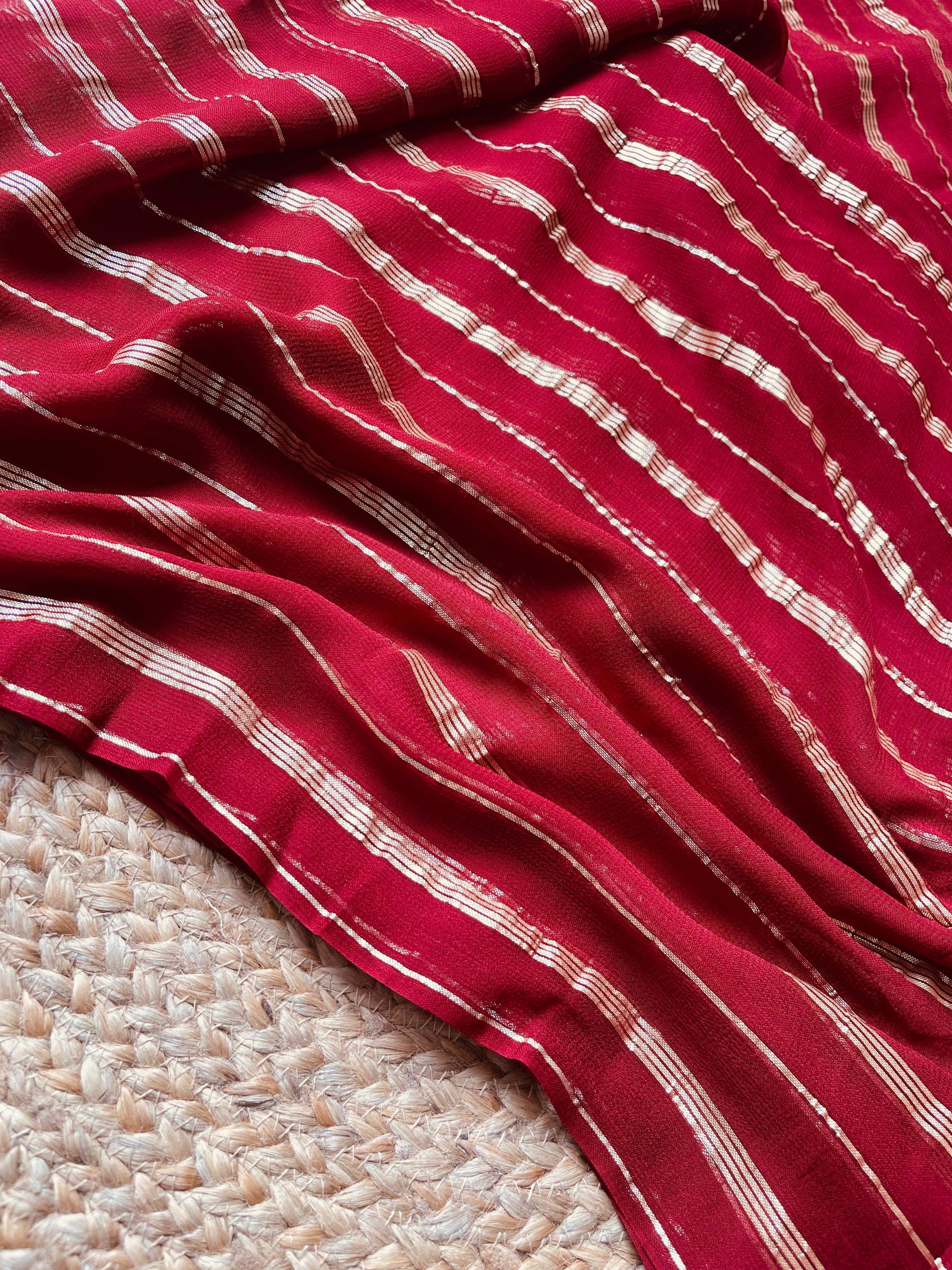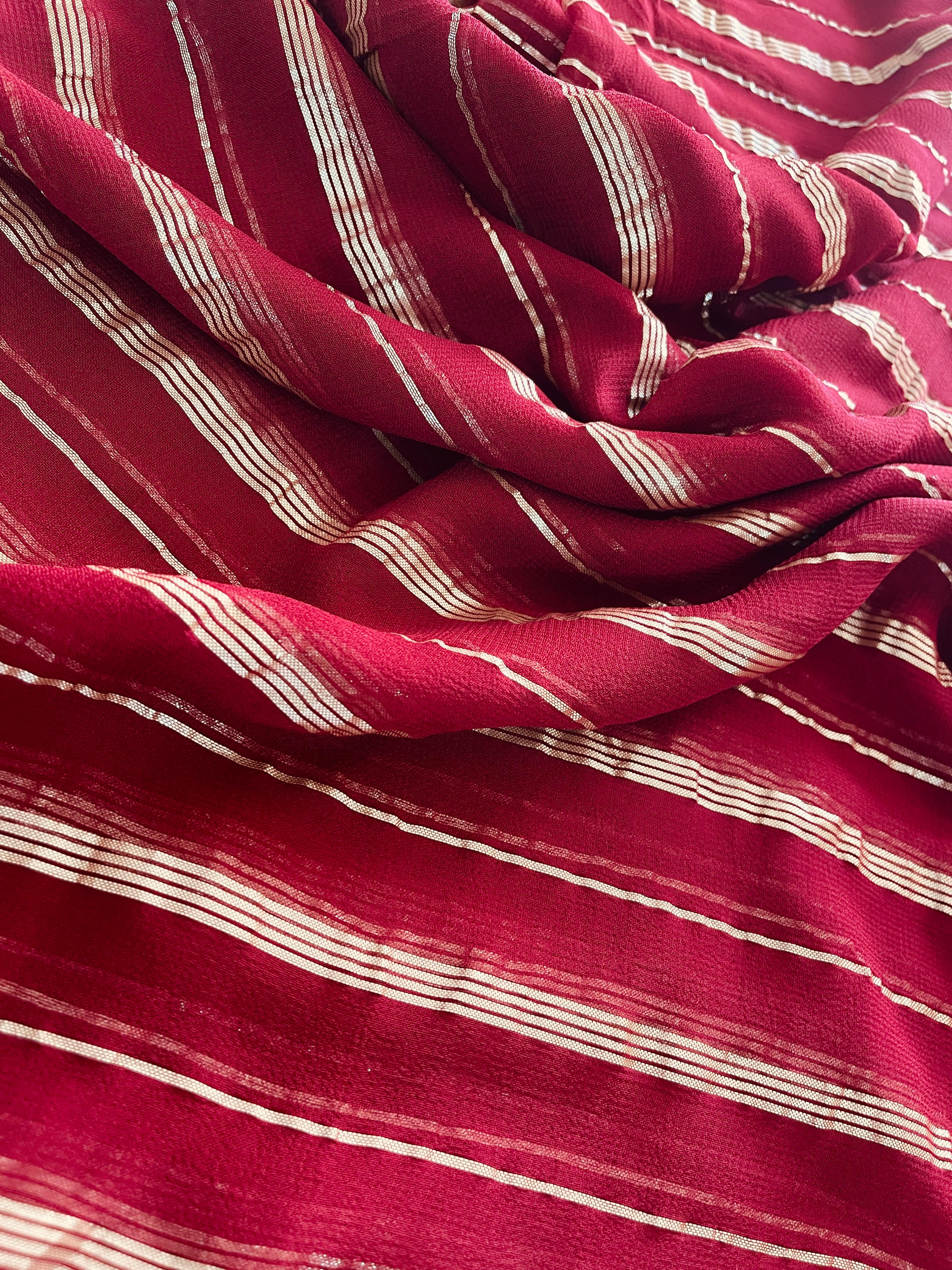 A vibrant and festive textile, this fabric features a rich, deep maroon red (or rani pink/crimson) base. Like the dark green variant, it exhibits a sheer, flowing texture, suggesting a high-quality Chiffon or Georgette blend