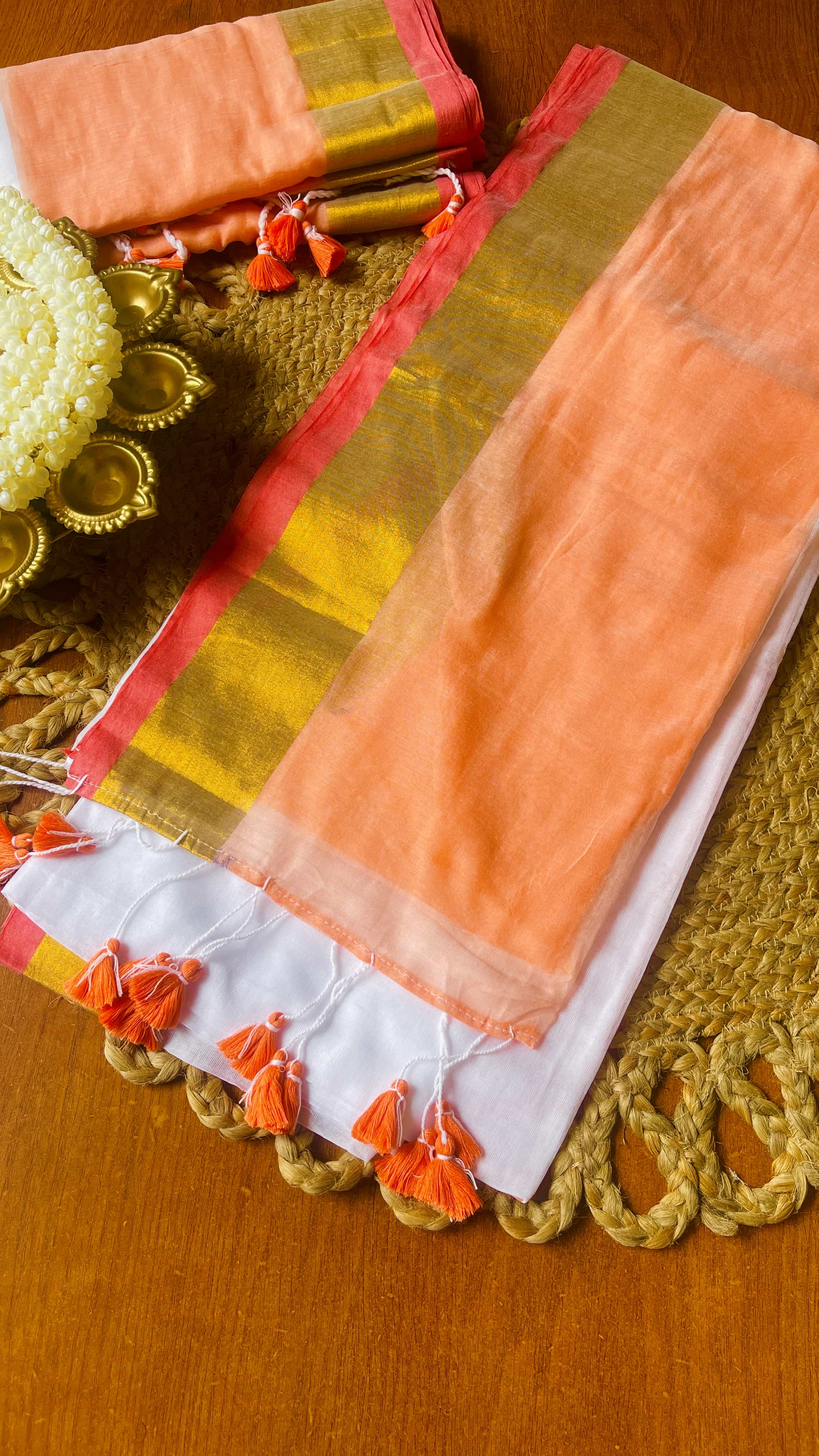 120 Count Mul Cotton Peach Saree with White Body and Peach tassels