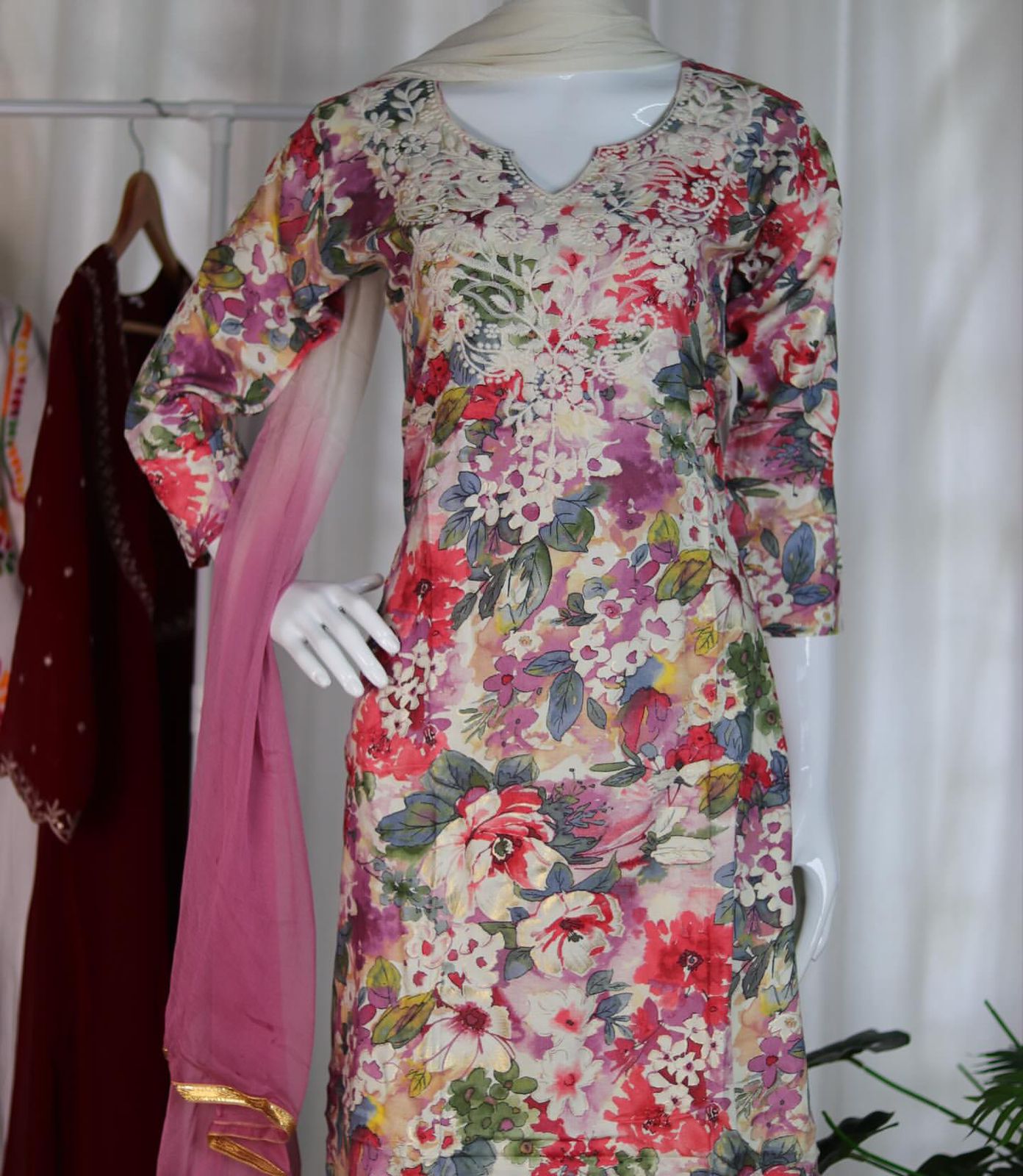Brighten up your everyday wardrobe with this vibrant multicolor floral printed salwar set. The kurta features a stunning floral design in shades of red, pink, green, and ivory, beautifully complemented by intricate embroidery around the neckline. Crafted from soft, breathable cotton fabric, it ensures comfort and freshness all day long. The set is paired with a solid pant and a dual-shaded chiffon dupatta in soft pink and ivory tones, edged with a golden border for a touch of elegance. Perfect for casual outings, festive gatherings, or office wear.
