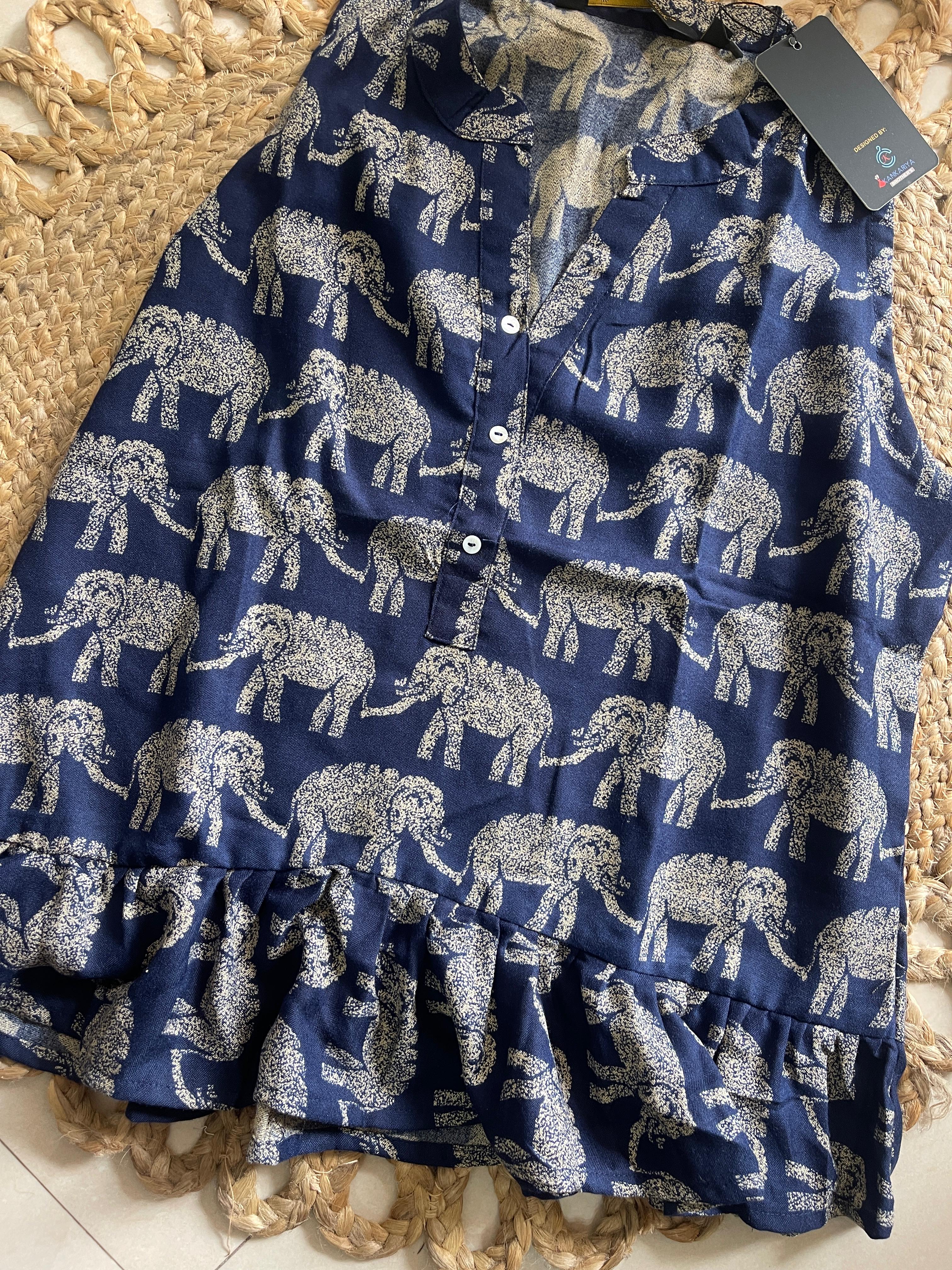 Add a touch of elegance to your everyday style with this Navy Blue Elephant Print Short Kurthi. Made from soft, breathable cotton fabric, it features beautiful elephant motifs that bring a playful yet traditional charm. The short-length silhouette makes it ideal for casual wear, college days, or festive gatherings.