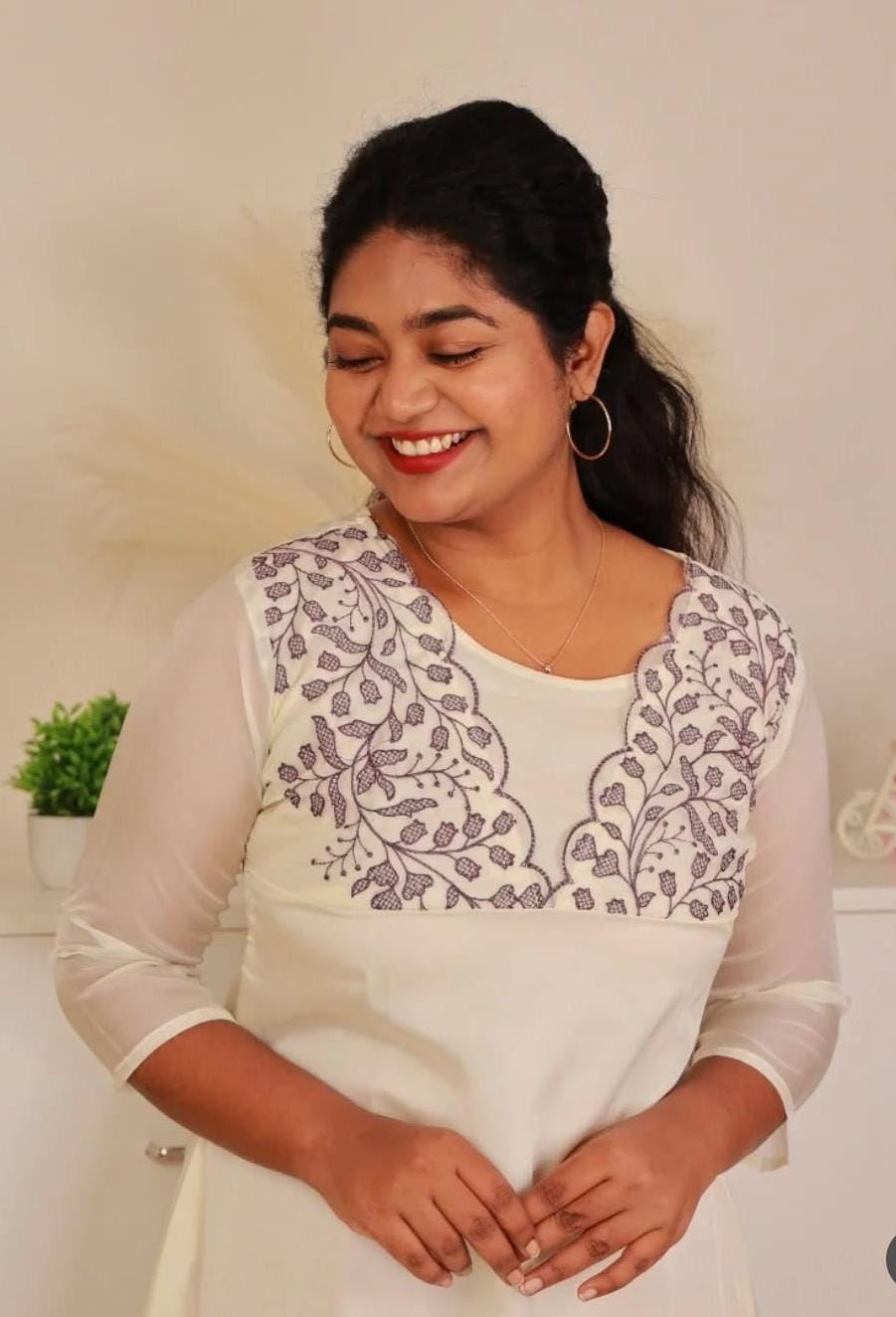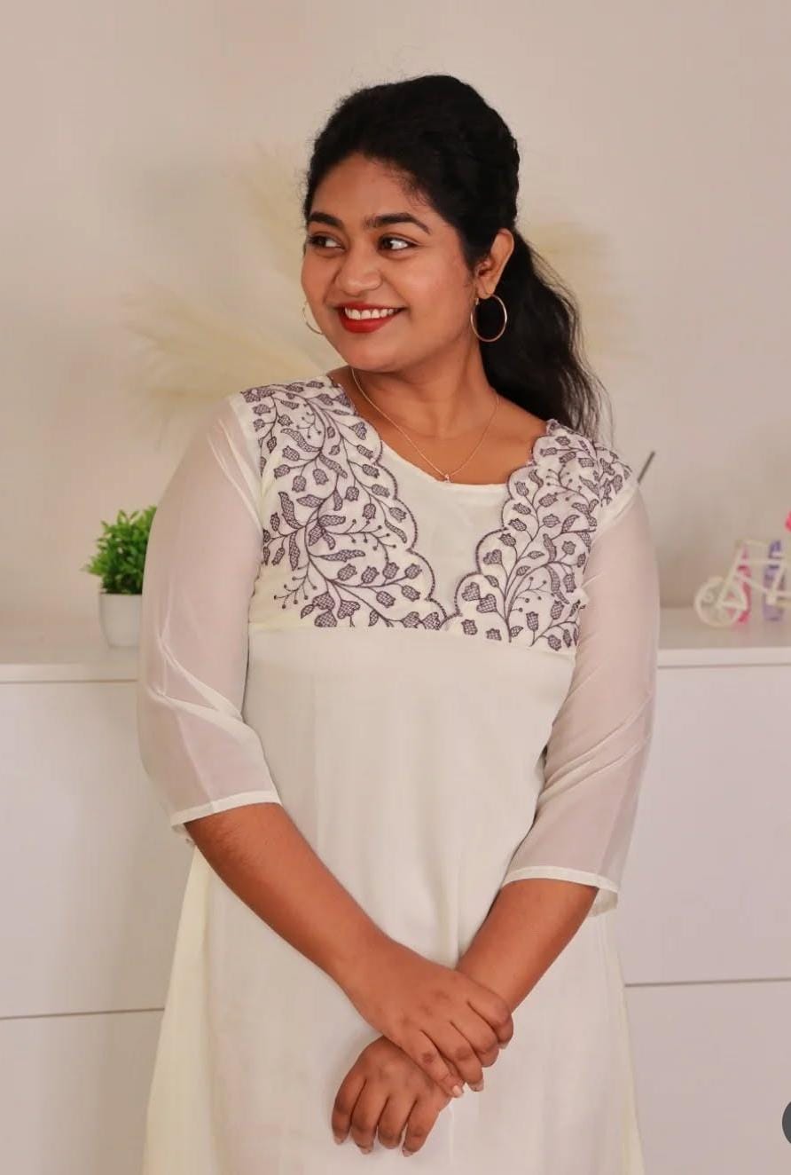 An elegant and sophisticated off-white kurti featuring a delicate design. The garment showcases intricate botanical thread embroidery in a dusty purple/grey hue on a sheer yoke, beautifully framed by a scalloped border. The same scalloped embroidery detailing is repeated along the bottom hem. It features comfortable 3/4 length sheer sleeves and a classic round neck, making it a perfect choice for semi-formal gatherings, festive events, or day-to-evening wear.