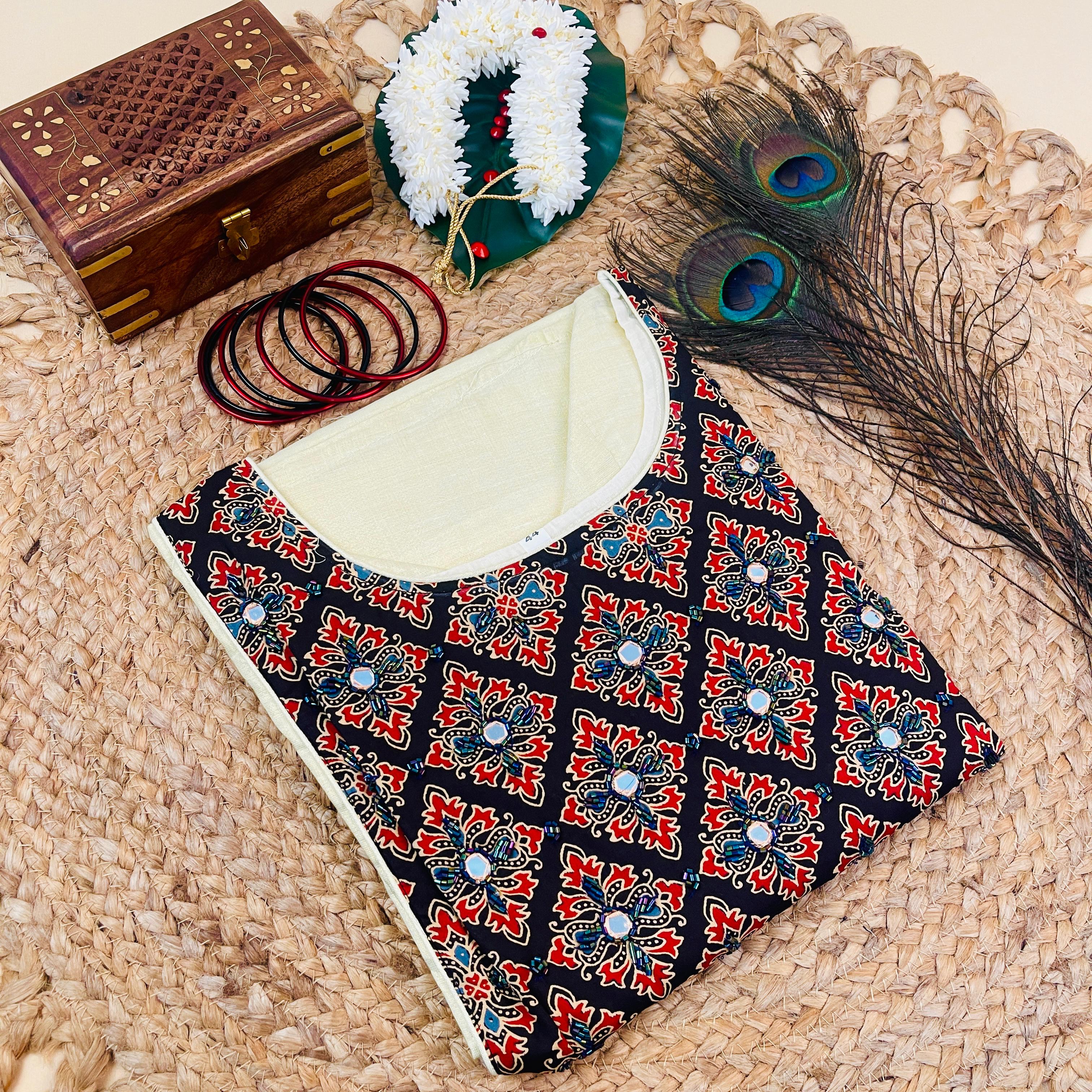 This elegant kurti features a kalamkari-printed yoke with delicate mirror work and blue cut beads, giving it a festive ethnic appeal. Crafted in a soft cream fabric with golden undertones, it's complemented with a gold border on the sleeves, making it perfect for traditional wear, festive days, or even casual temple visits.