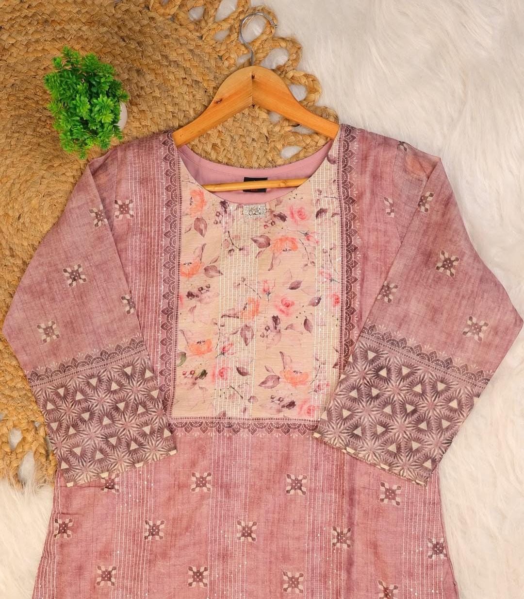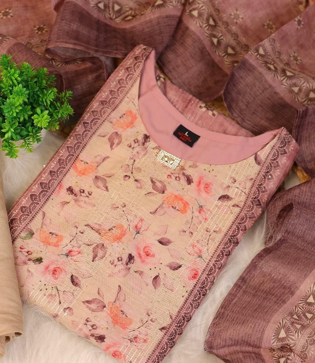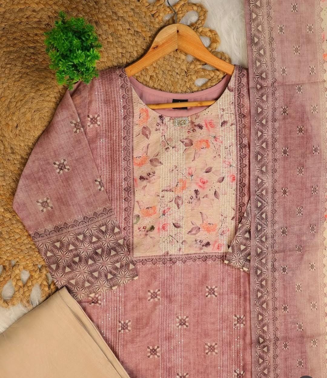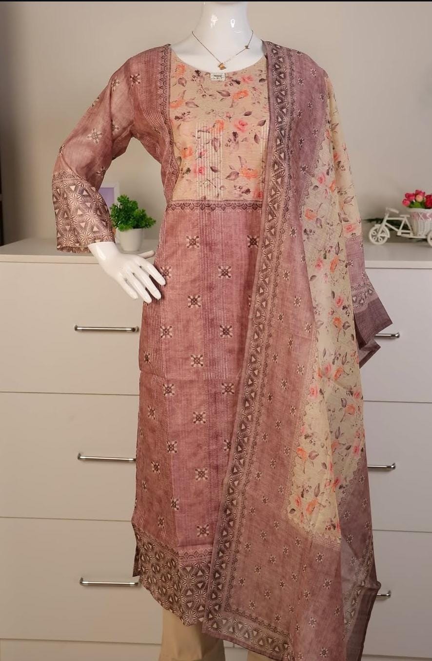 A charming three-piece suit set from Radha Raman featuring a harmonious blend of prints and colors. The kurta is uniquely paneled, showcasing a soft, digitally printed floral yoke in blush and peach tones, transitioning into a main body with a subtle geometric/scattered motif print in dusty rose/mauve. The set is completed by a matching dupatta that beautifully combines both the floral and geometric patterns on its body and borders, and an unstitched solid beige fabric for the bottom. Ideal for a sophisticated, everyday ethnic look.