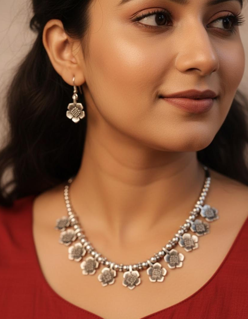 Add a touch of ethnic elegance to your style with this beautifully handcrafted oxidized silver choker necklace set. Featuring charming floral pendants and shiny bead detailing, this piece is paired with matching drop earrings for a complete boho-chic look. Ideal for casual wear, festive occasions, or indo-western outfits. Slightly vary from the original product due to lighting/ camera lens and website image compression.