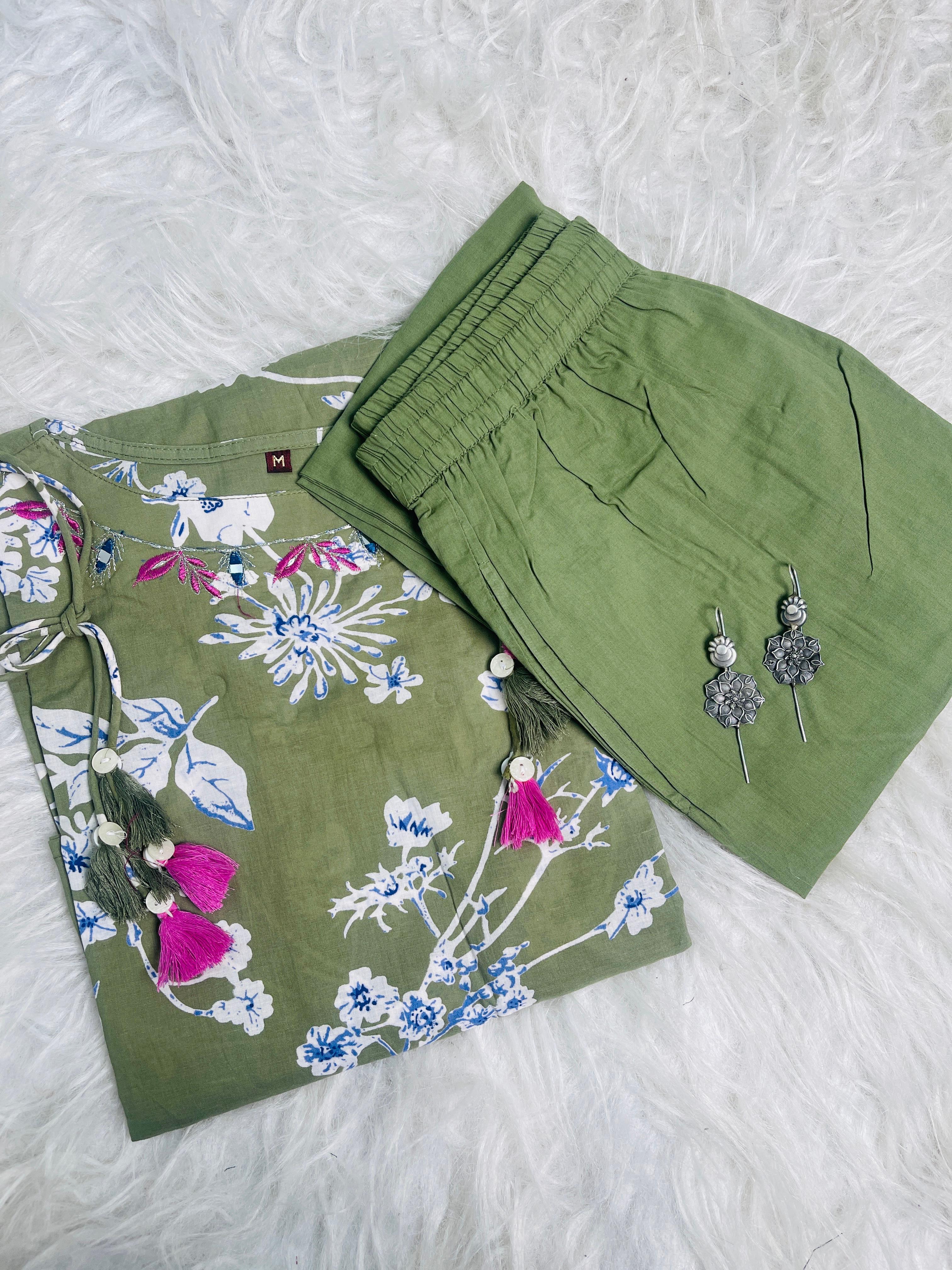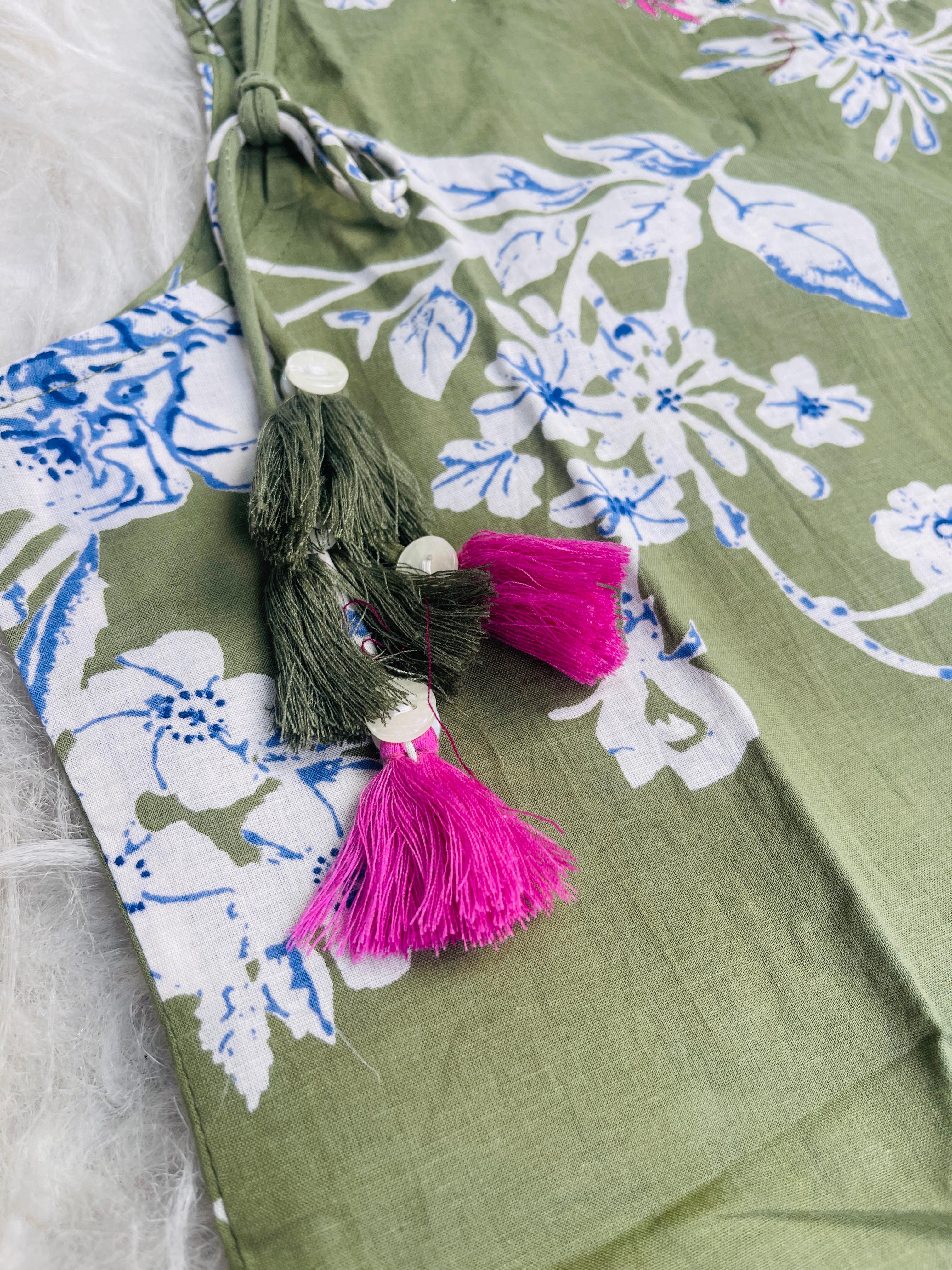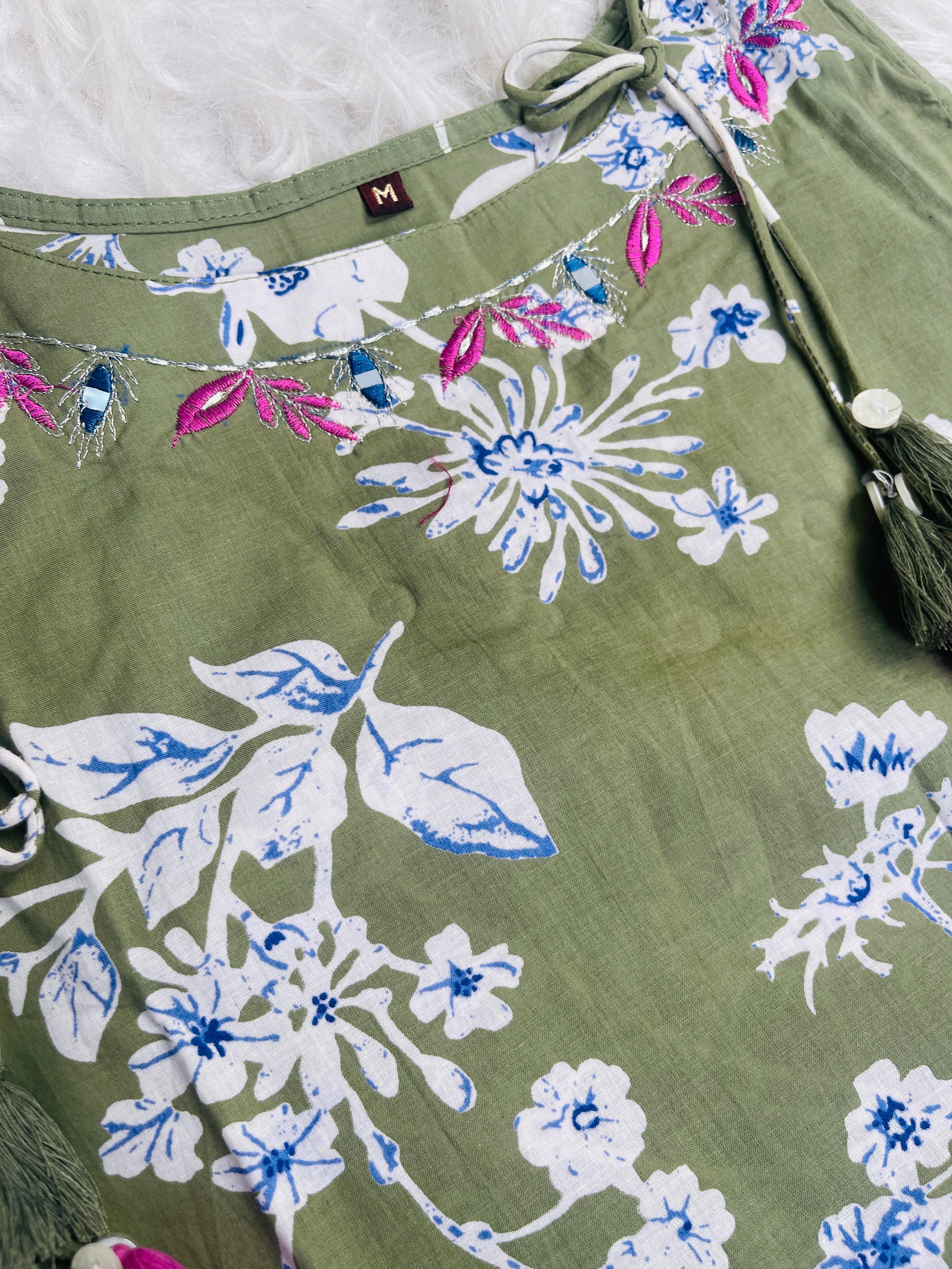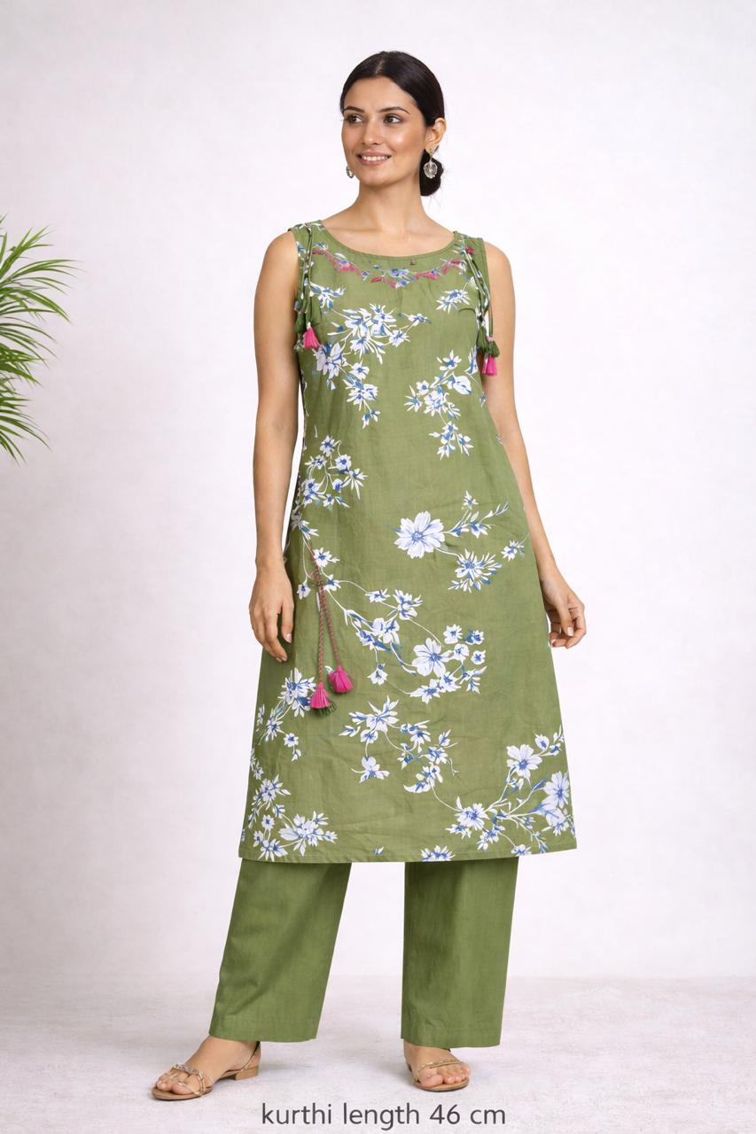Lime Green Floral Print Kurta with Embellished Neck(Sleeves attached)-SU 33