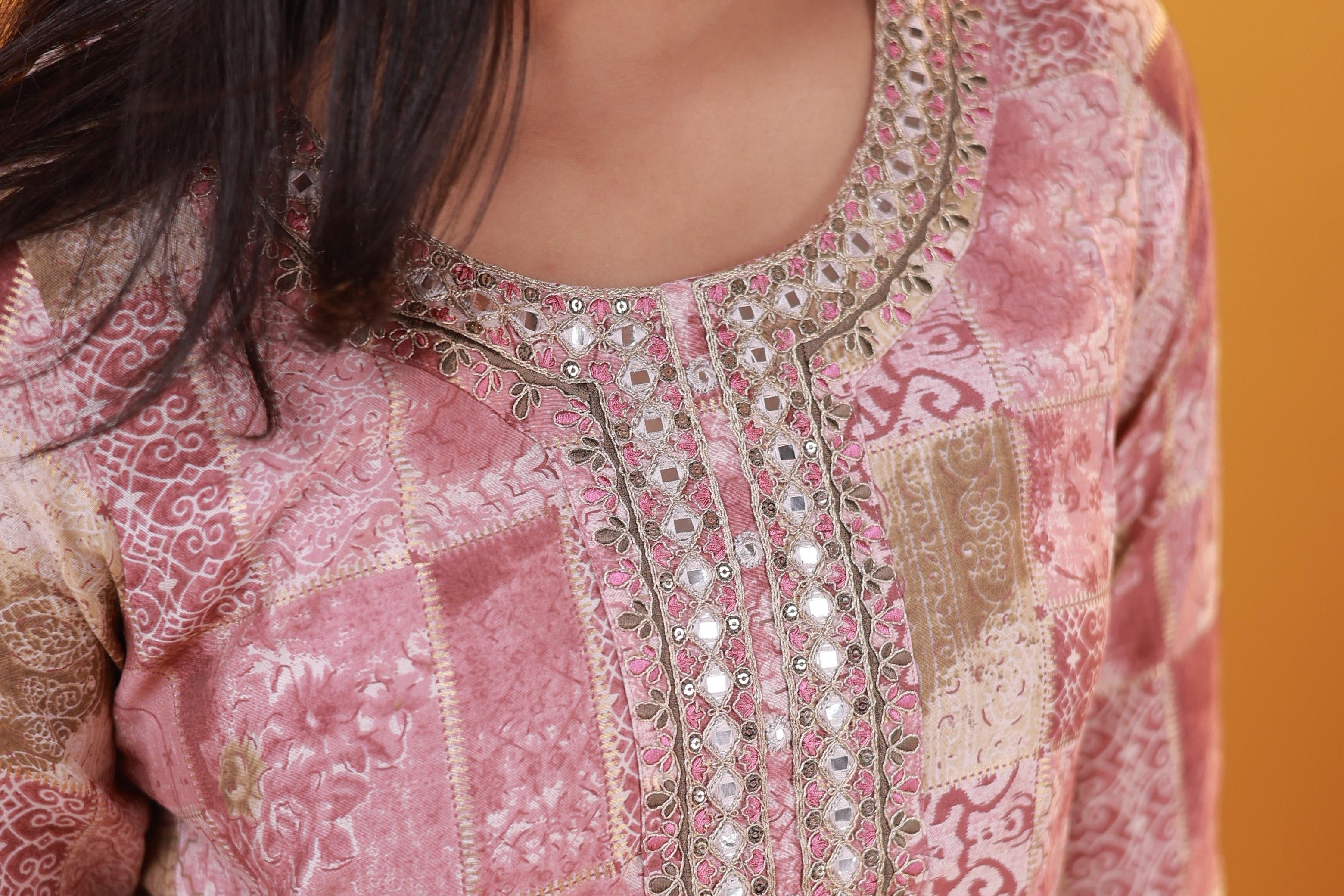 A graceful pastel pink muslin kurta set featuring a unique patchwork-style print with subtle detailing. Comes with matching pants for a complete festive yet comfortable look. Perfect for everyday wear, festive occasions, or casual gatherings.