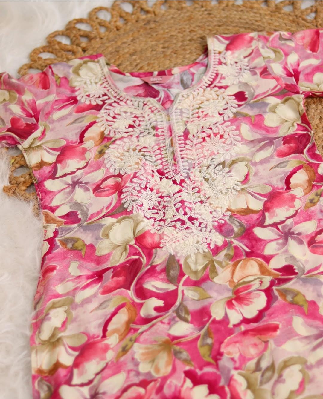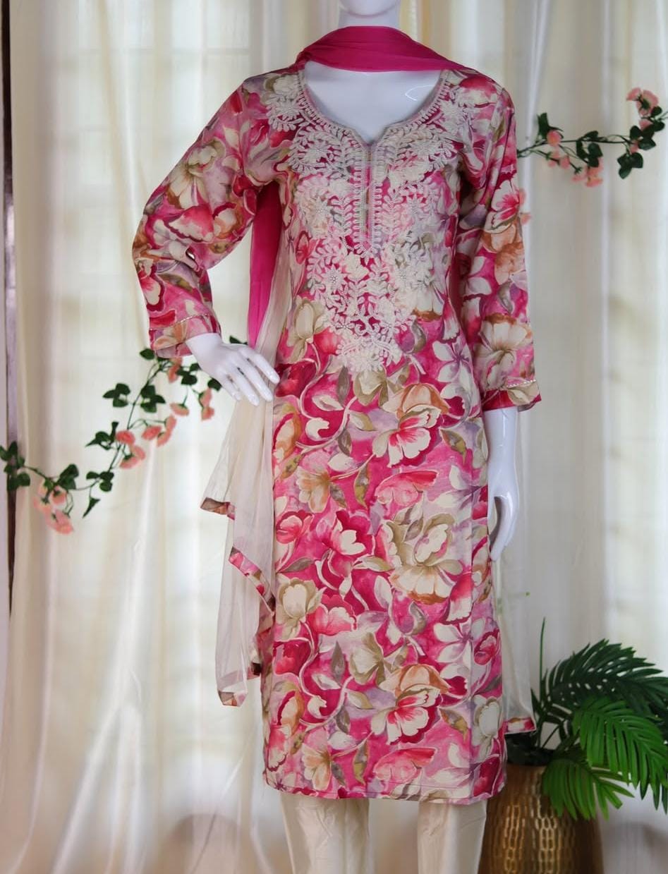 A perfect blend of grace and vibrance, this pink floral embroidered kurthi set adds elegance to your festive and casual wardrobe. The kurthi features intricate cream-colored embroidery on the neckline and chest area, beautifully complementing the multi-toned floral print. Paired with cream pants and a soft chiffon dupatta in matching shades, this outfit exudes sophistication and charm. The lightweight, breathable fabric ensures comfort throughout the day while keeping your look refined and feminine.