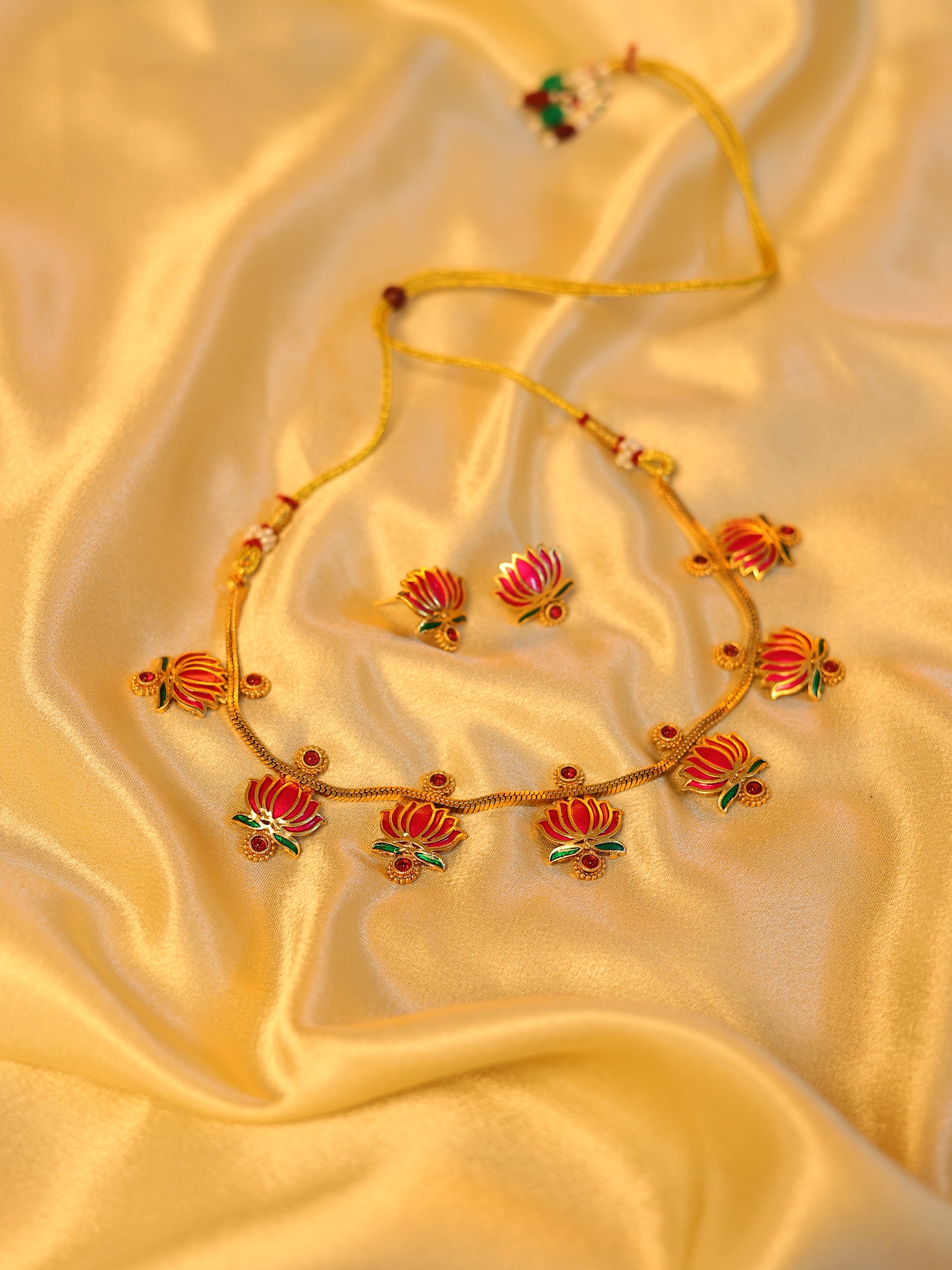 Add a touch of tradition with this elegant Lotus Motif Necklace 💚. Crafted with antique gold polish and highlighted with pink enamel lotus charms, this necklace is perfect for temple visits, festive occasions, and cultural celebrations. Its lightweight design makes it easy to wear all day while still making a statement.