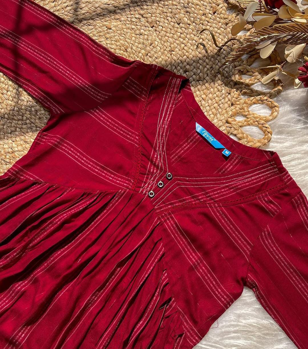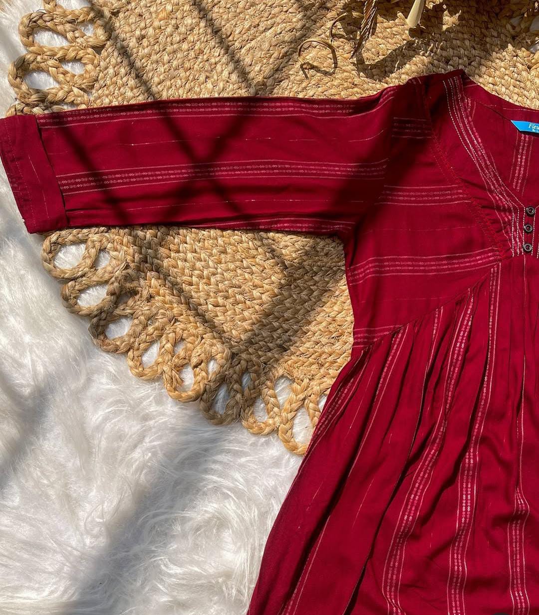 This elegant maroon kurthi is crafted from soft, breathable cotton fabric featuring subtle thread-line patterns that add a touch of sophistication. The design includes a beautifully pleated front panel with contrast stitch detailing and small metallic buttons at the neckline, enhancing its ethnic charm. The comfortable half sleeves and flared silhouette make it a perfect choice for everyday wear or semi-casual occasions.