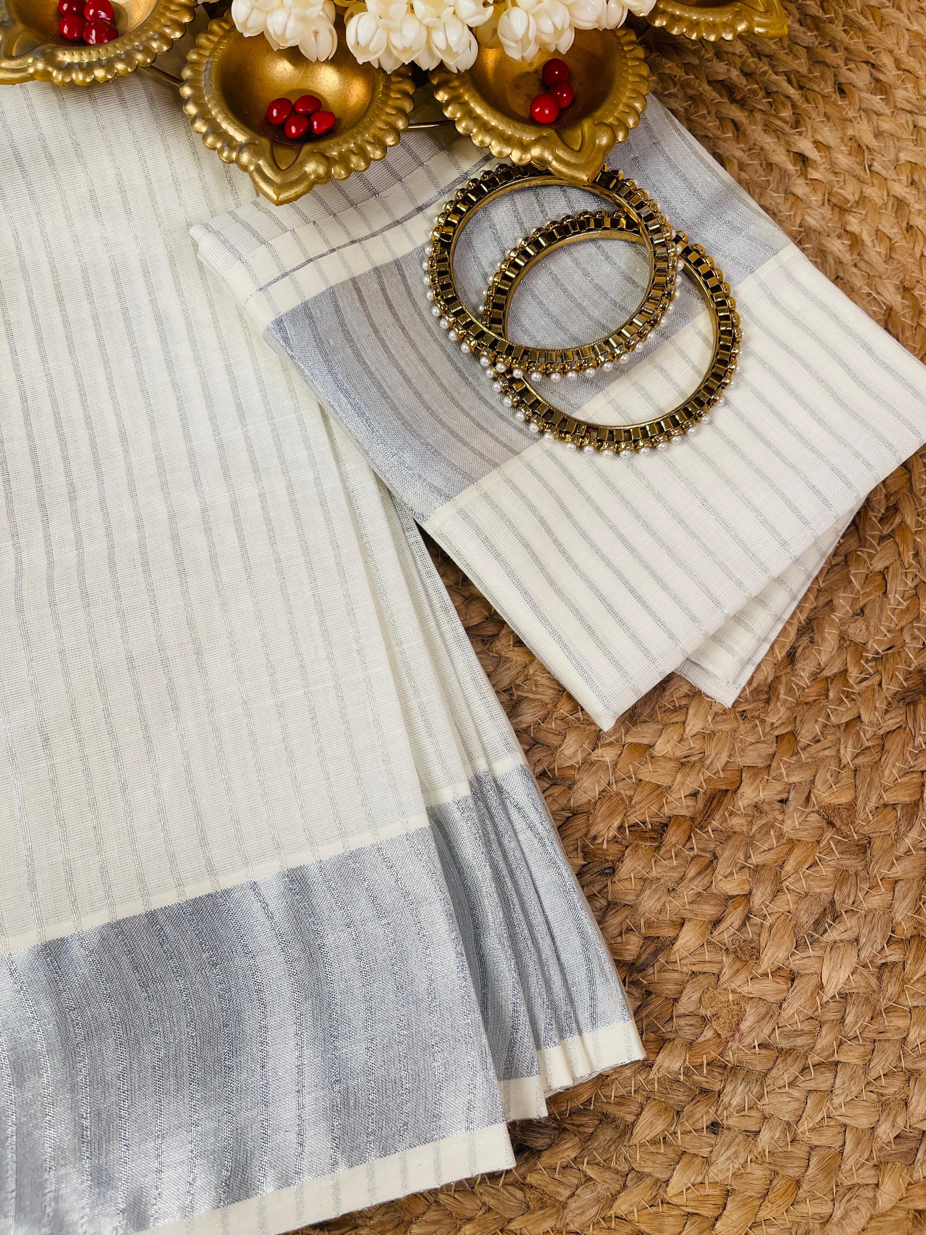 Ready to wear silver border tissue saree with stripes. Blouse piece available. Suitable for wearing in festive season,Temple visit,Traditional wear etc
