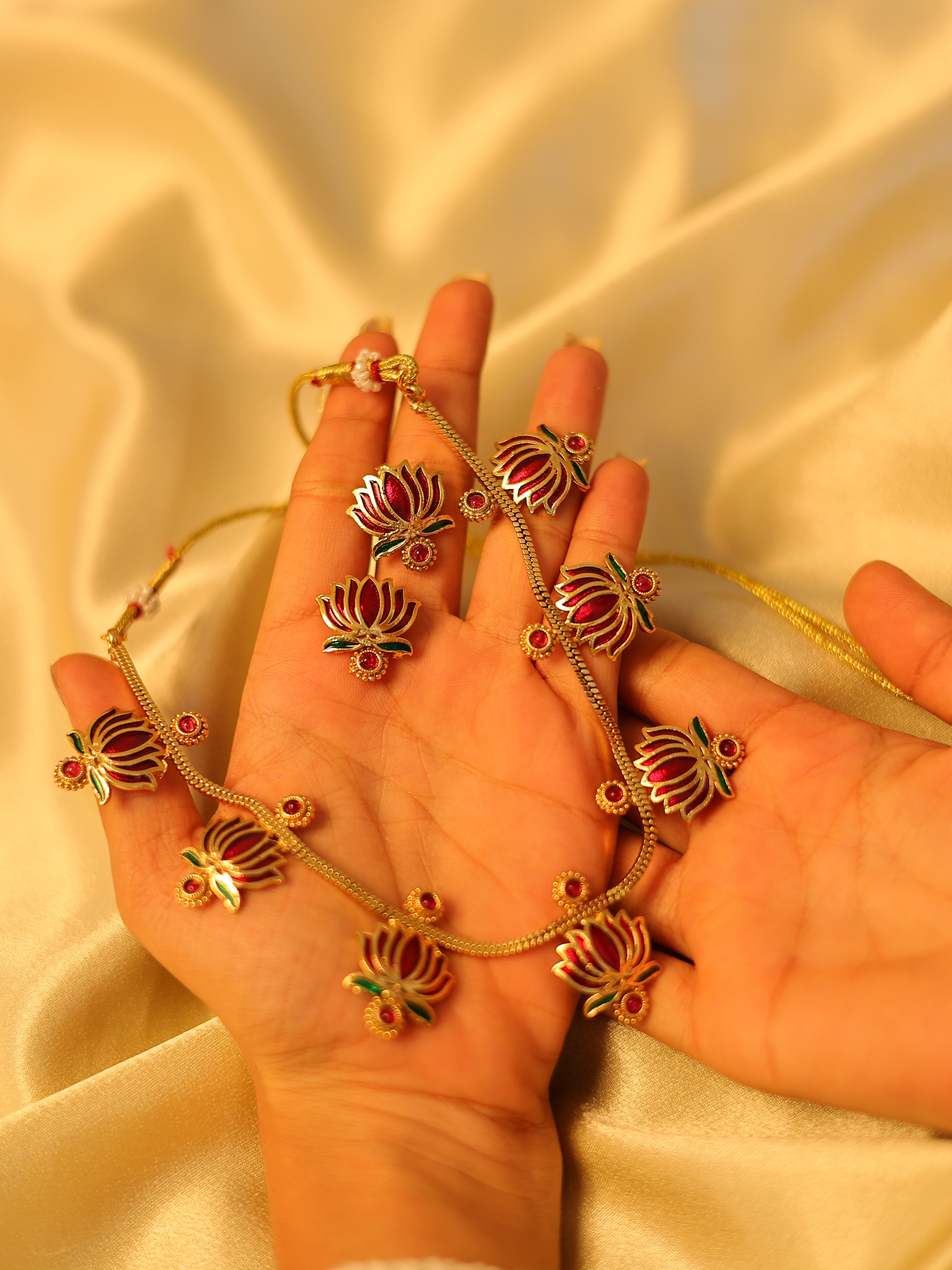 Add a touch of tradition with this elegant Lotus Motif Necklace 💚. Crafted with antique gold polish and highlighted with green enamel lotus charms, this necklace is perfect for temple visits, festive occasions, and cultural celebrations. Its lightweight design makes it easy to wear all day while still making a statement.