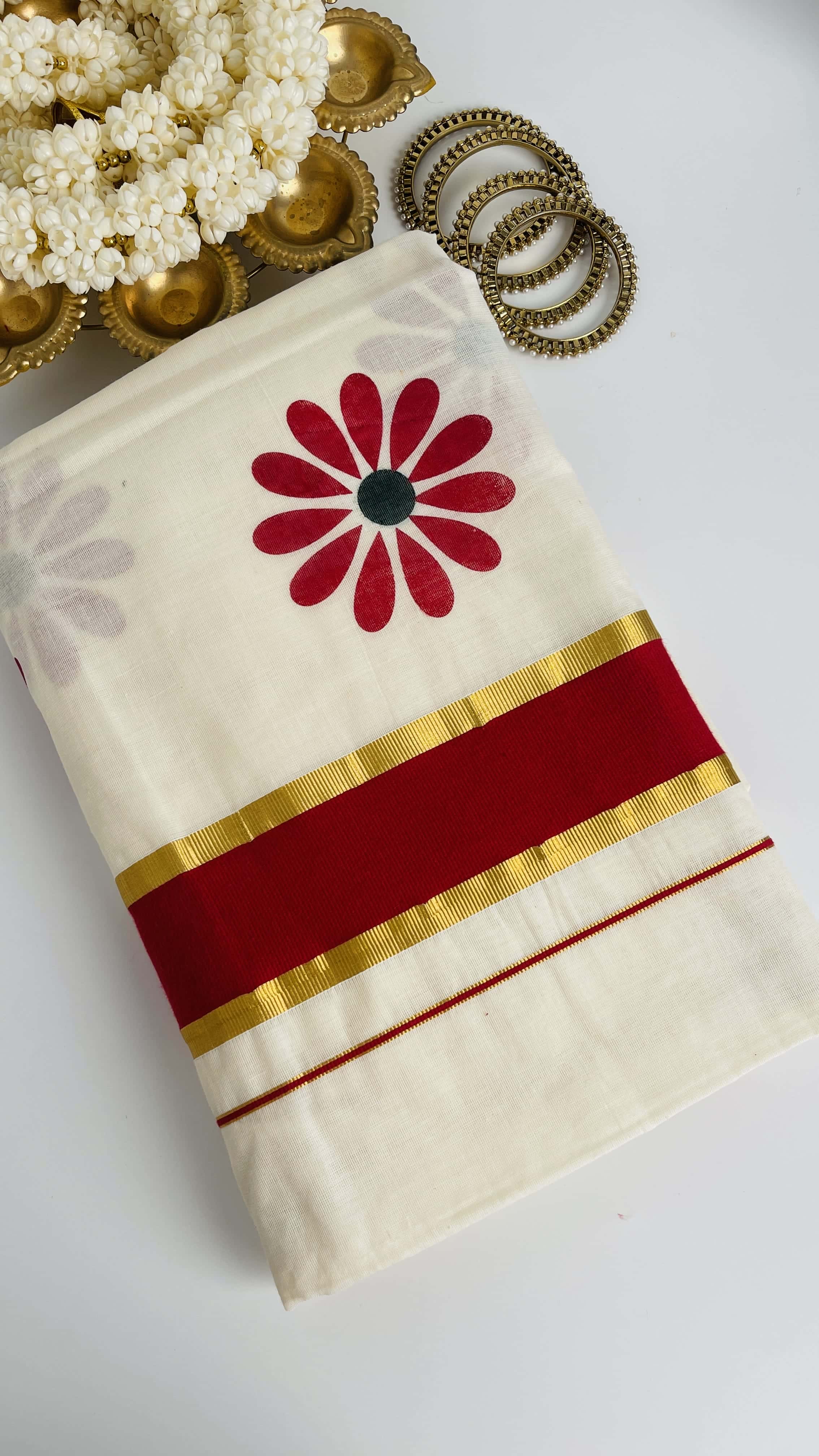 Cotton saree with red floral hand paint & red Kara with plain blouse piece