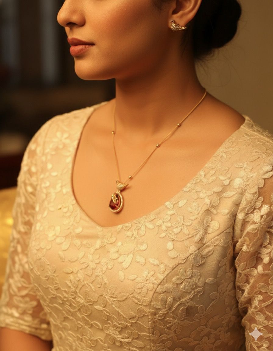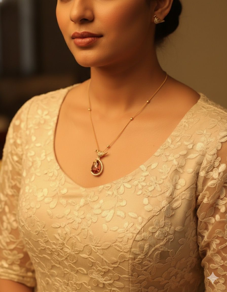 A stunning bird design pendant necklace featuring a deep red teardrop stone gracefully held by a golden bird motif. The intricate detailing around the pendant, along with the sparkling accents, gives it a royal and artistic touch. The lightweight gold-finish chain adds elegance, making it perfect for both traditional and modern outfits.