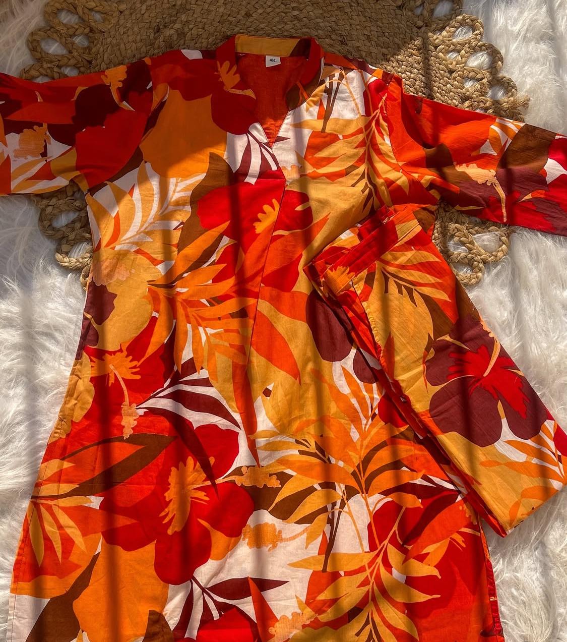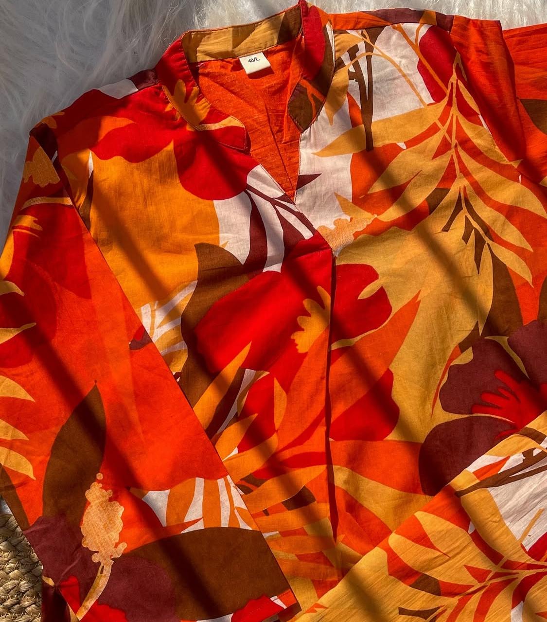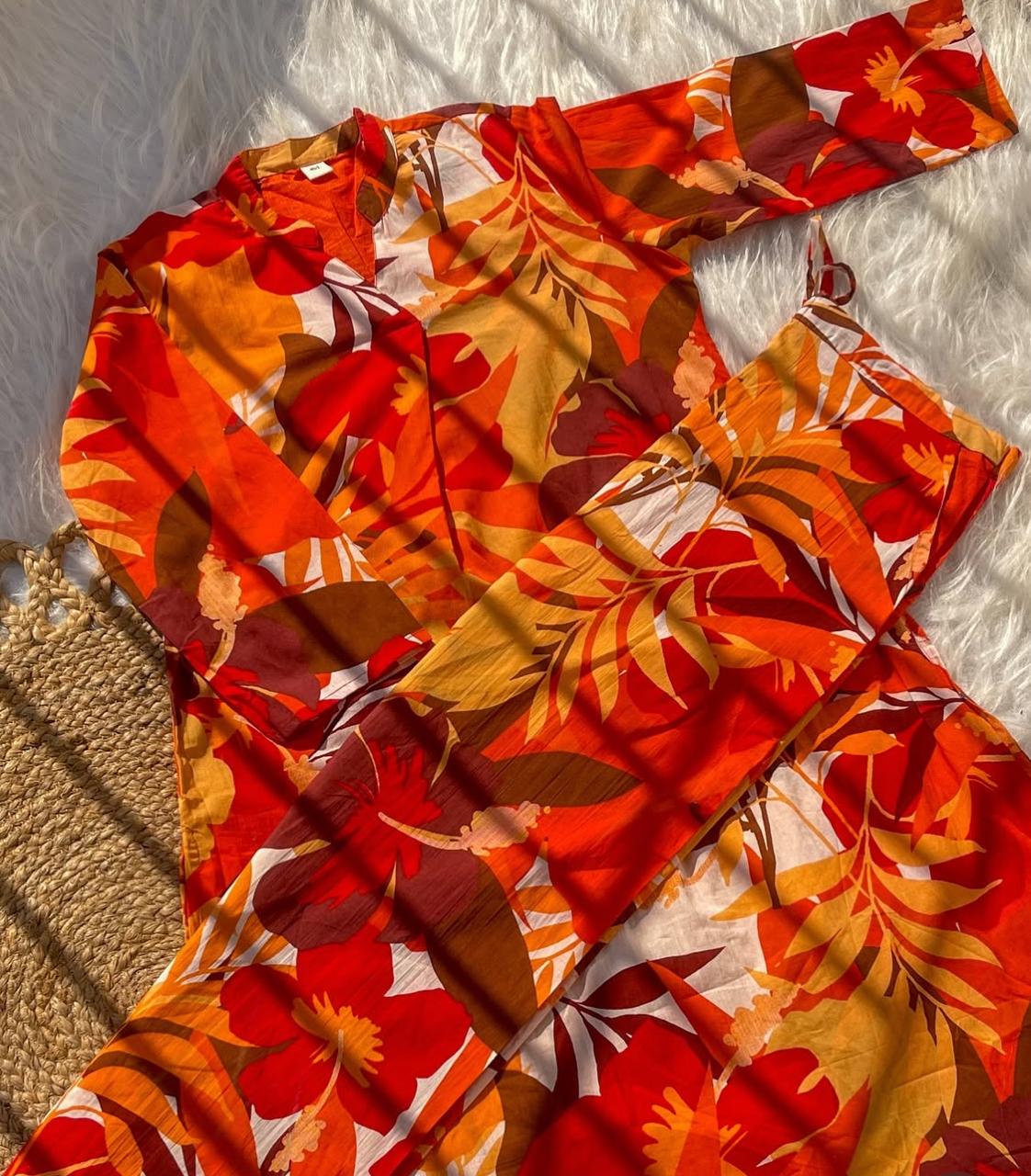 Brighten up your day with this vibrant tropical co-ord set featuring a bold floral print in shades of orange, red, and mustard. Crafted from soft, breathable cotton fabric, this set combines comfort with eye-catching style. The top features a Collar neckline and full sleeves, while the matching straight-fit pants create a coordinated and effortlessly chic look. Perfect for casual outings, brunches, or vacation wear, this set brings a splash of sunshine to your wardrobe.