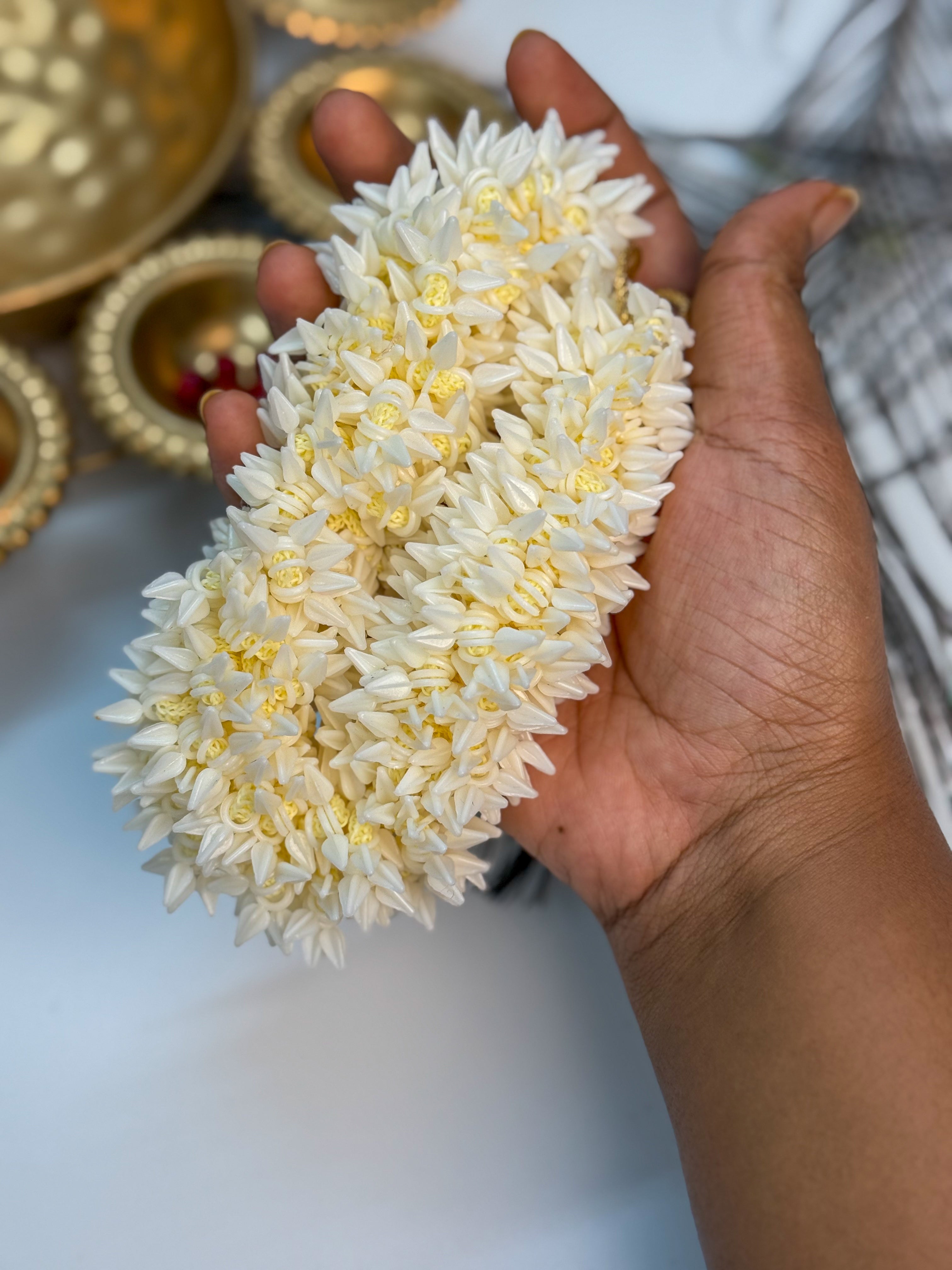Traditional short jasmine hair string designed to look and feel like fresh jasmine with a mild fragrance. Perfect for adorning braids, buns, or side hairstyles during weddings, temple visits, Onam, and festive occasions.