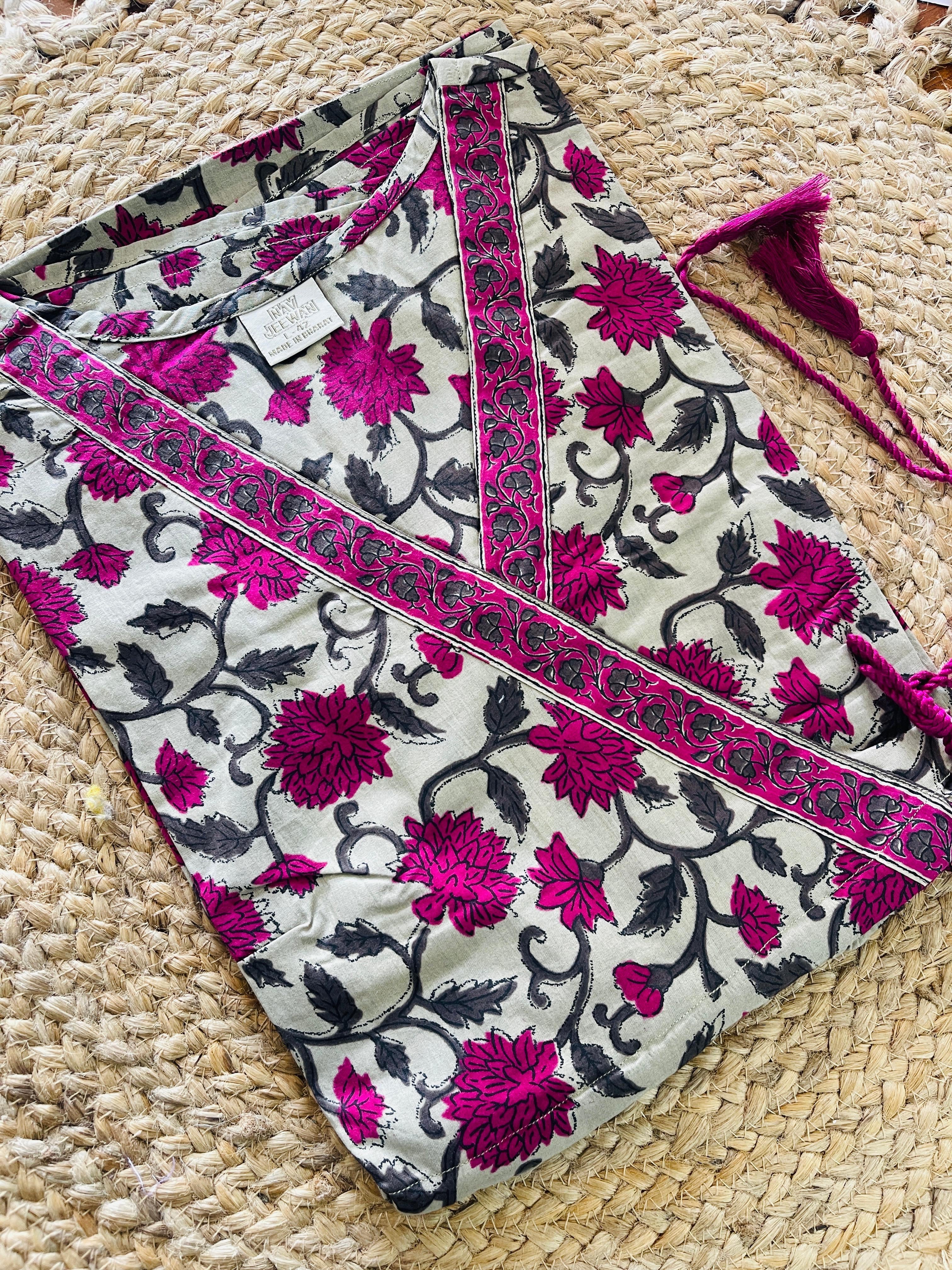 Cream and Rose floral short kurthi. This garment (likely a full suit or Anarkali top) features a traditional Angrakha-style V-neck bodice with side-tie strings finished with deep magenta tassels. The fabric has a large, all-over handblock floral print with vibrant magenta flowers and dark grey/black leaves on a cream/off-white base. The neckline and border feature a contrasting magenta print trim.