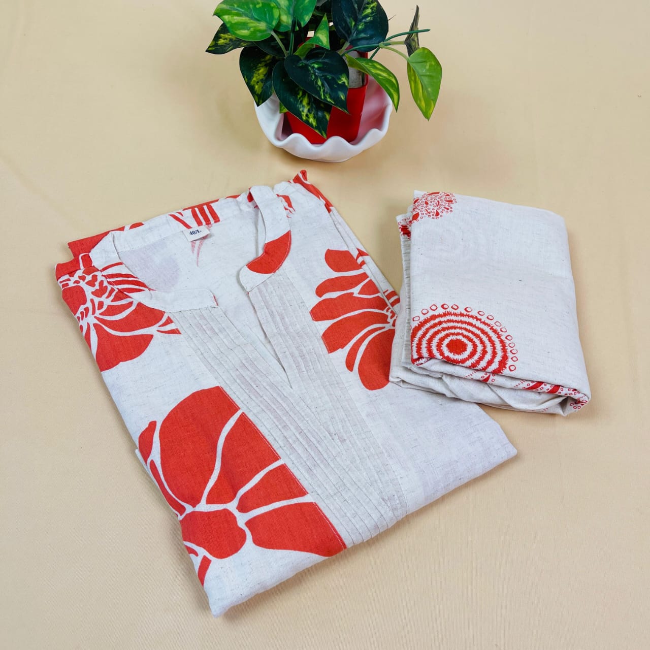 This is a stylish and breathable women's Co-ord set crafted from soft, pure cotton fabric, offering a comfortable and elegant look for everyday wear. The kurta features a crisp white base adorned with bold, oversized orange floral prints, giving it a vibrant and eye-catching aesthetic.